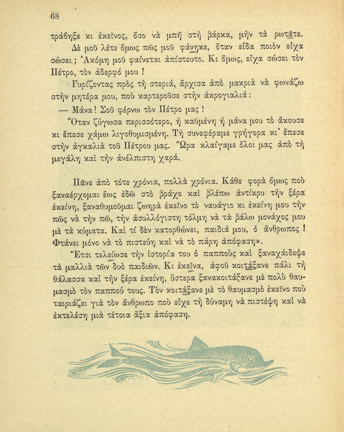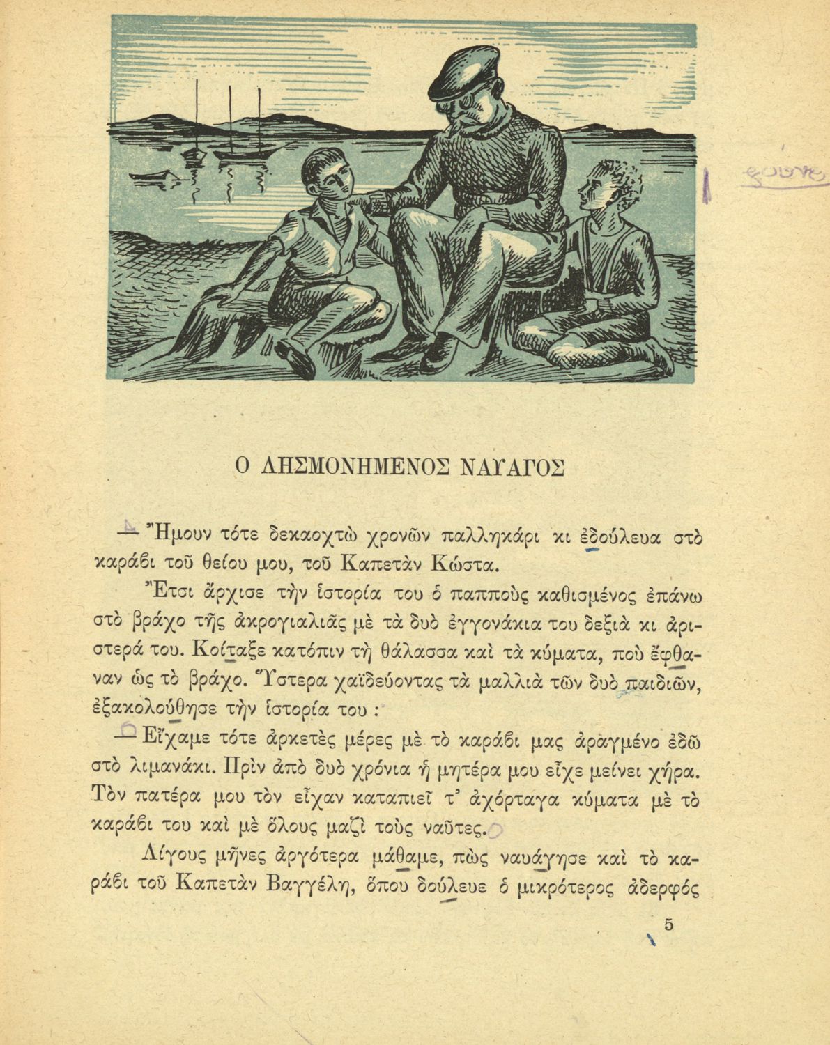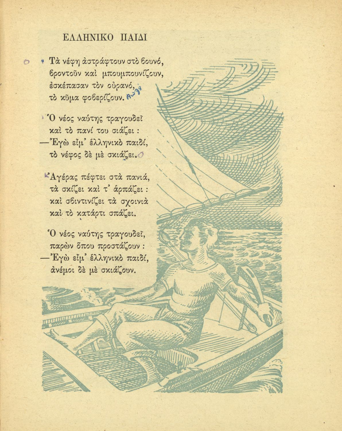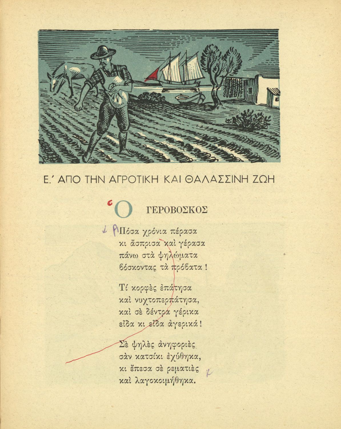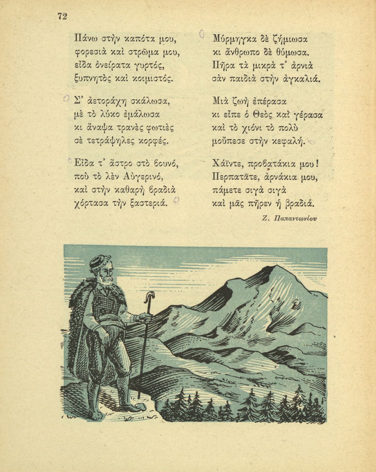 Αναγνωστικό Δ΄ Δημοτικού που περιέχει πεζά και ποιήματα εμπνευσμένα από την ελληνική ιστορία και μυθολογία, την κοινωνική ζωή και την ελληνική φύση.