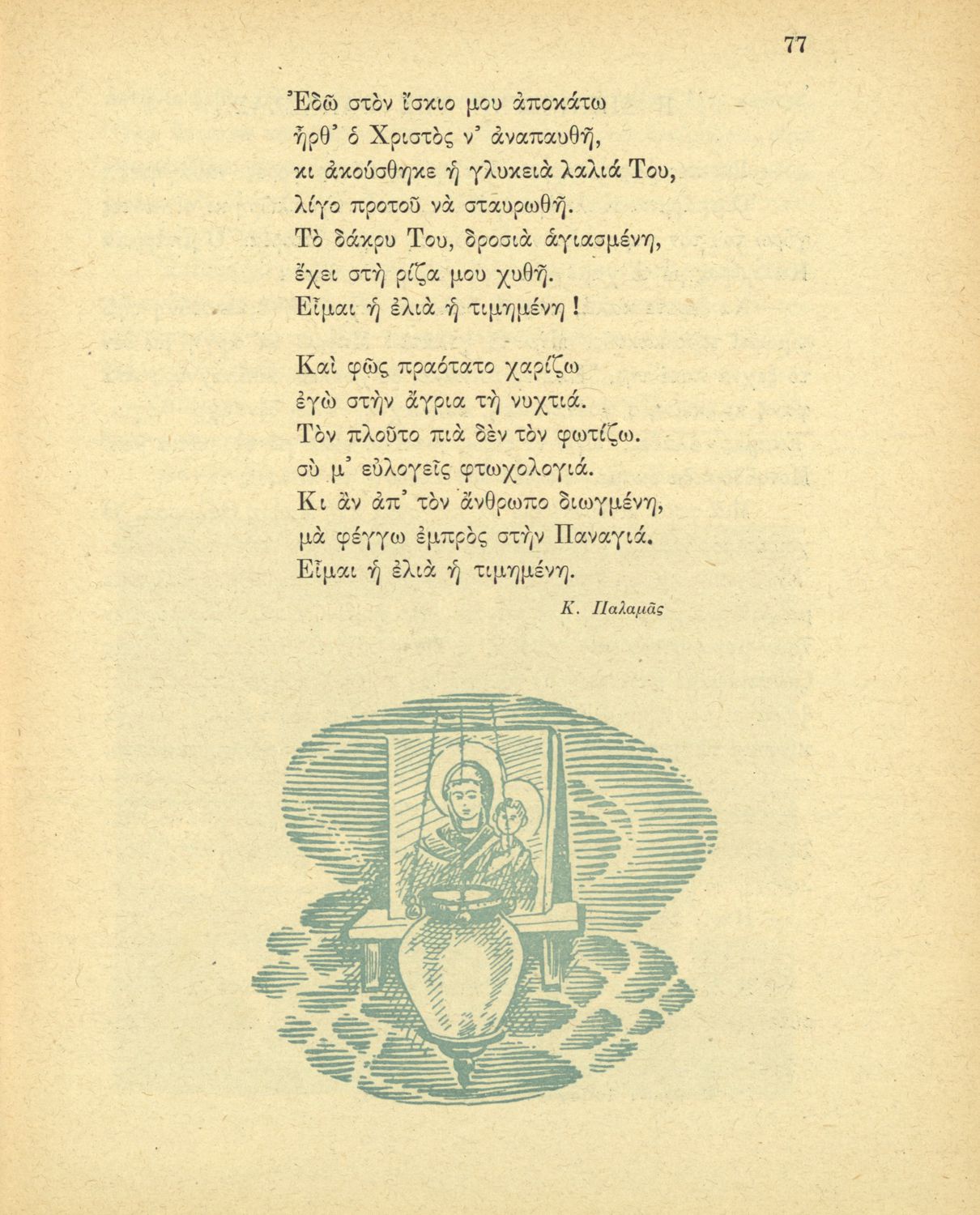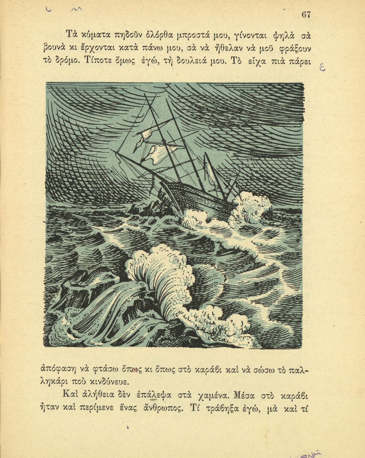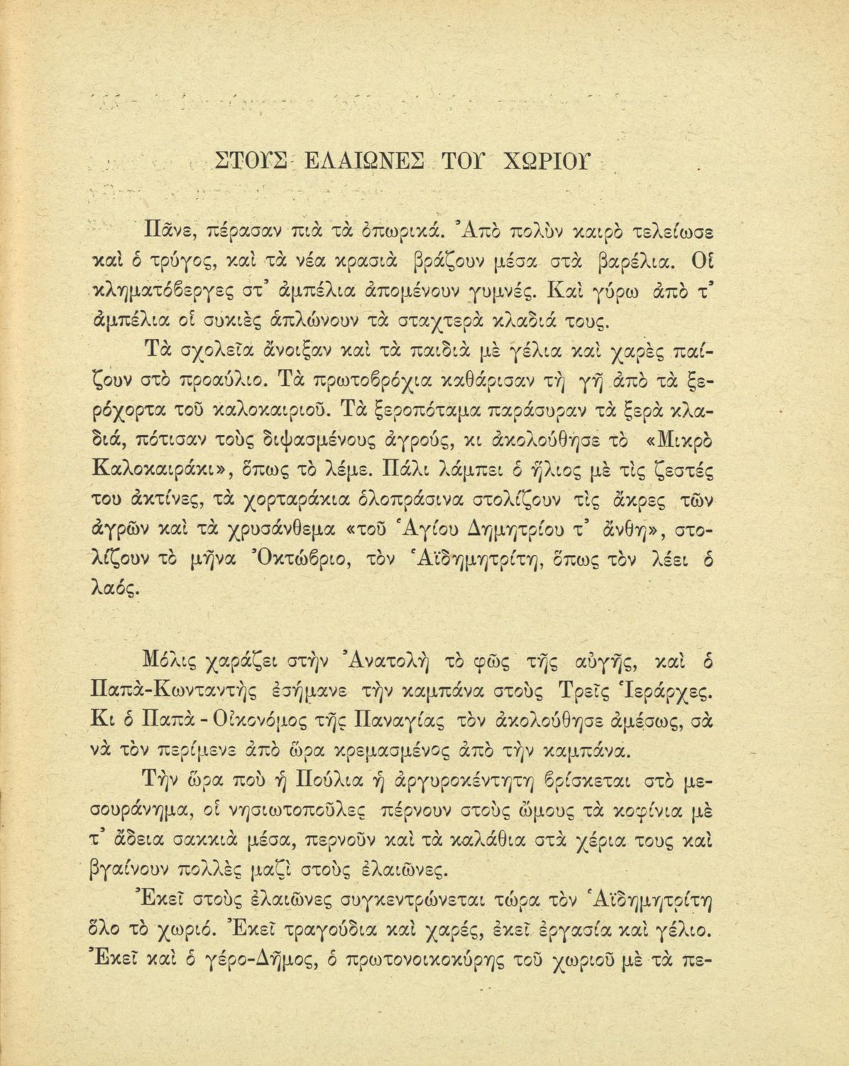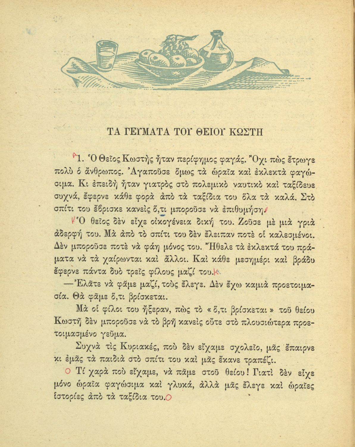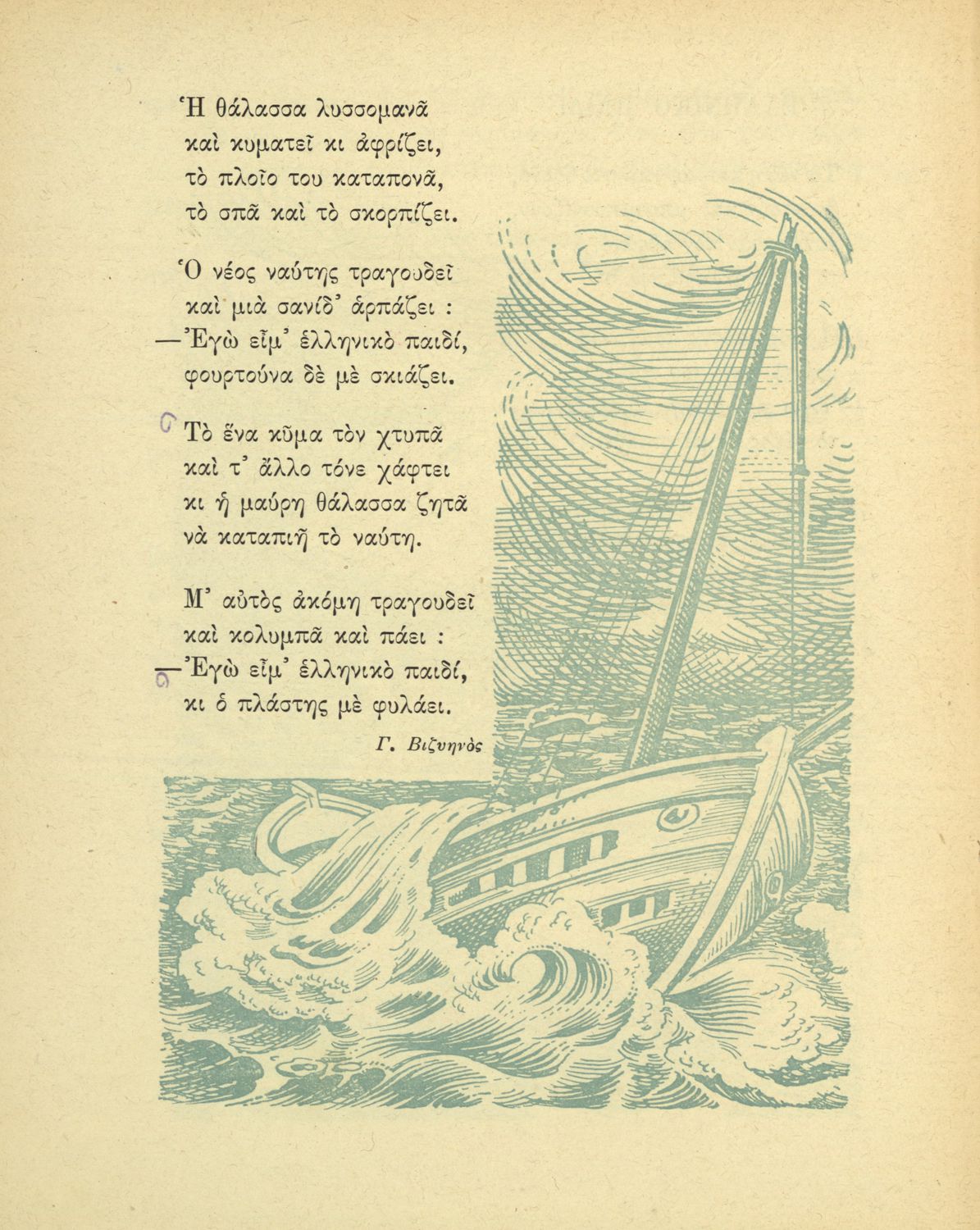 Αναγνωστικό Δ΄ Δημοτικού που περιέχει πεζά και ποιήματα εμπνευσμένα από την ελληνική ιστορία και μυθολογία, την κοινωνική ζωή και την ελληνική φύση.