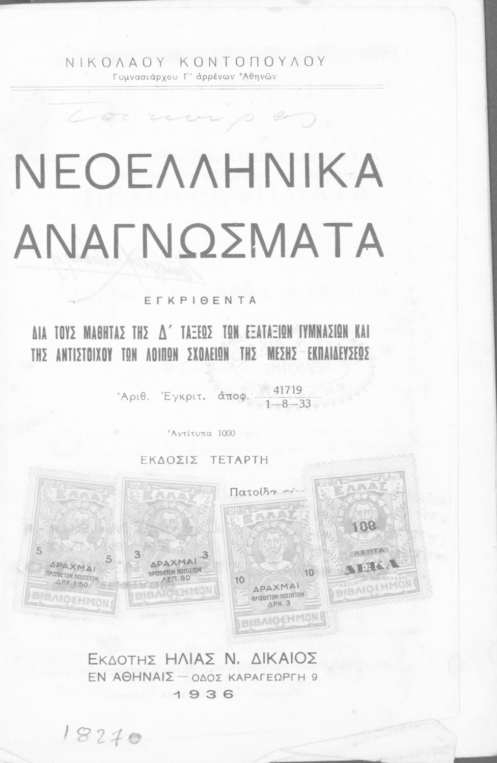 Τίτλος: Νεοελληνικά αναγνώσματα διά τους μαθητάς της Δ΄ τάξεως των Εξαταξίων Γυμνασίων και της αντιστοίχου των λοιπών της Μέσης Εκπαιδεύσεως