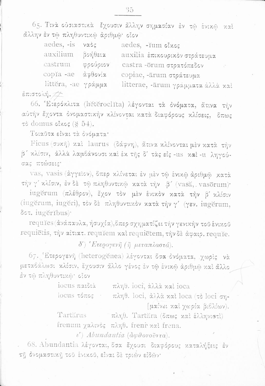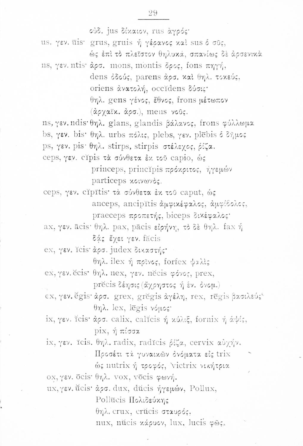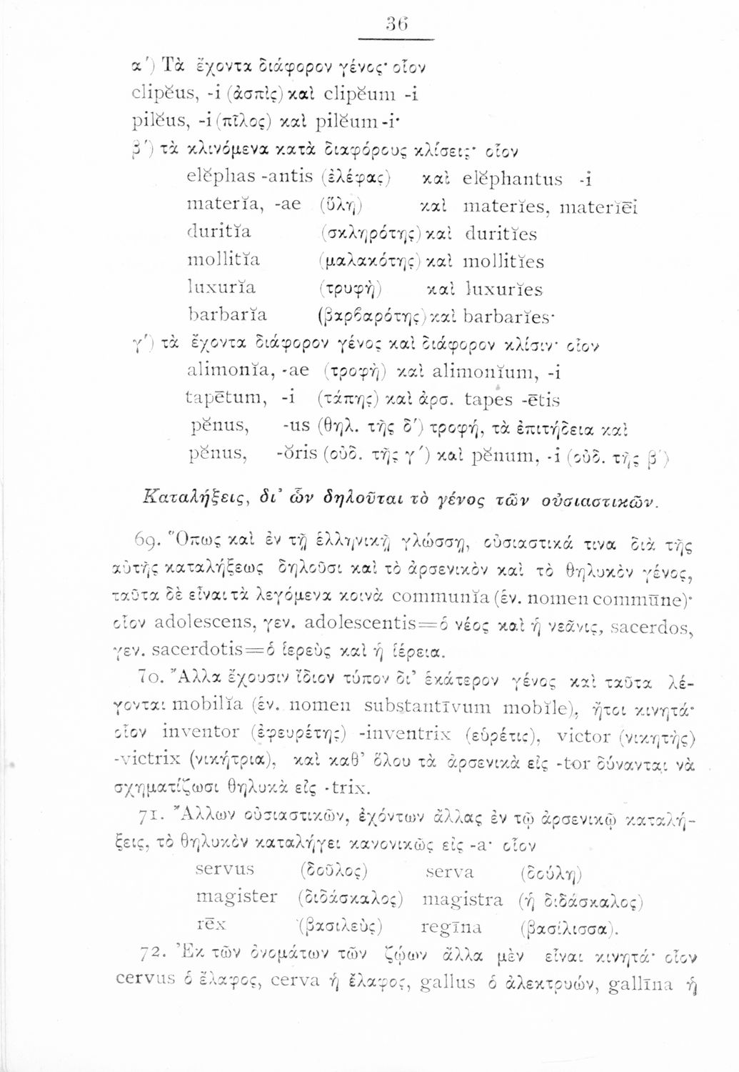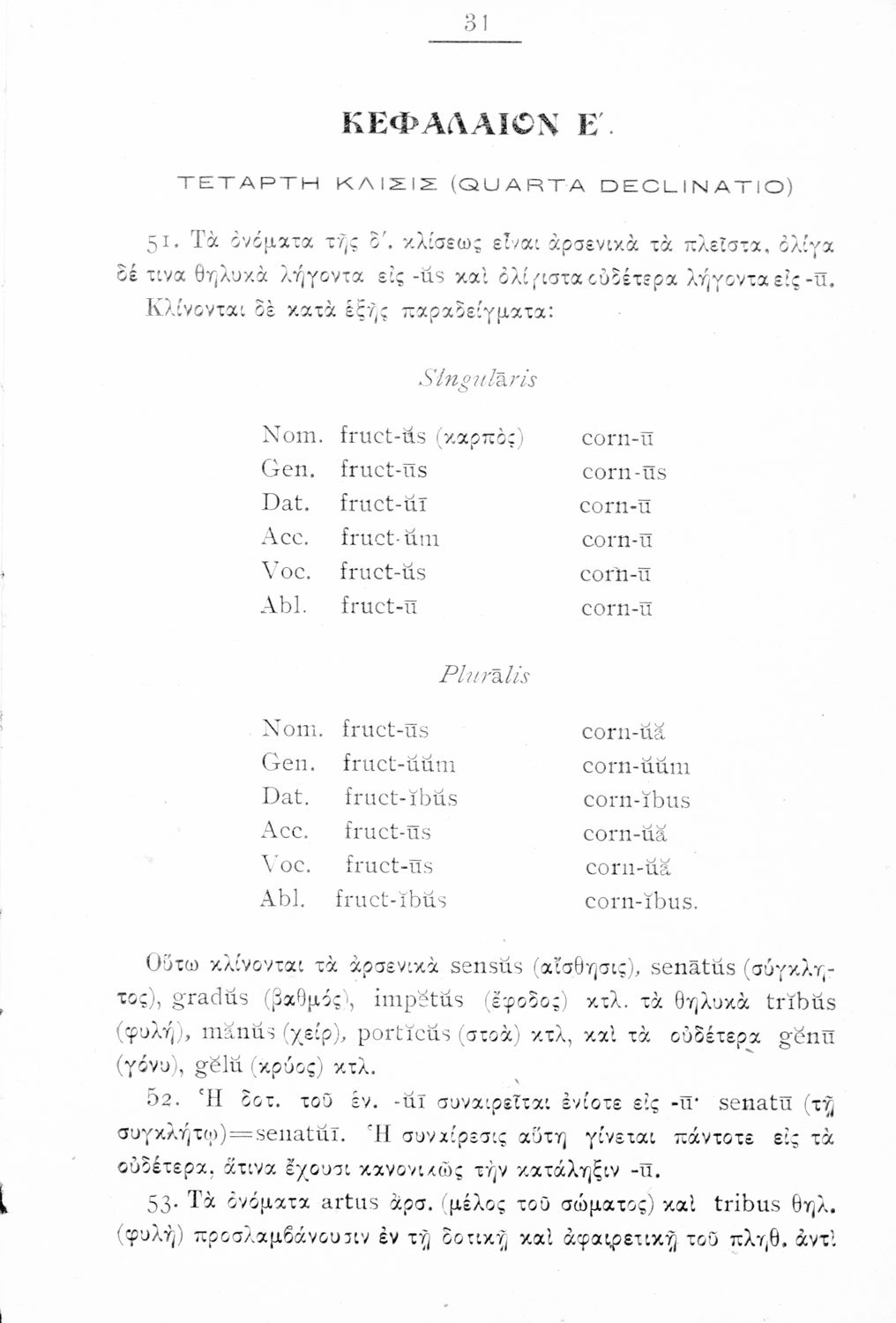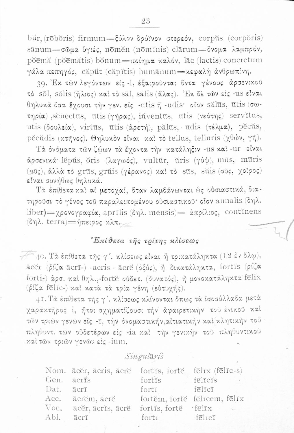 Σχολικό εγχειρίδιο Λατινικών που περιλαμβάνει τη γραμματική της λατινικής και είναι χωρισμένο στο τεχνολογικό, το τυπολογικό και το ετυμολογικό μέρος.
