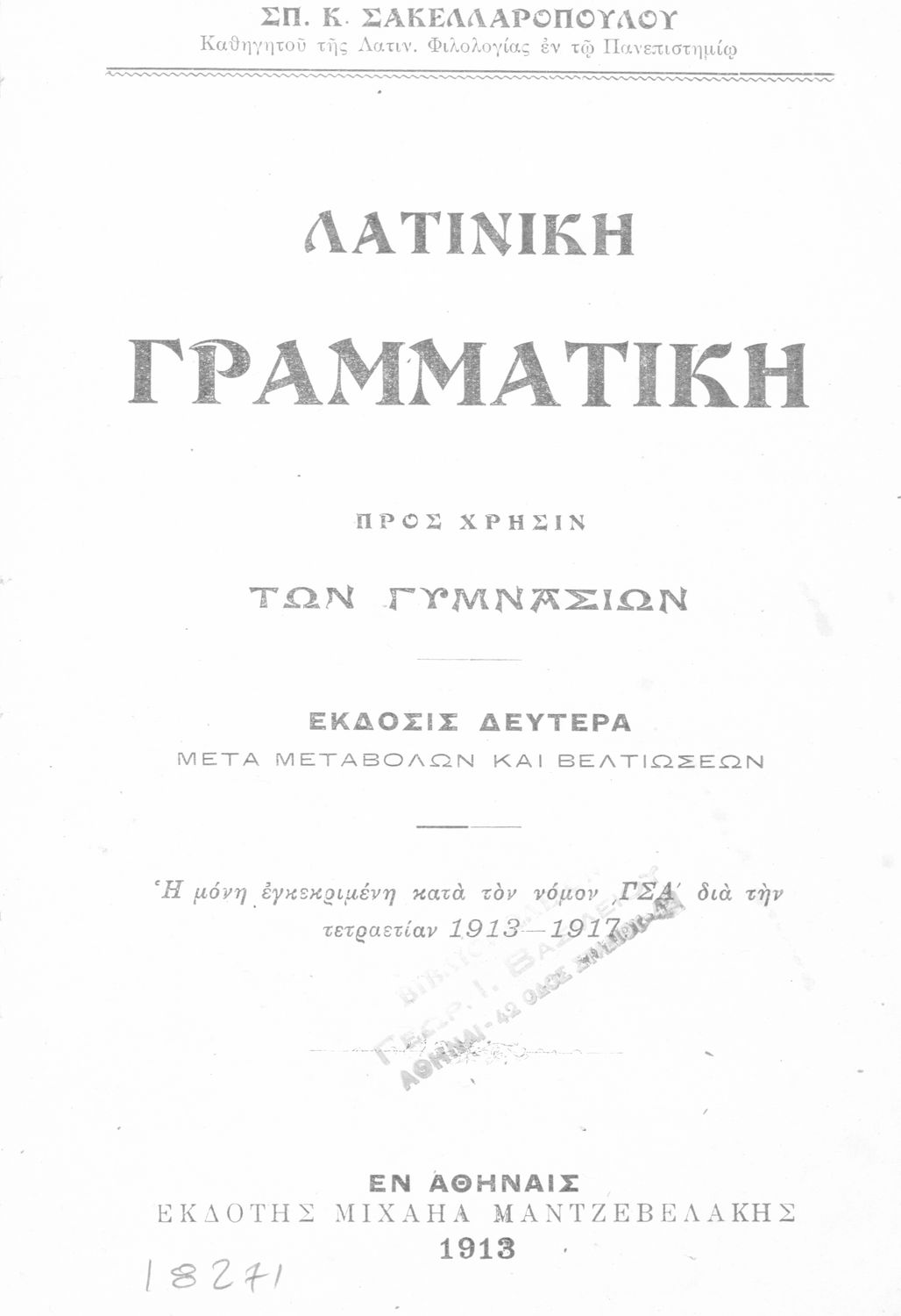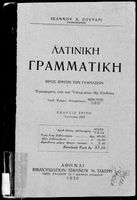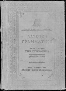 Γραμματικής της λατινικής γλώσσας για τα Ελληνικά Σχολεία και Γυμνάσια που περιέχει δύο τμήματα: το τεχνολογικό που εστιάζει στα μέρη του λόγου και το συντακτικό που ασχολείται με τις πτώσεις, τις εγκλίσεις, ...
