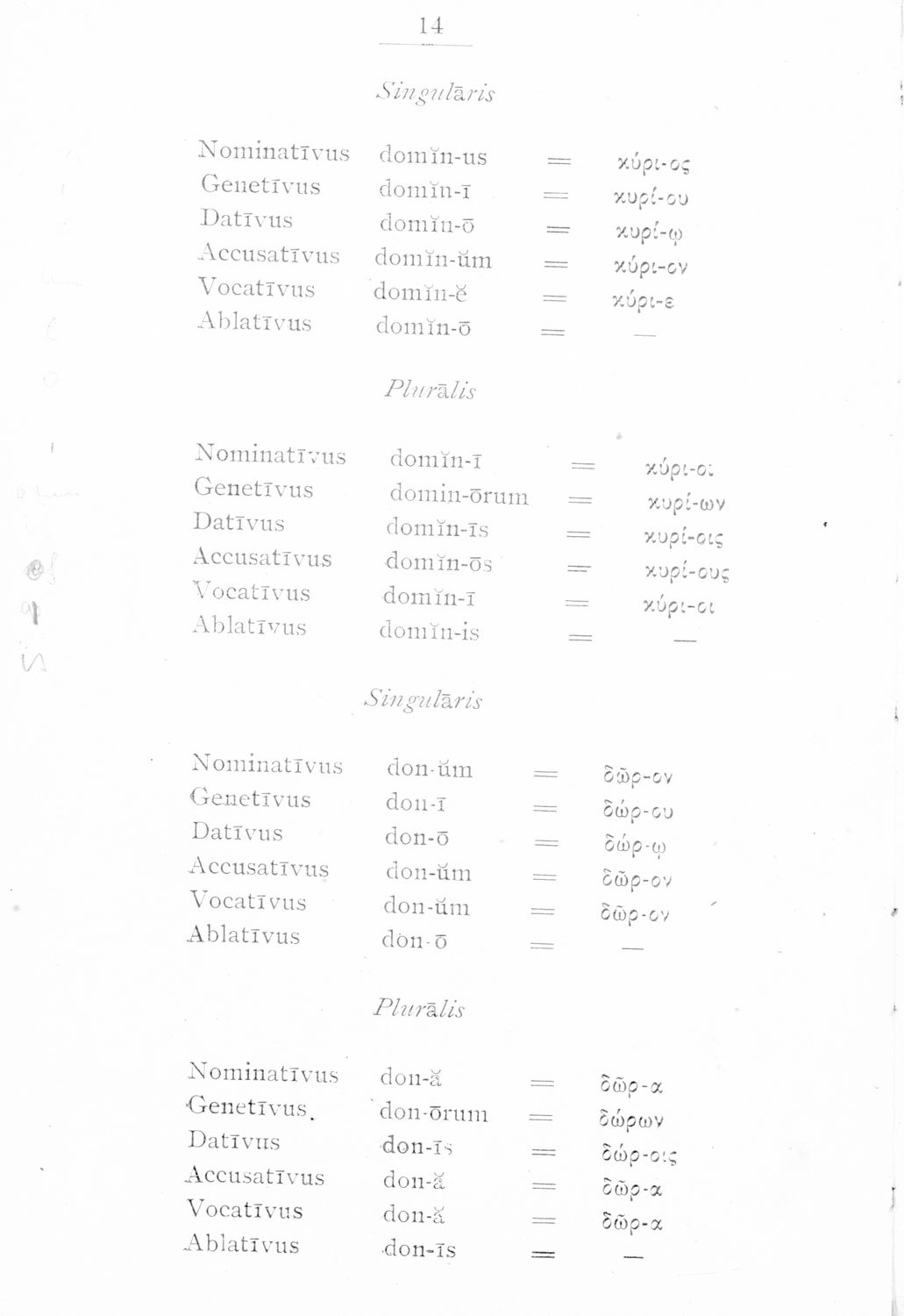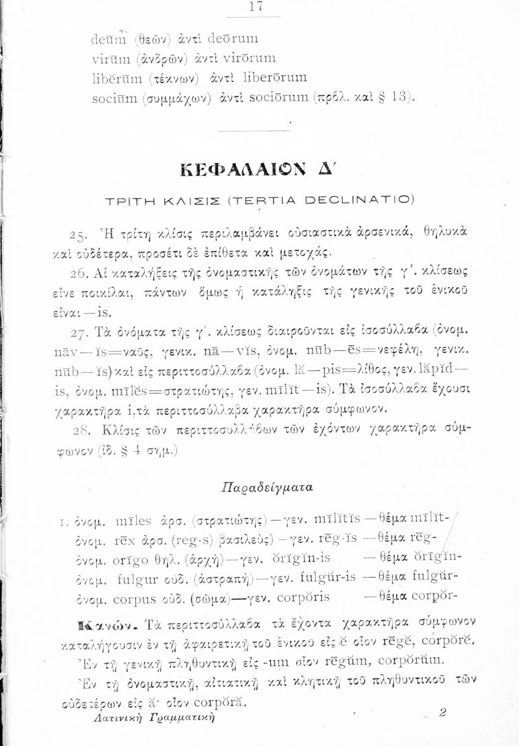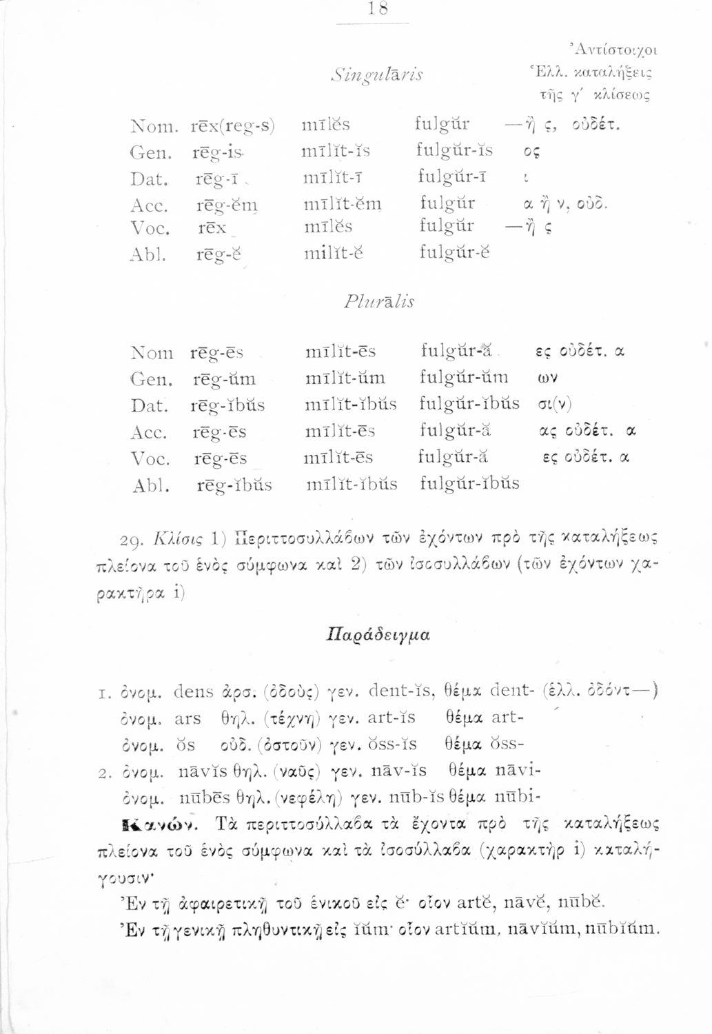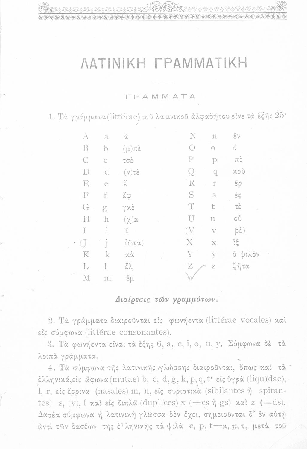 Σχολικό εγχειρίδιο Λατινικών που περιλαμβάνει τη γραμματική της λατινικής και είναι χωρισμένο στο τεχνολογικό, το τυπολογικό και το ετυμολογικό μέρος.