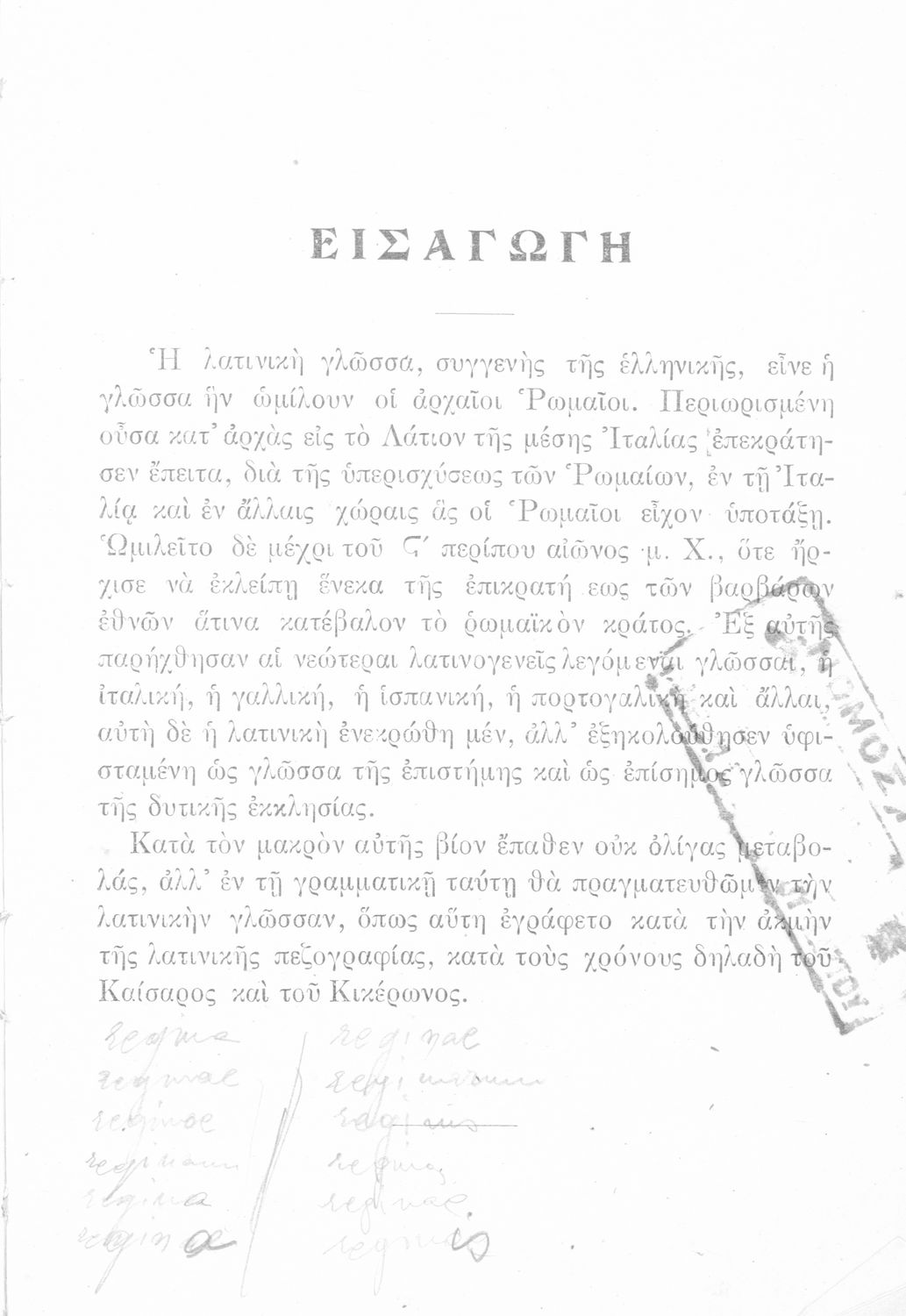 Σχολικό εγχειρίδιο Λατινικών Α΄, Β΄, Γ' Γυμνασίου που περιλαμβάνει γραμματική και συντακτικό και είναι χωρισμένο σε φθογγολογικό, τυπολογικό και ετυμολογικό μέρος.