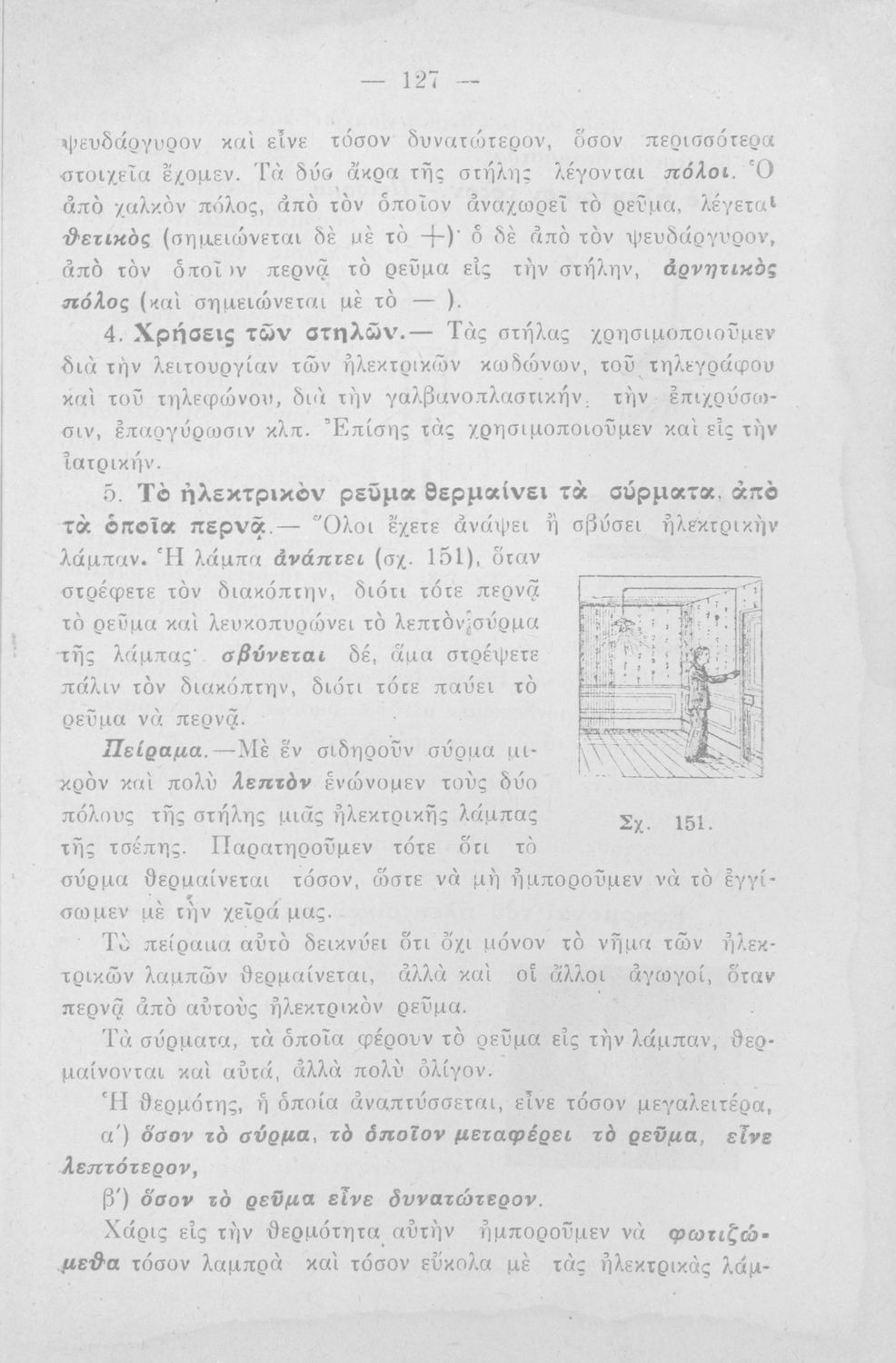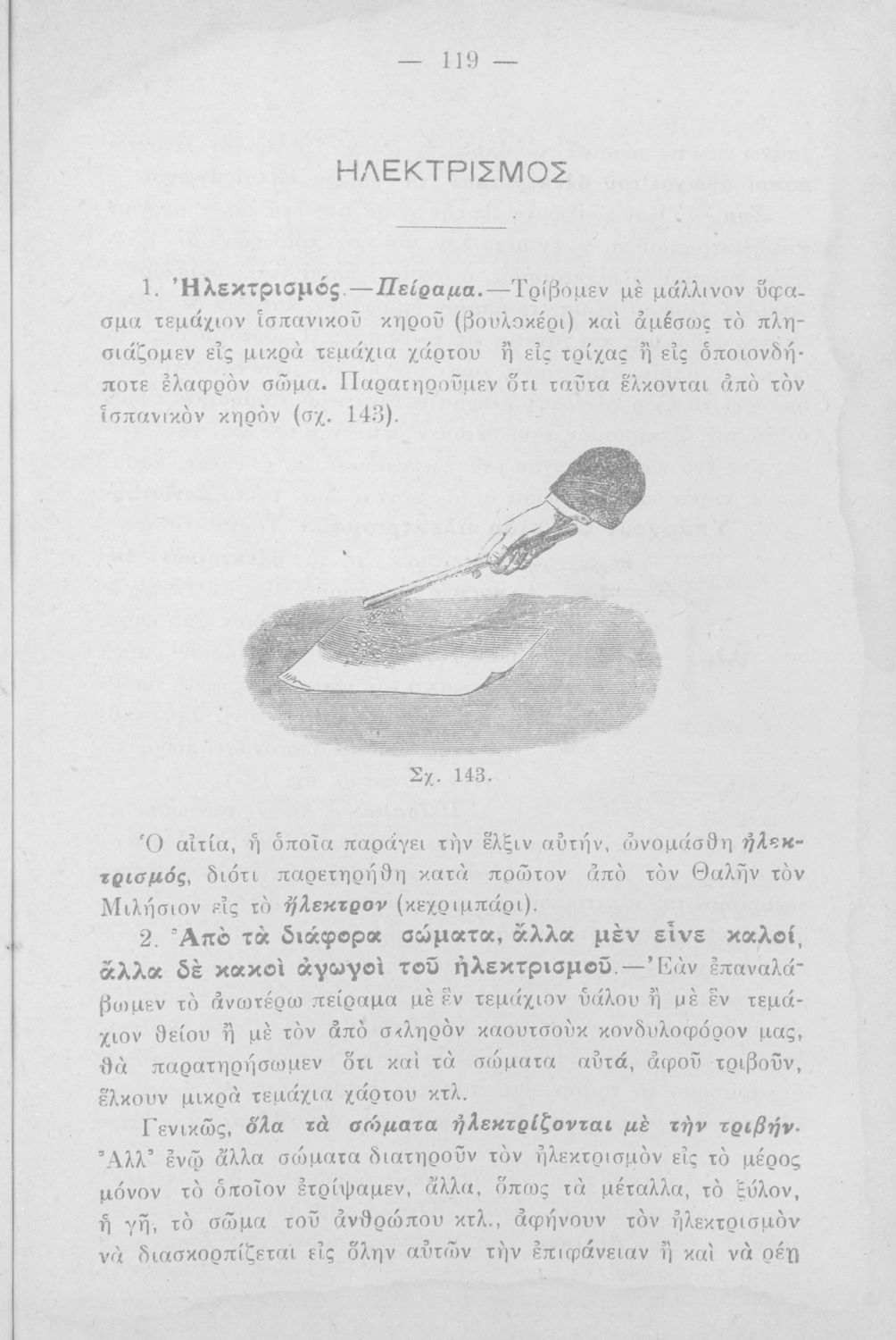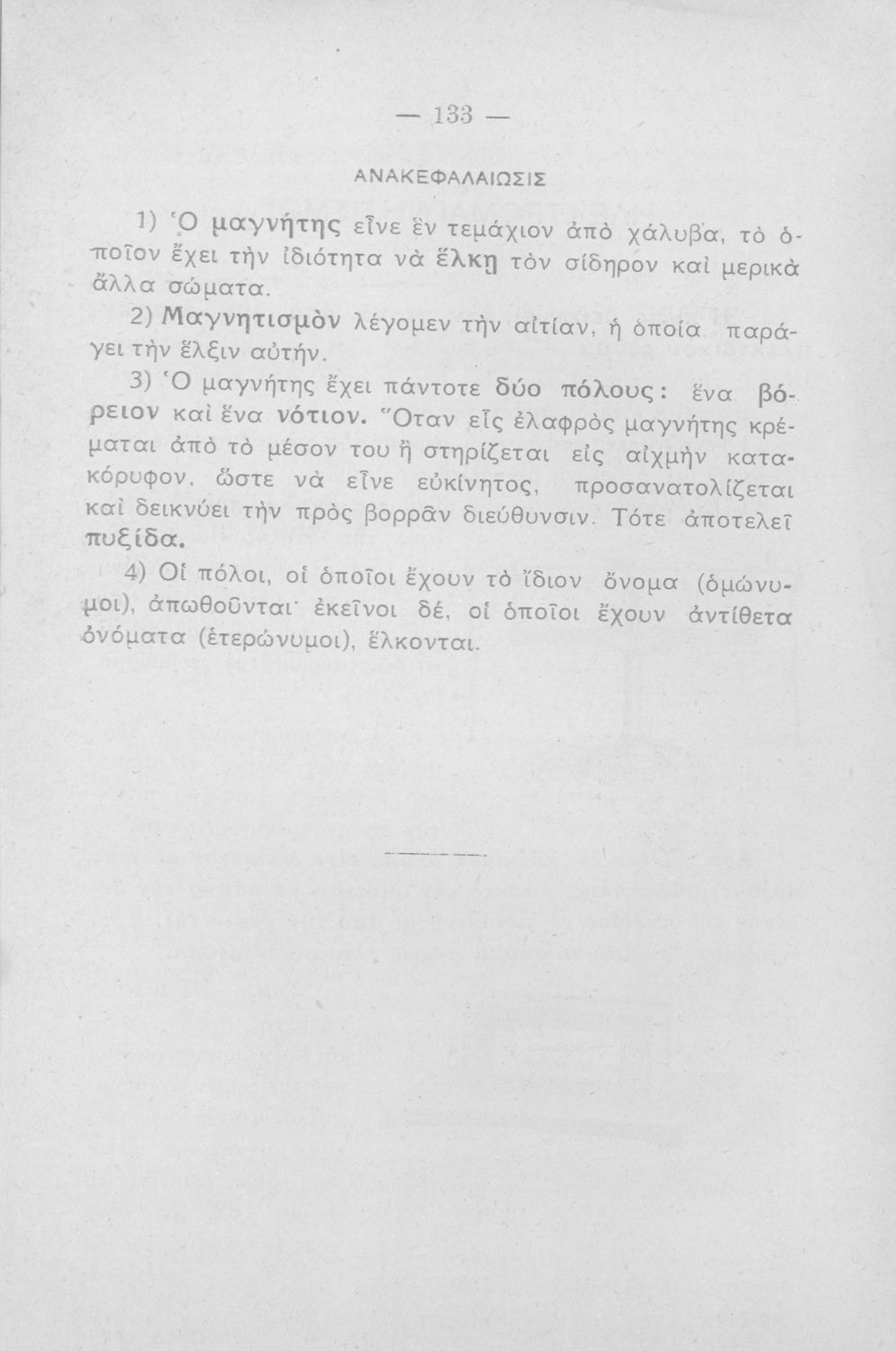 Σχολικό εγχειρίδιο της Ε΄ και ΣΤ΄ Τάξης των Δημοτικών Σχολείων και την Α΄ Τάξη των Οκτατάξιων Γυμνασίων, Προγυμνασίων και Αστικών Σχολείων για το μάθημα της Φυσικής. Παρέχει βασικές γνώσεις της φυσικής επιστήμης. Αναλύει τις ιδιότητες των σωμάτων, καθώς και της θερμότητας, του ηλεκτρισμού και του μαγνητισμού, την υδροστατική, την βαρύτητα και την αεροστατική. Αναφέρει πολλά από τα όργανα, που χρησιμοποιούνται στη φυσική, καθώς και τις πρακτικές εφαρμογές της επιστήμης στην καθημερινότητα. Περιέχει εικόνες και σχεδιαγράμματα, τα οποία βοηθούν τη διδασκαλία.