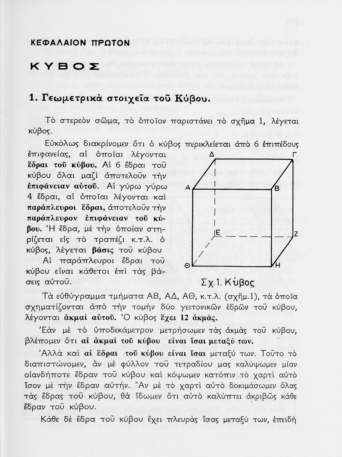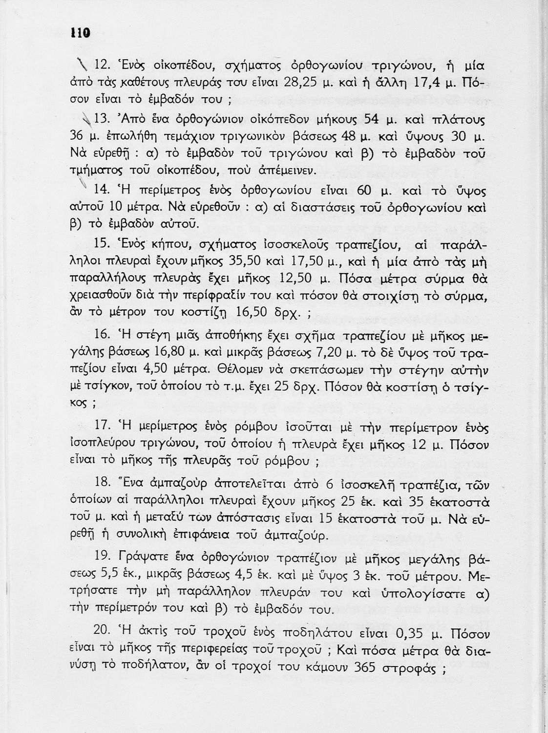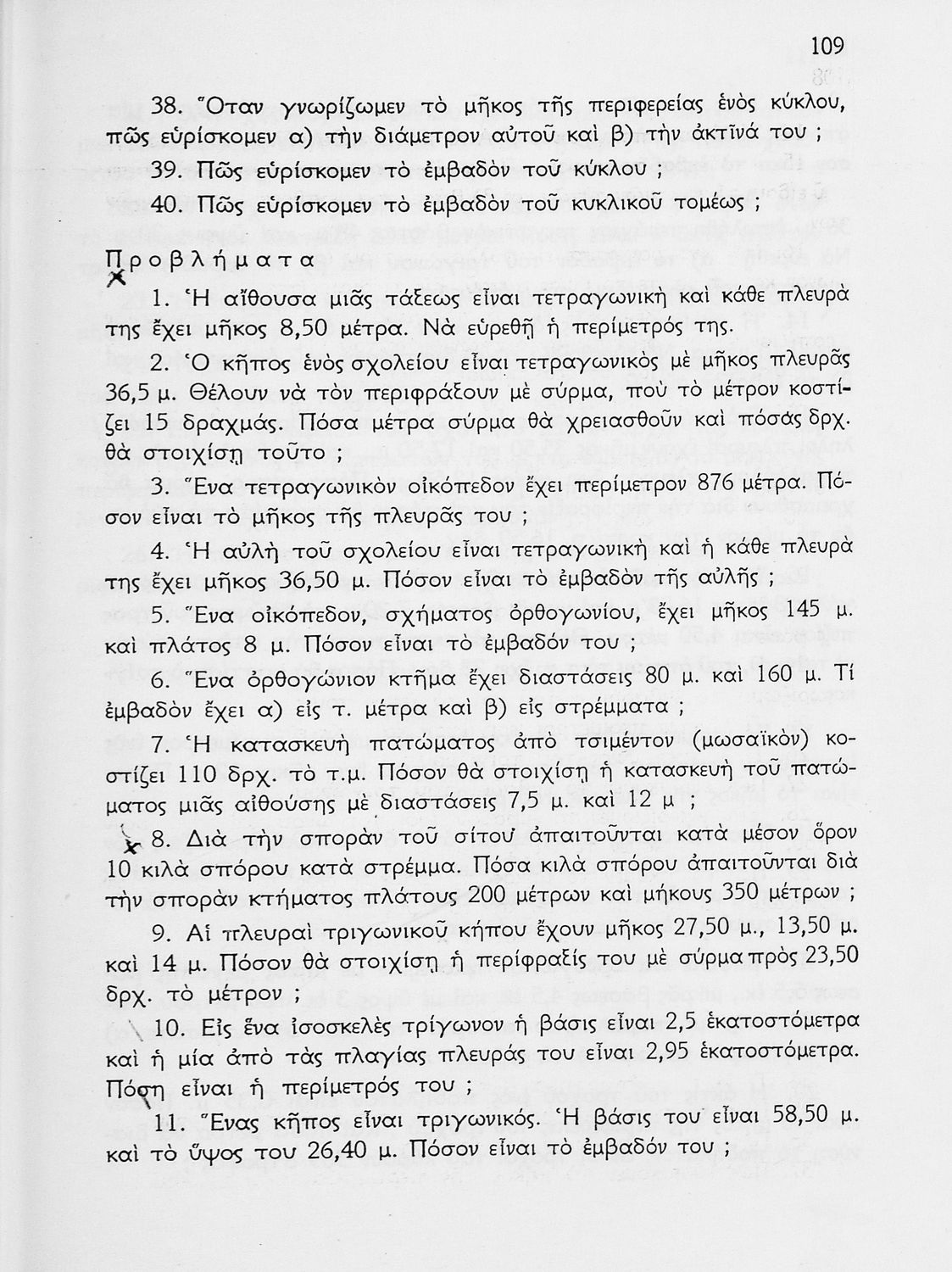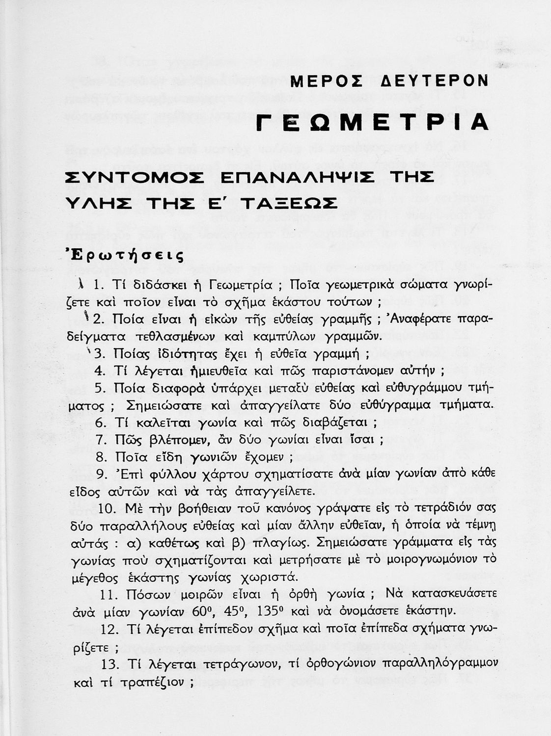 Σχολικό εγχειρίδιο Μαθηματικών ΣΤ΄ Δημοτικού που περιλαμβάνει ασκήσεις λογιστικού χαρακτήρα και ασκήσεις μέτρησης γεωμετρικών σχημάτων. Φέρει το σύμβολο της δικτατορίας.