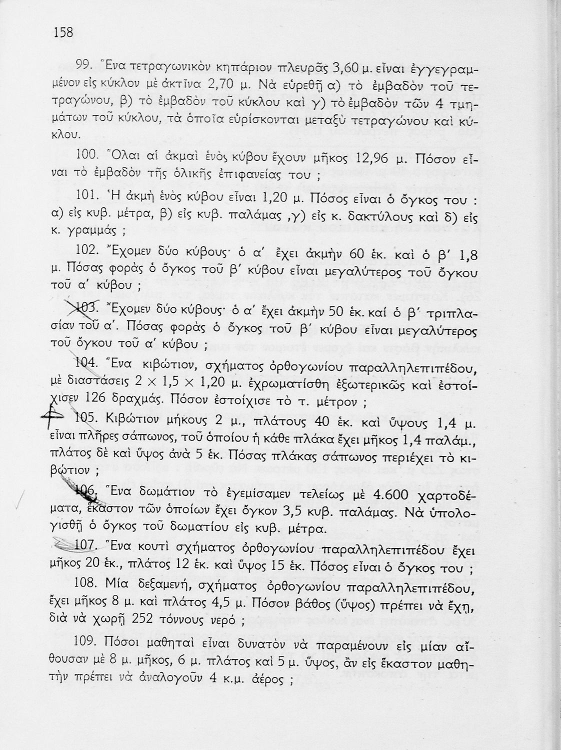 Παρουσίαση περιεχομένου: Σχολικό εγχειρίδιο Μαθηματικών ΣΤ΄ Δημοτικού που περιλαμβάνει ασκήσεις λογιστικού χαρακτήρα και ασκήσεις μέτρησης γεωμετρικών σχημάτων. Φέρει το σύμβολο της δικτατορίας.