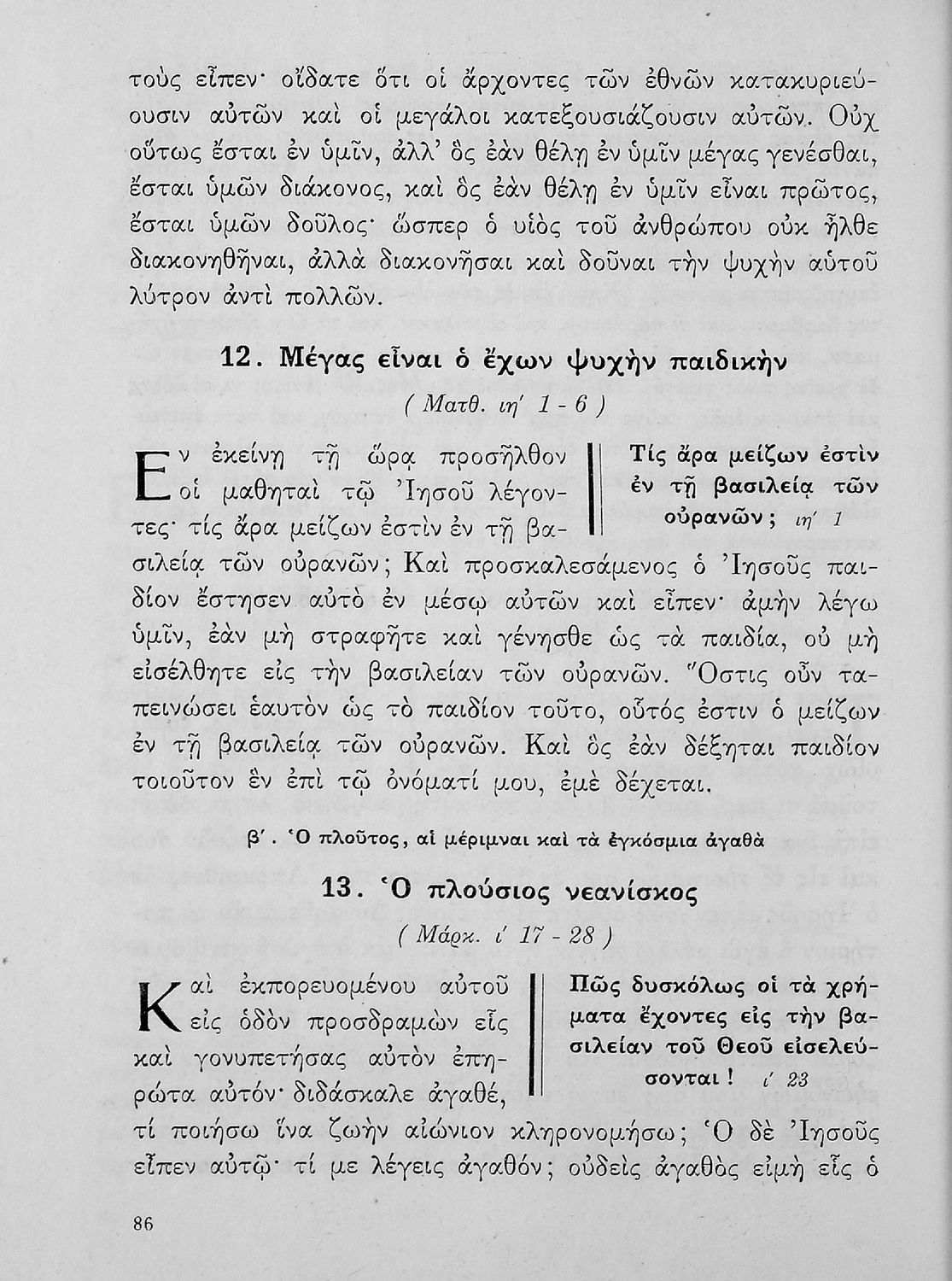 Σχολικό εγχειρίδιο Θρησκευτικών που περιλαμβάνει εισαγωγικά σχόλια στα βιβλία της Παλαιάς και Καινής Διαθήκης, περικοπές, ερμηνευτικές και πραγματολογικές σημειώσεις και πίνακα με τα κυριότερα ονόματα.