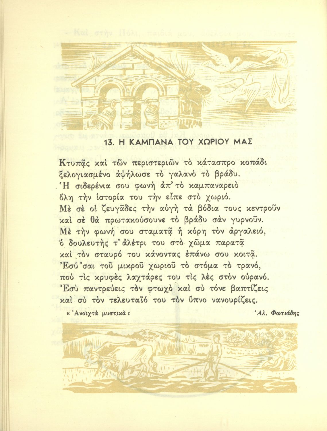 Αναγνωστικό ΣΤ΄ Δημοτικού που αντλεί τα θέματά του από τη θρησκευτική, εθνική, οικογενειακή, κοινωνική και επαγγελματική ζωή και την σύγχρονη ελληνική ιστορία. Φέρει το σύμβολο της δικτατορίας.