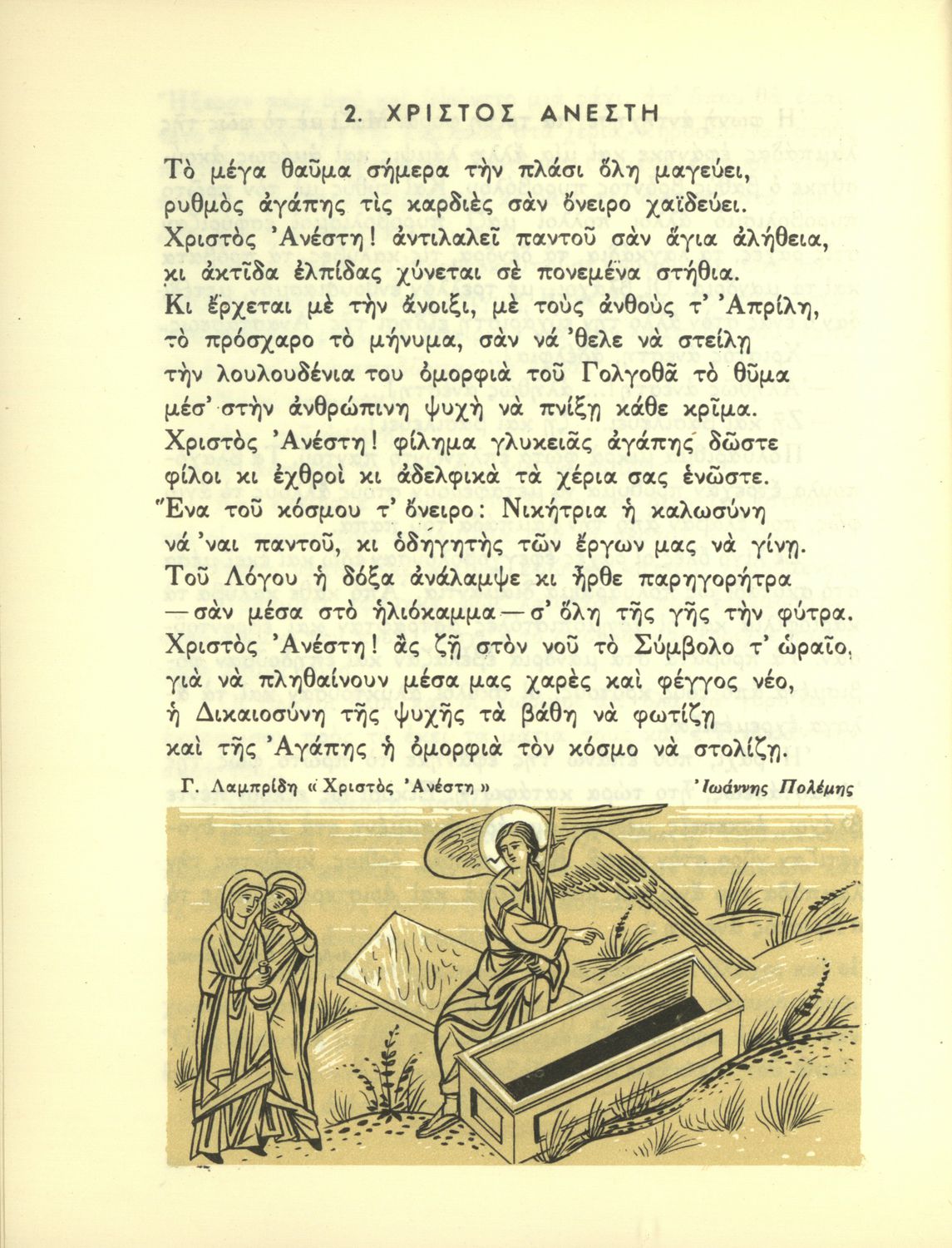 Αναγνωστικό ΣΤ΄ Δημοτικού που αντλεί τα θέματά του από τη θρησκευτική, εθνική, οικογενειακή, κοινωνική και επαγγελματική ζωή και την σύγχρονη ελληνική ιστορία. Φέρει το σύμβολο της δικτατορίας.