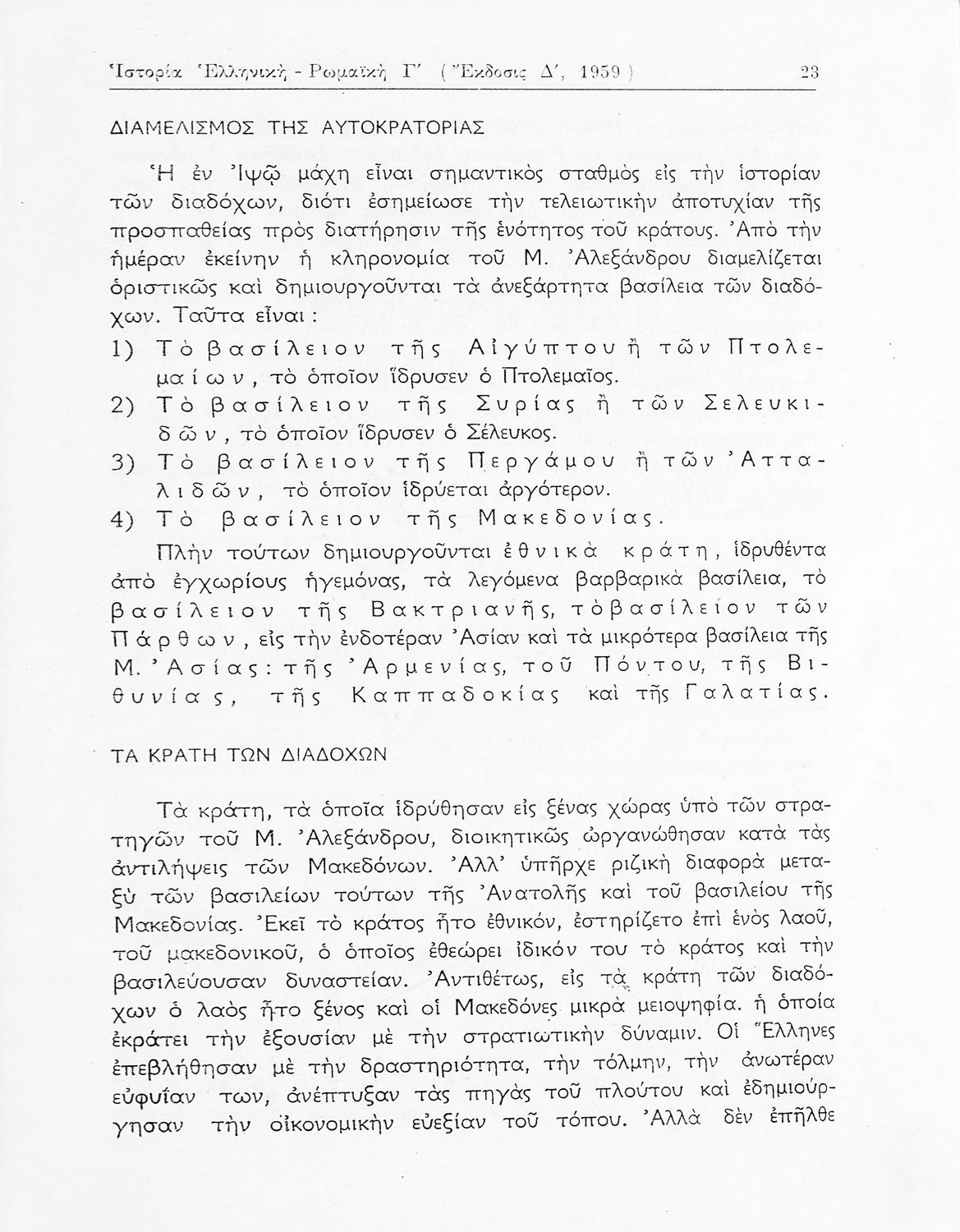 Σχολικό εγχειρίδιο Ιστορίας Γ΄ Γυμνασίου που καλύπτει την περίοδο από το θάνατο του Μ. Αλέξανδρου και τα ελληνιστικά βασίλεια ως την παρακμή της ρωμαϊκής αυτοκρατορίας. Περιέχει και παράρτημα με το μετρικό σύστημα των Ρωμαίων.