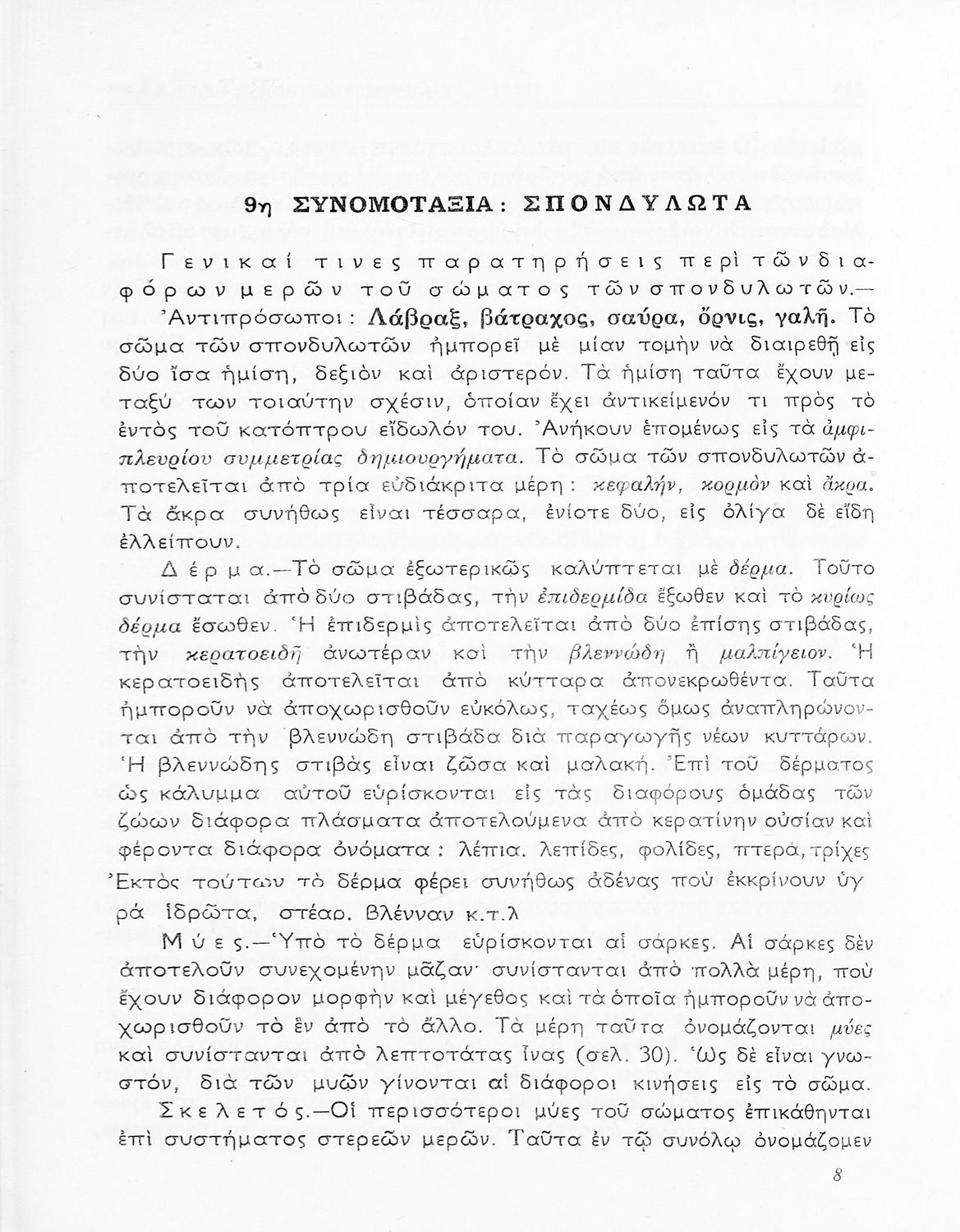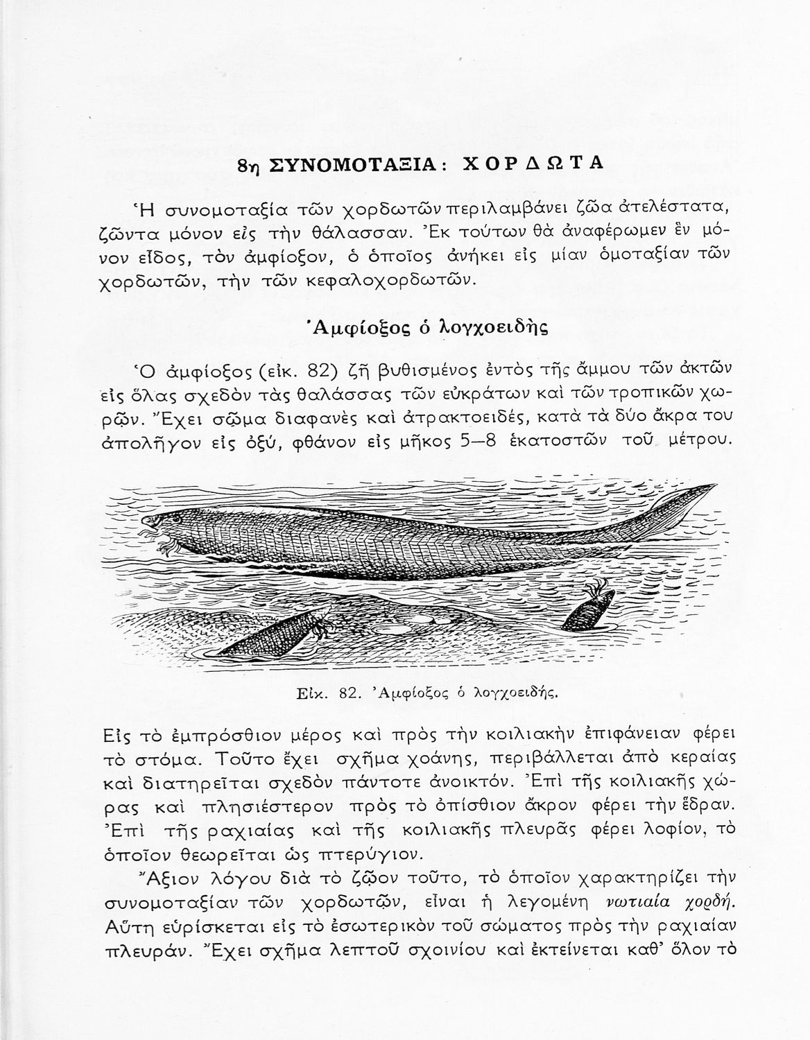 Σχολικό εγχειρίδιο Ζωολογίας για τα Γυμνάσια και τα Διδασκαλεία που εστιάζει στην ανθρώπινη φυσιολογία και παρουσιάζει τα διάφορα ζώα ανάλογα με την συνομοταξία στην οποία ανήκουν.