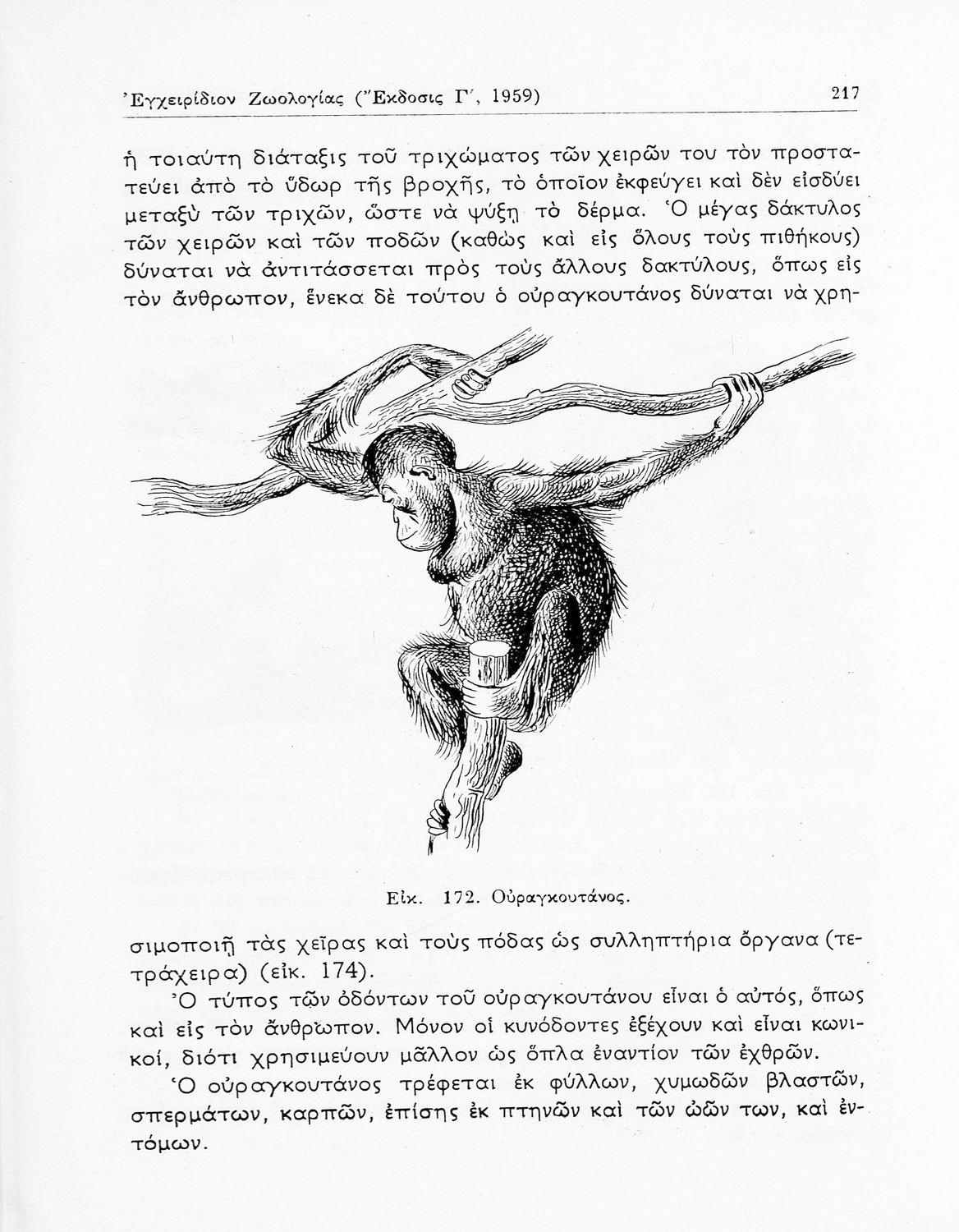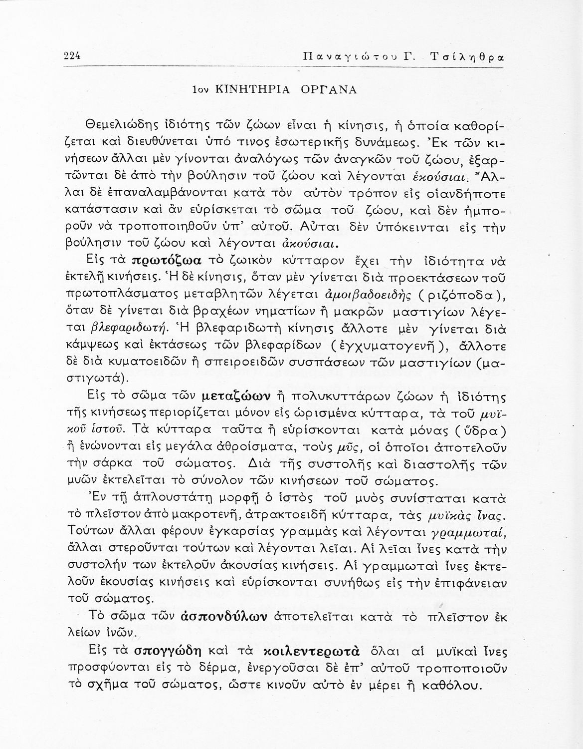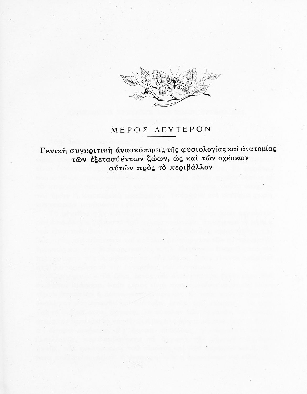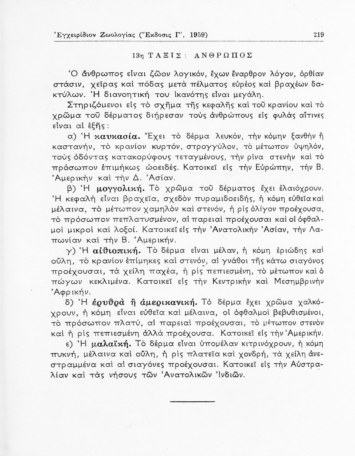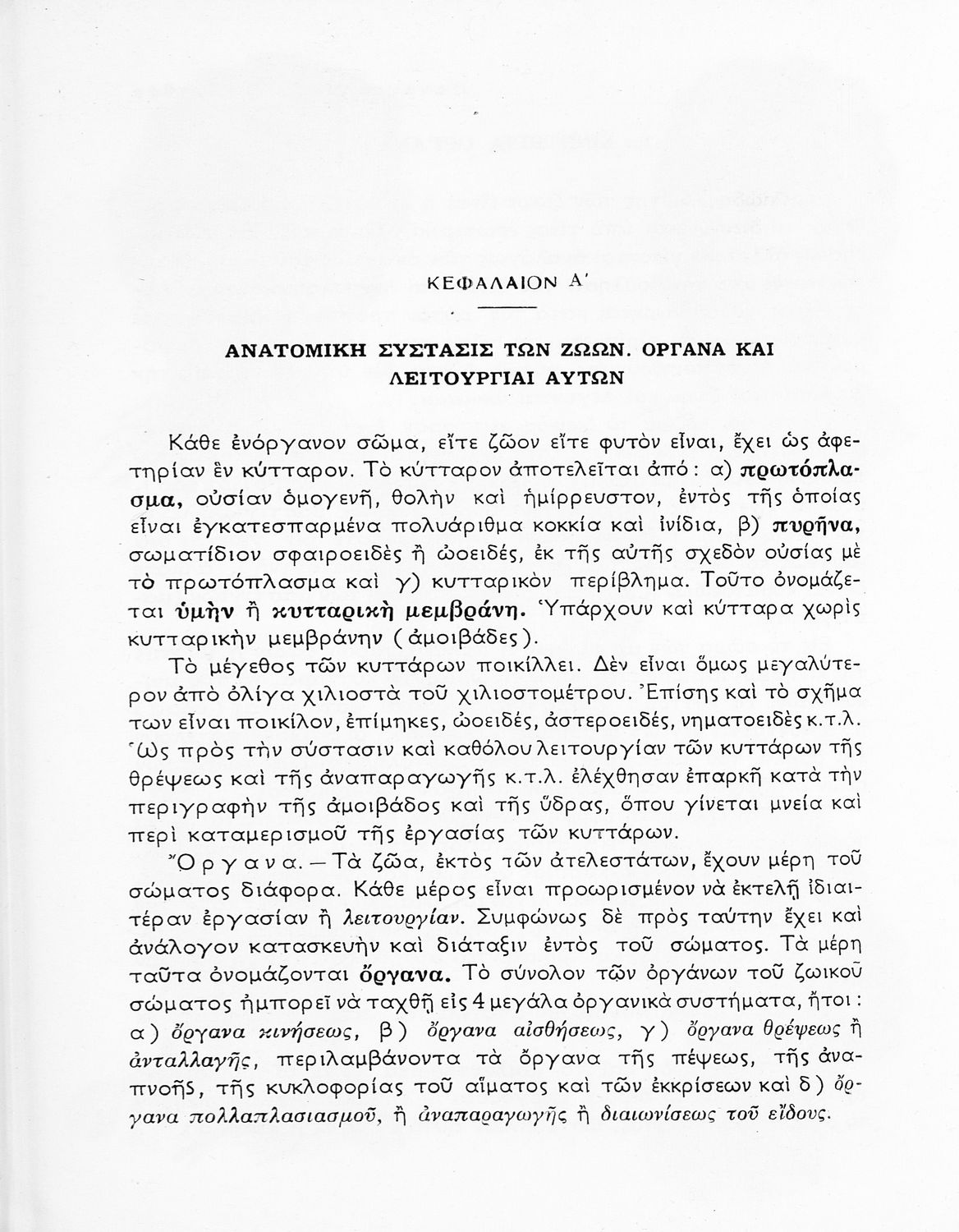 Σχολικό εγχειρίδιο Ζωολογίας για τα Γυμνάσια και τα Διδασκαλεία που εστιάζει στην ανθρώπινη φυσιολογία και παρουσιάζει τα διάφορα ζώα ανάλογα με την συνομοταξία στην οποία ανήκουν.