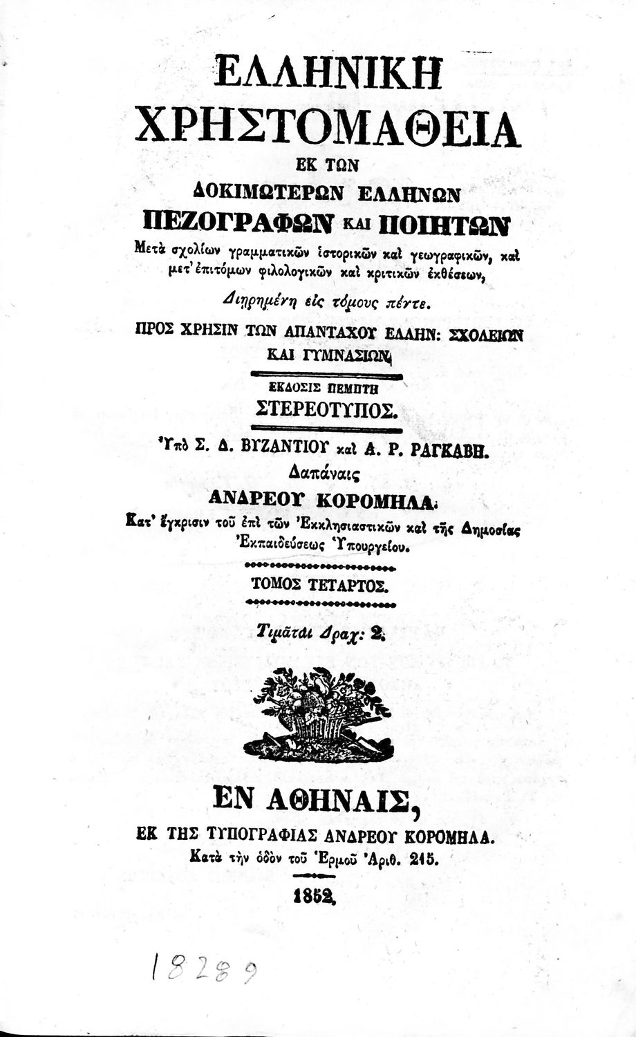 Τίτλος: Ελληνική χρηστομάθεια εκ των δοκιμωτέρων Ελλήνων πεζογράφων και ποιητών προς χρήσιν των απανταχού ελλήν. σχολείων και Γυμνασίων Τόμος Τέταρτος