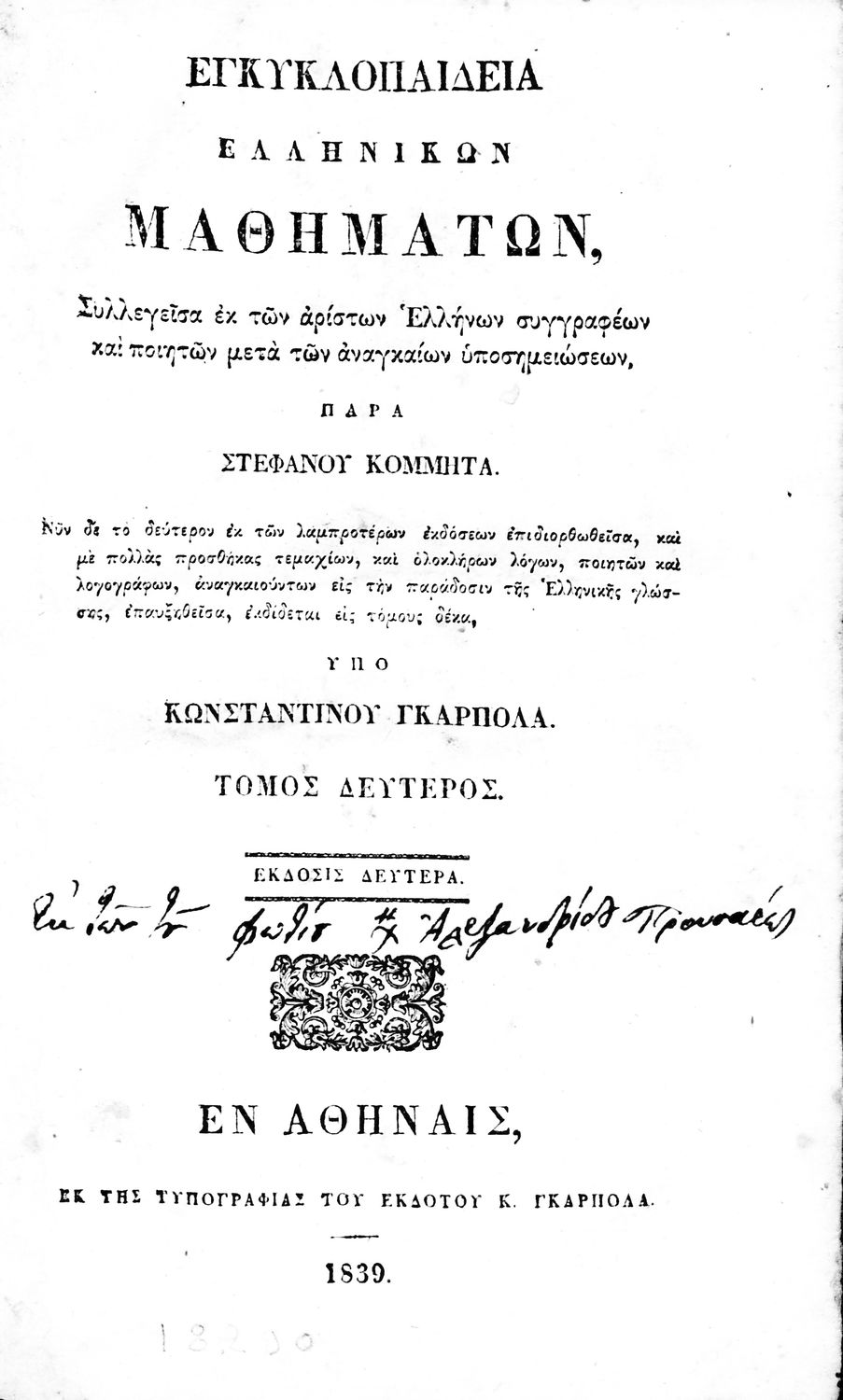 Τίτλος: Εγκυκλοπαίδεια ελληνικών μαθημάτων : συλλεγείσα εκ των αρίστων Ελλήνων συγγραφέων και ποιητών μετά των αναγκαίων υποσημειώσεων, τόμος Β΄