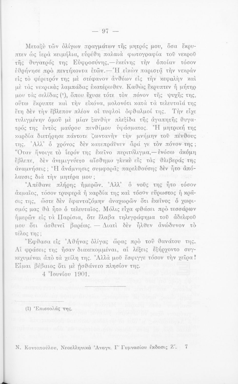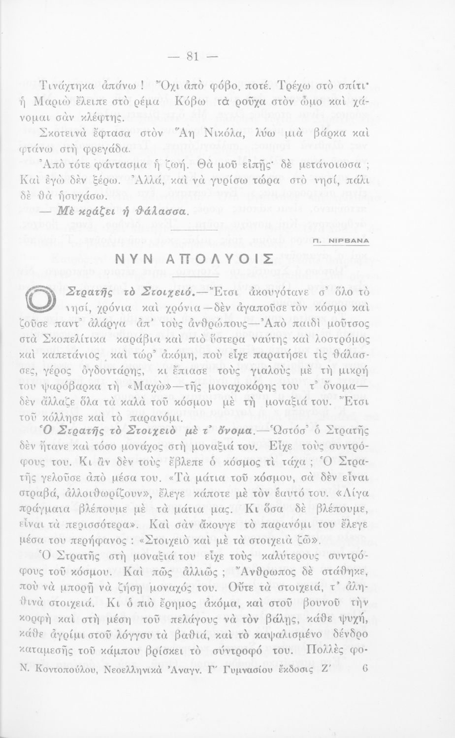 LDR 01633 2200217 4500 035 ## _a01-18291 040 ## _aΙνστιτούτο Εκπαιδευτικής Πολιτικής 041 ## _ael 100 ## _aΝικόλαος Κοντόπουλος 110 ## _a18291 245 0# _aΝεοελληνικά αναγνώσματα διά τους μαθητάς της Γ΄ τάξεως των Εξαταξίων Γυμνασίων και της αντιστοίχου των λοιπών της Μέσης Εκπαιδεύσεως 250 ## _a7η Έκδοση 260 ## _aΑθήνα _bΗλίας Ν.Δικαίος _c1940 300 ## _a212 _bΕικόνες (ασπρόμαυρες) _c20 520 ## _aΣχολικό εγχειρίδιο Νέων Ελληνικών Γ΄ Γυμνασίου που περιλαμβάνει ποιήματα και πεζά Ελλήνων συγγραφέων και δημοτικά τραγούδια εμπνευσμένα από την σύγχρονη ελληνική ιστορία, την ελληνική φύση και τη ζωή στην ύπαιθρο, την οικογενειακή και κοινωνική ζωή και τη θρησκευτική παράδοση. Περιέχει και παράρτημα με βιογραφίες των συγγραφέων και λεξιλόγιο. 521 ## _aΓ' Γυμνασίου 522 ## _aΕλλάδα 546 ## _aΚαθαρεύουσα / Δημοτική 563 ## _aΣκληρό Εξώφυλλο 583 ## _a41719/26-8-1933 _c1933 650 #4 _aΒαλαωρίτης _aΒιζυηνός _aΚορνάρος _aΝιρβάνας _aΠαλαμάς