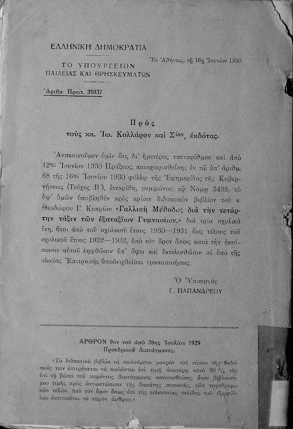 Τίτλος: Γαλλική μέθοδος εγκεκριμένη υπό του Υπουργείου της Παιδείας δια την Δ’ τάξιν των Εξαταξίων Γυμνασίων και τας αντιστοίχους τάξεις των λοιπών σχολείων της Μέσης Εκπαιδεύσεως