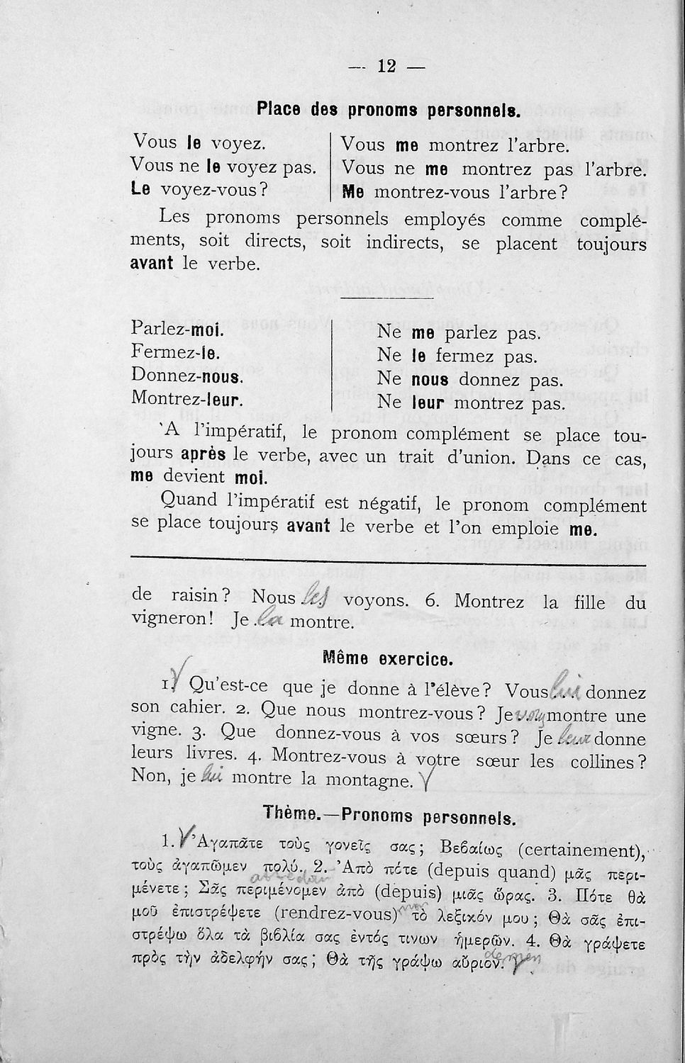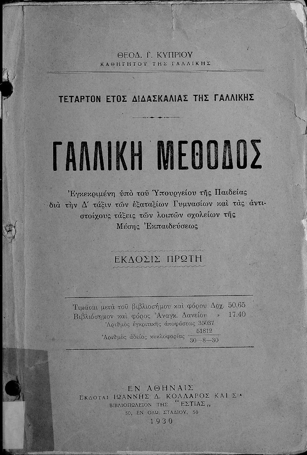 Τίτλος: Γαλλική μέθοδος εγκεκριμένη υπό του Υπουργείου της Παιδείας δια την Δ’ τάξιν των Εξαταξίων Γυμνασίων και τας αντιστοίχους τάξεις των λοιπών σχολείων της Μέσης Εκπαιδεύσεως