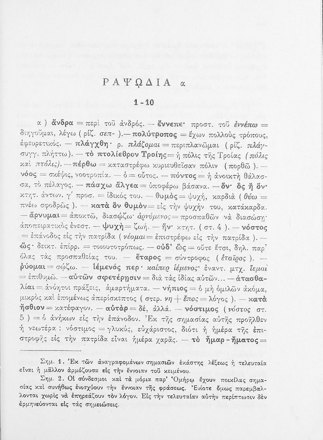 Σχολικό εγχειρίδιο Αρχαίων Ελληνικών Γυμνασίου που περιλαμβάνει αποσπάσματα από τις ραψωδίες της Οδύσσειας, ερμηνευτικά και πραγματολογικά σχόλια, και λεξιλογικές παρατηρήσεις.