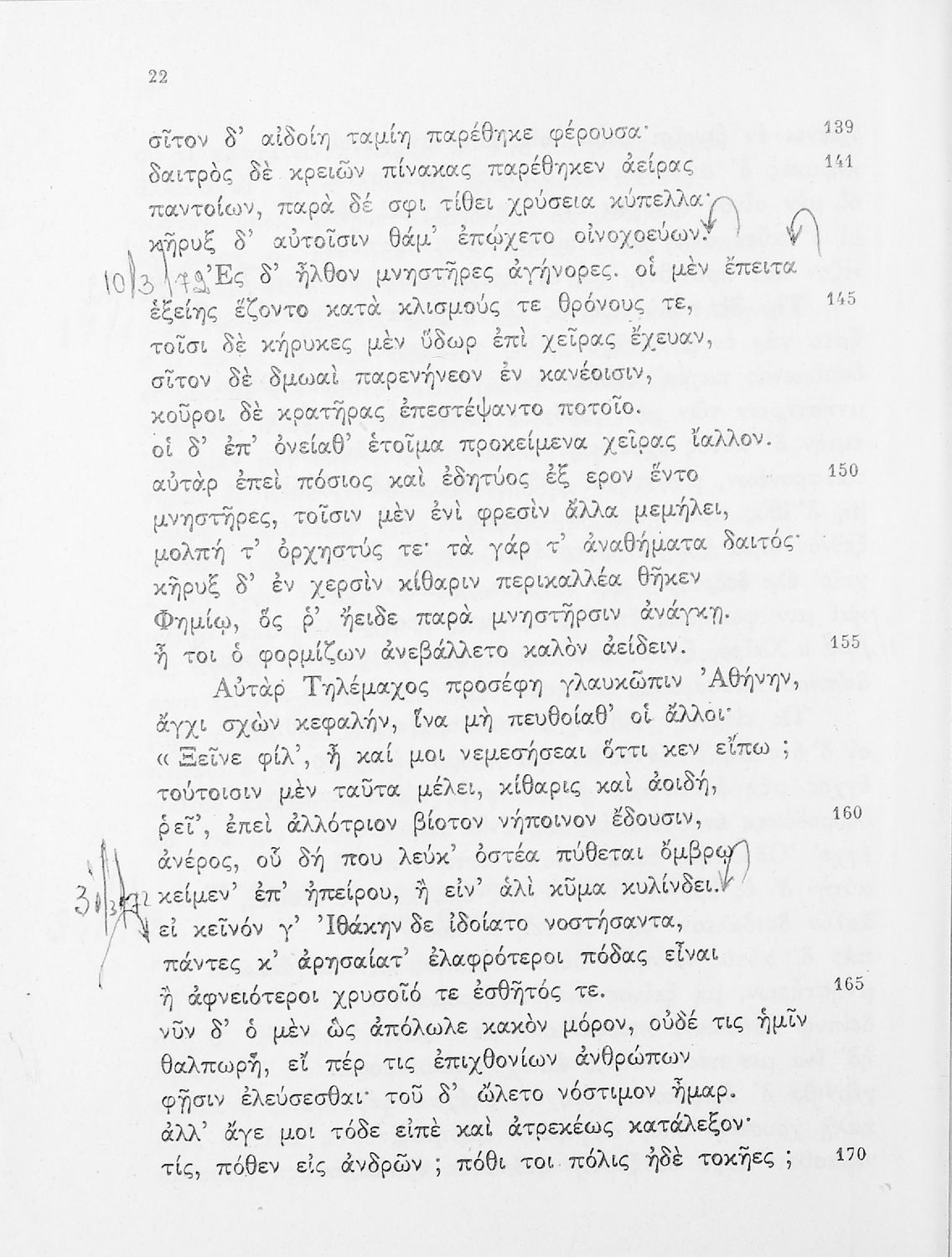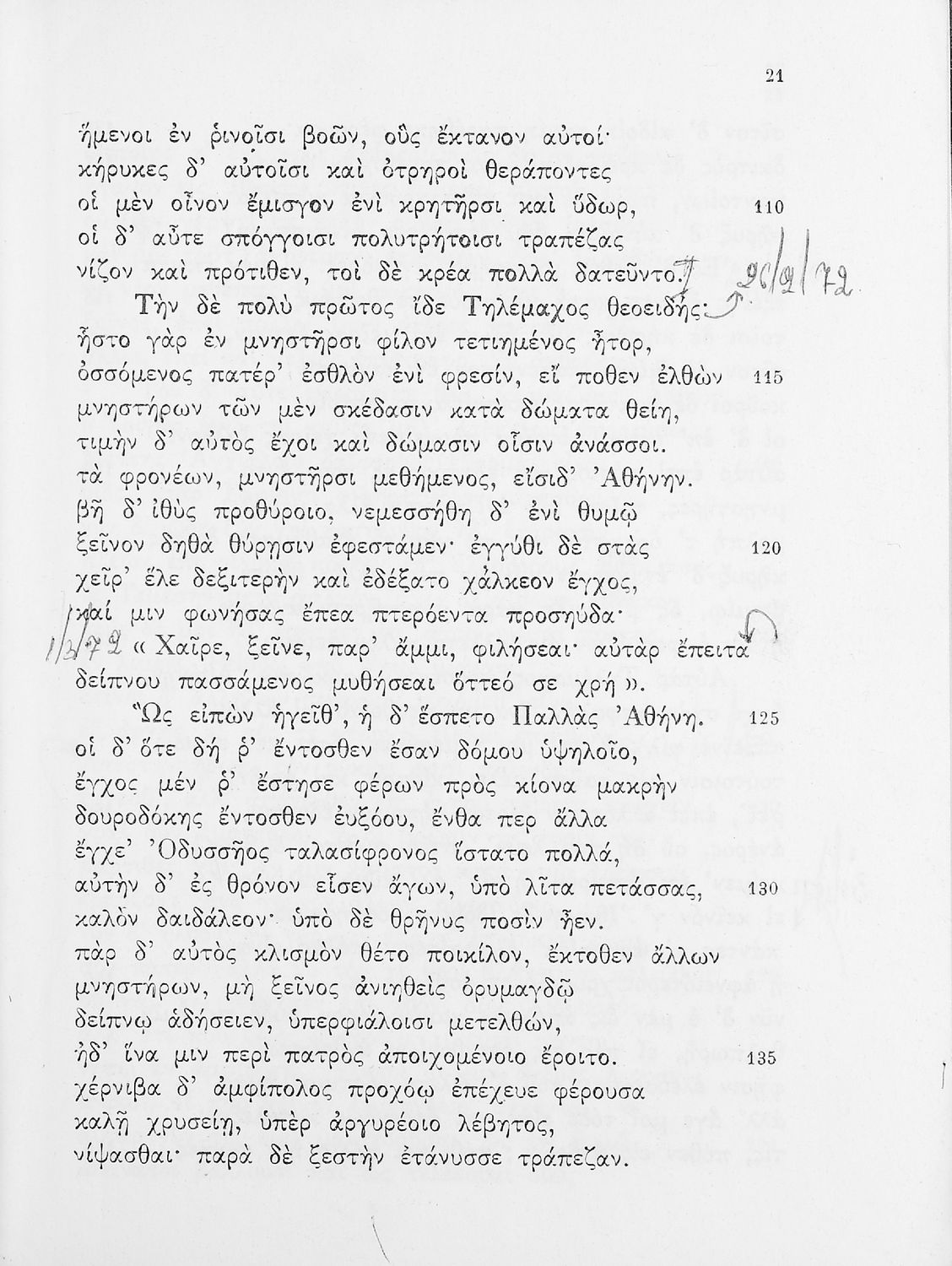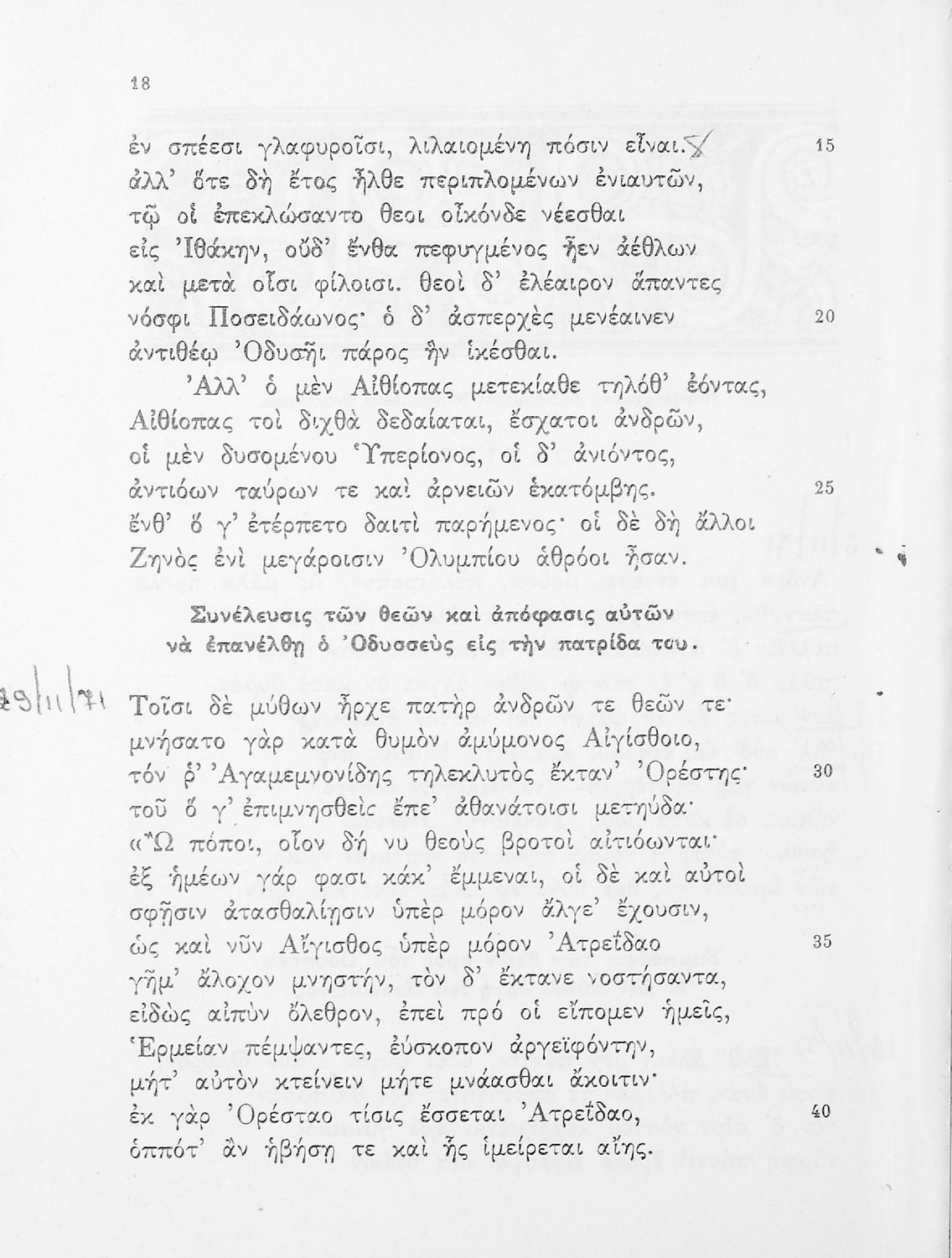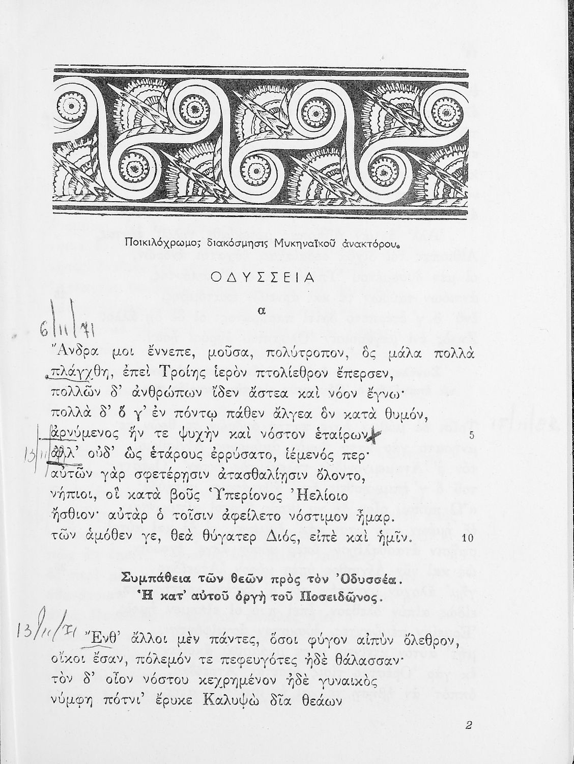 Σχολικό εγχειρίδιο Αρχαίων Ελληνικών Γυμνασίου που περιλαμβάνει μετάφραση της Οδύσσειας και λεξιλόγιο.