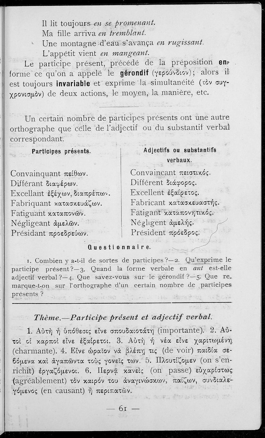 Σχολικό εγχειρίδιο Γαλλικών Γ΄ Γυμνασίου που περιλαμβάνει γραμματικούς και συντακτικούς κανόνες, κείμενα και τις μεταφράσεις τους στην καθαρεύουσα. Περιέχει και λεξιλόγιο.