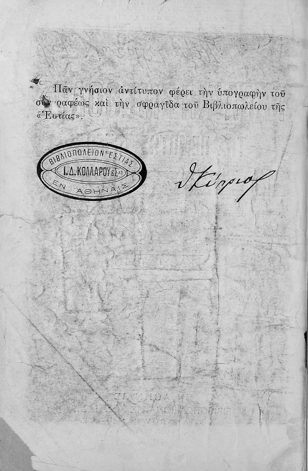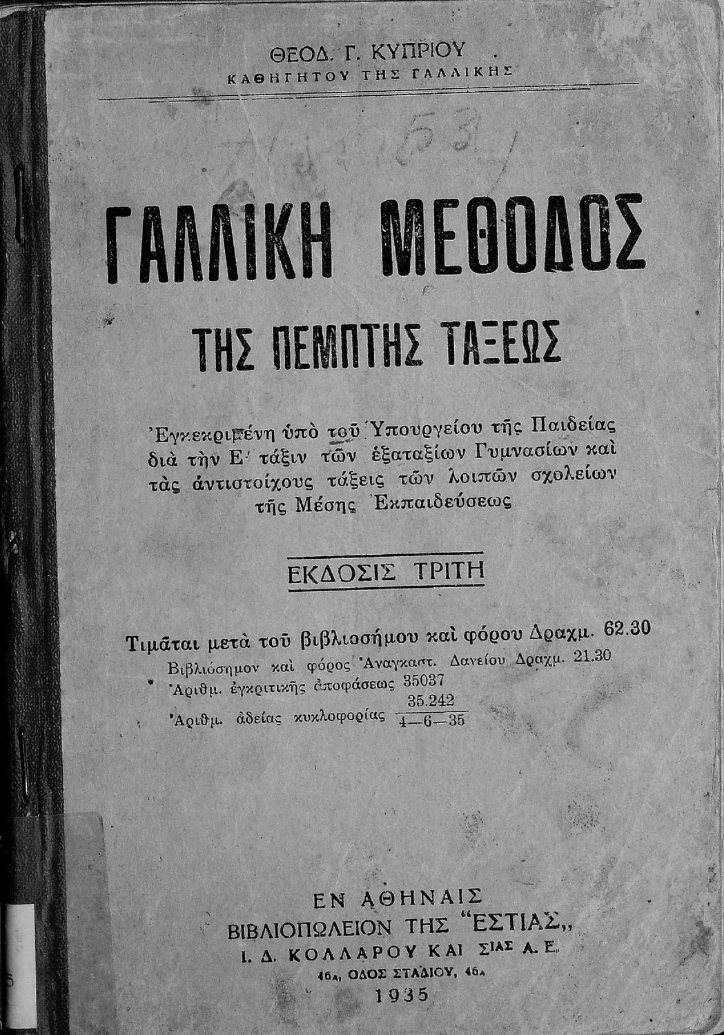 Εκδότης: Ιωάννης Δ. Κολλάρος Έτος έκδοσης: 1935 Τόπος έκδοσης: Αθήνα Έκδοση: 3η Υπουργική απόφαση / Σύμβαση: 35037/16-6-1930 Έτος έγκρισης: 1930 |