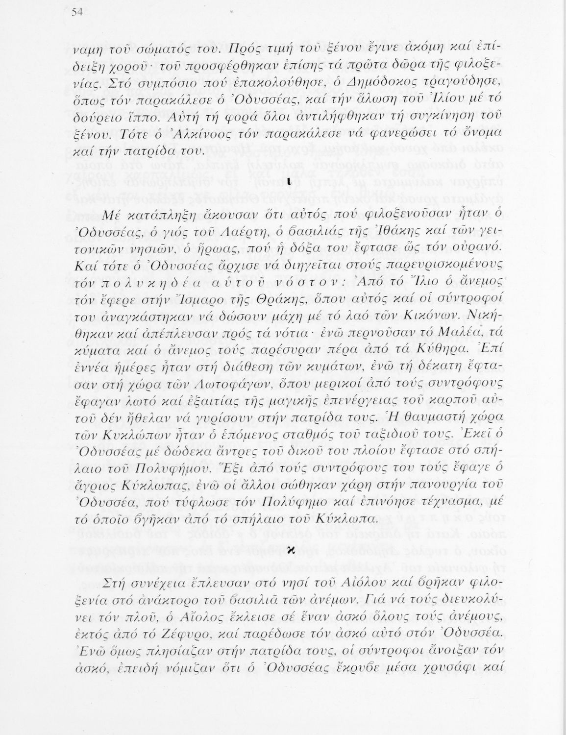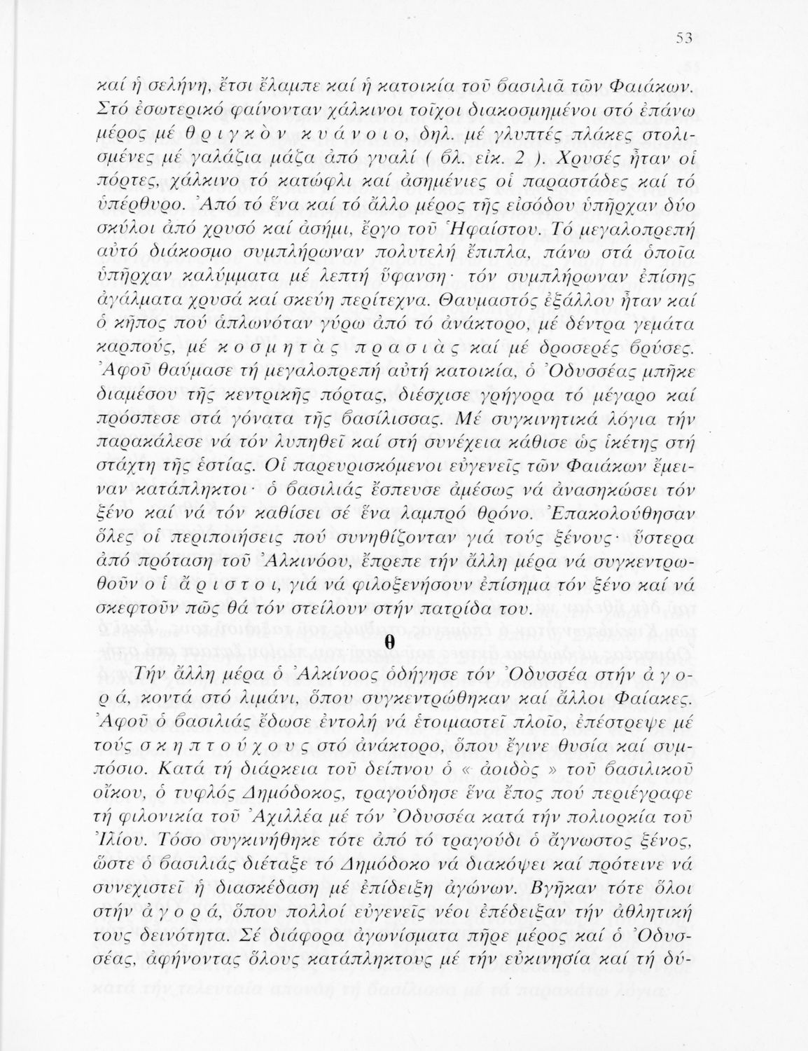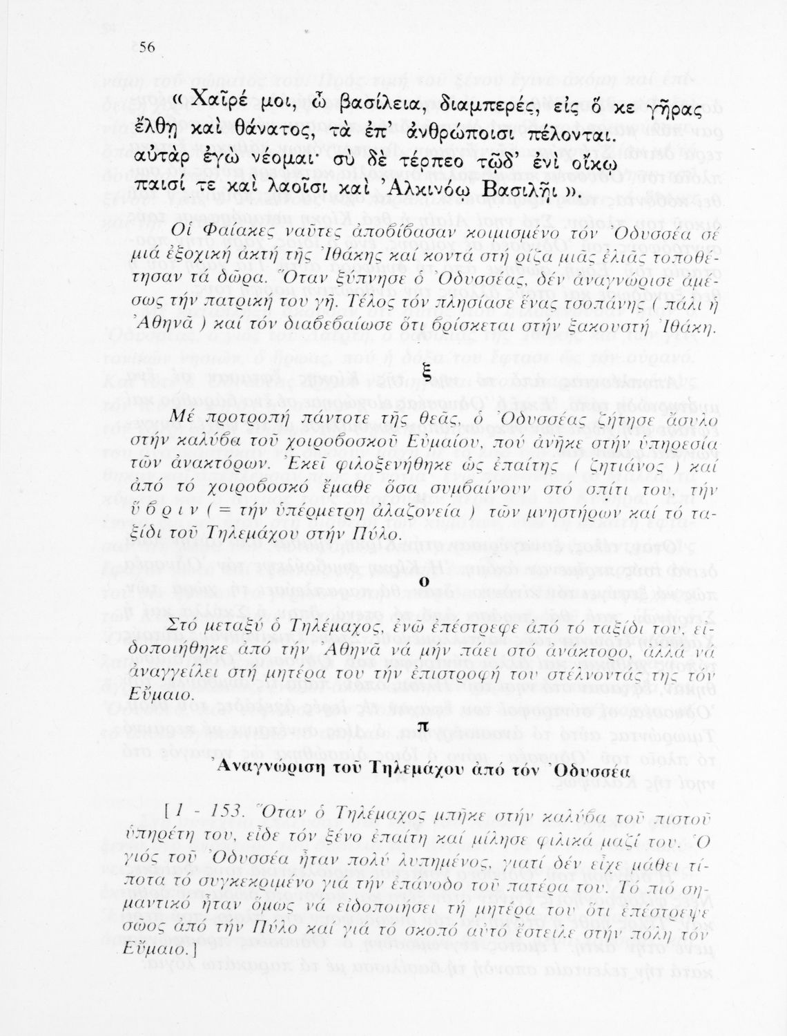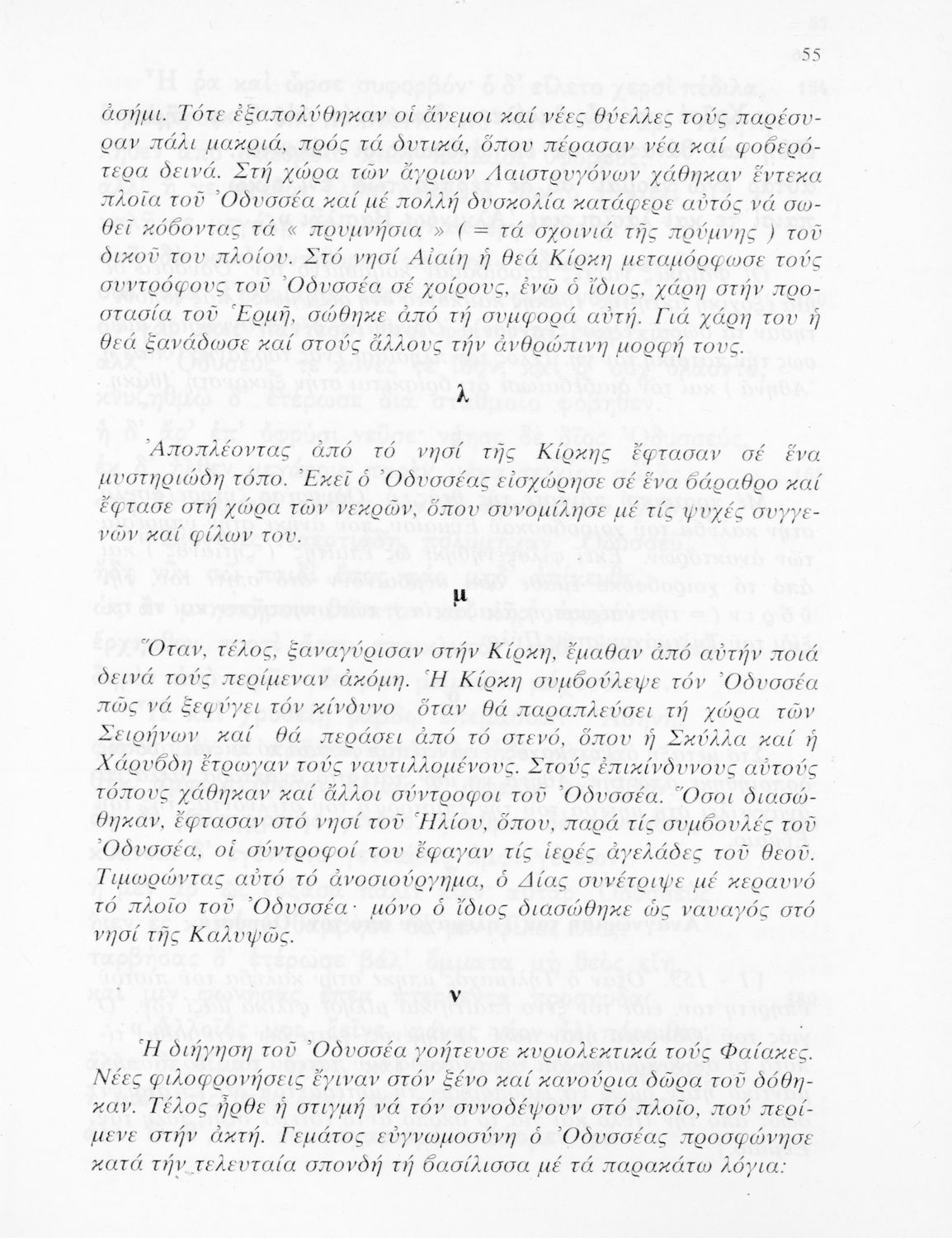 Σχολικό εγχειρίδιο Αρχαίων Ελληνικών. Το βιβλίο περιλαμβάνει εισαγωγή σχετικά με την ελληνική ποίηση και τα ομηρικά έπη. Περιλαμβάνονται αποσπάσματα από το πρωτότυπο κείμενο της Οδύσσειας τα οποία συνοδεύονται από συνδετικές περιλήψεις στη δημοτική. Ακολουθούν ερμηνευτικές σημειώσεις (σημασιολογικές, γραμματικές, πραγματολογικές) και παράρτημα εικόνων.