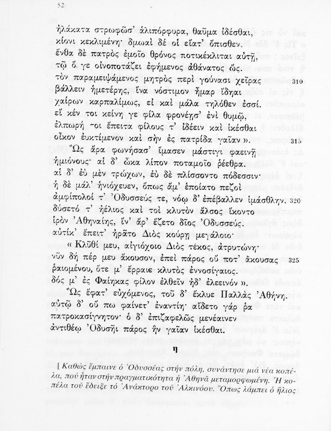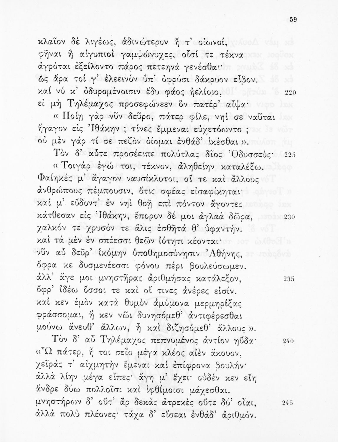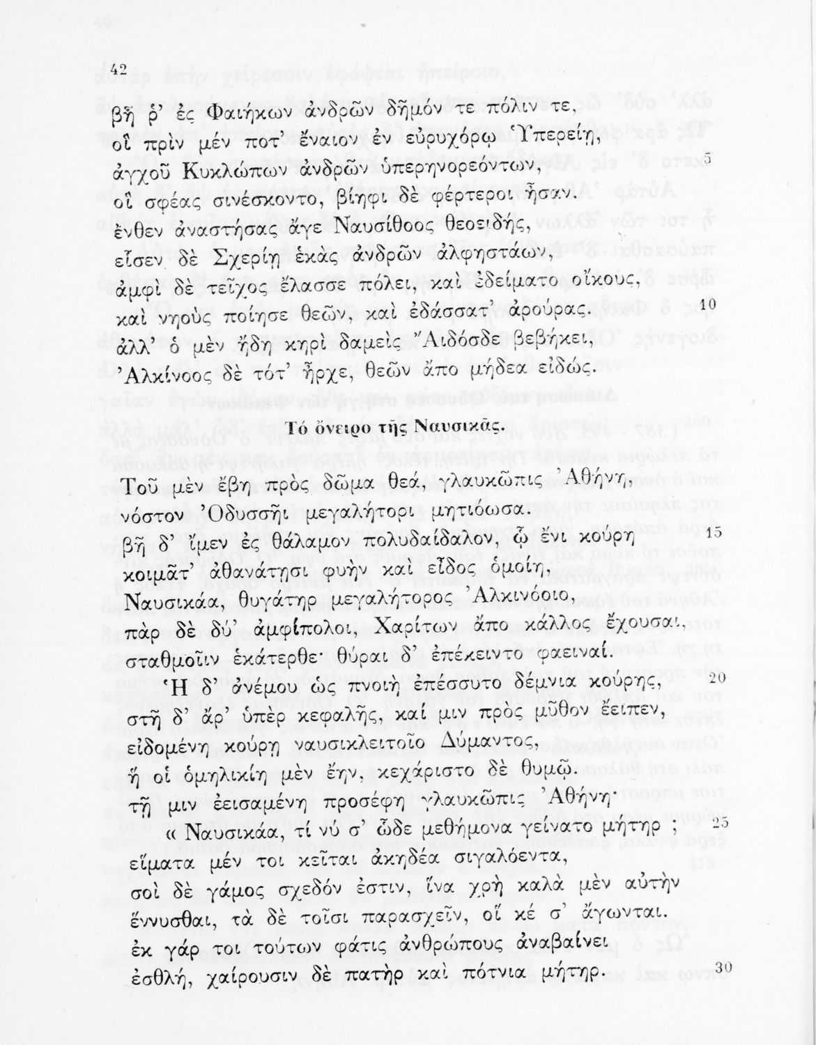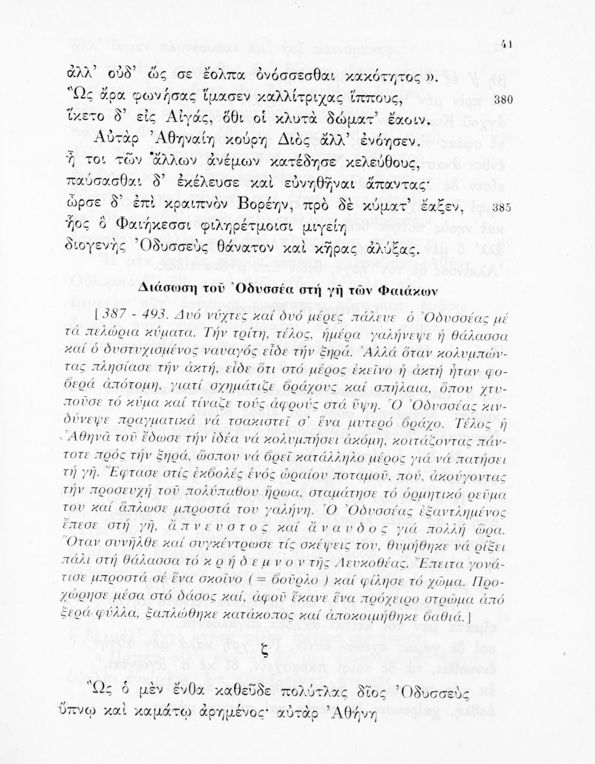 Σχολικό εγχειρίδιο Αρχαίων Ελληνικών. Το βιβλίο περιλαμβάνει εισαγωγή σχετικά με την ελληνική ποίηση και τα ομηρικά έπη. Περιλαμβάνονται αποσπάσματα από το πρωτότυπο κείμενο της Οδύσσειας τα οποία συνοδεύονται από συνδετικές περιλήψεις στη δημοτική. Ακολουθούν ερμηνευτικές σημειώσεις (σημασιολογικές, γραμματικές, πραγματολογικές) και παράρτημα εικόνων.
