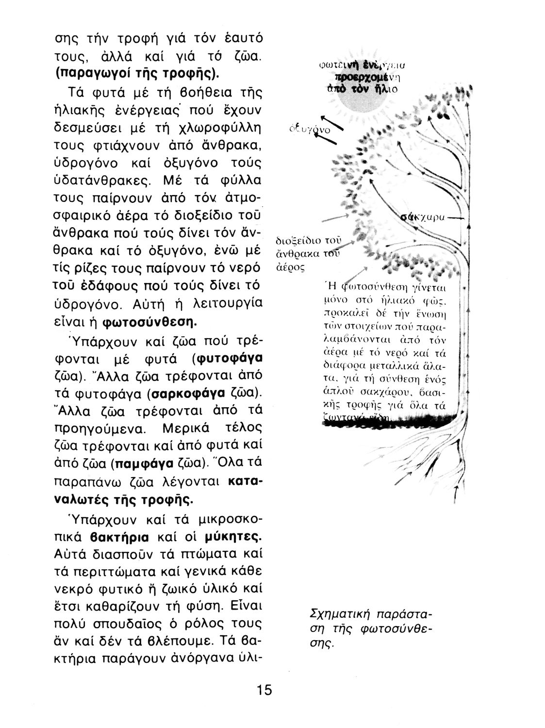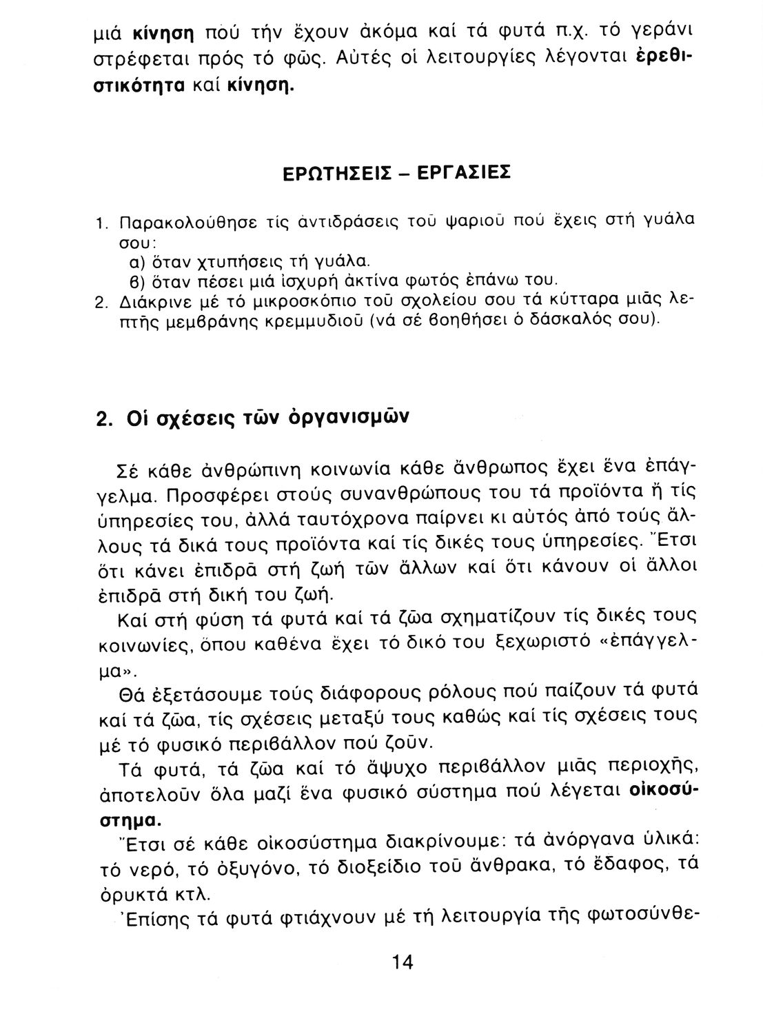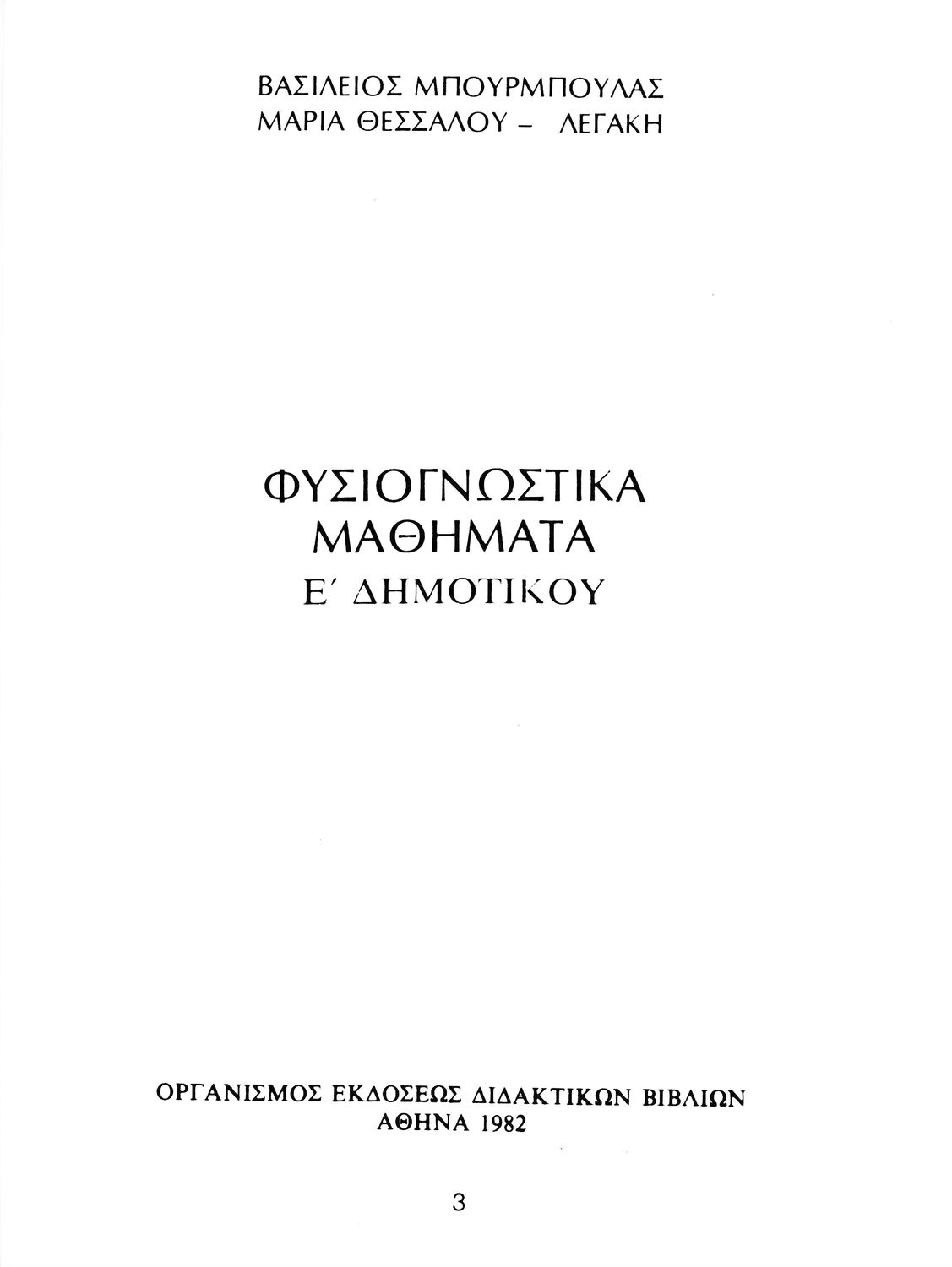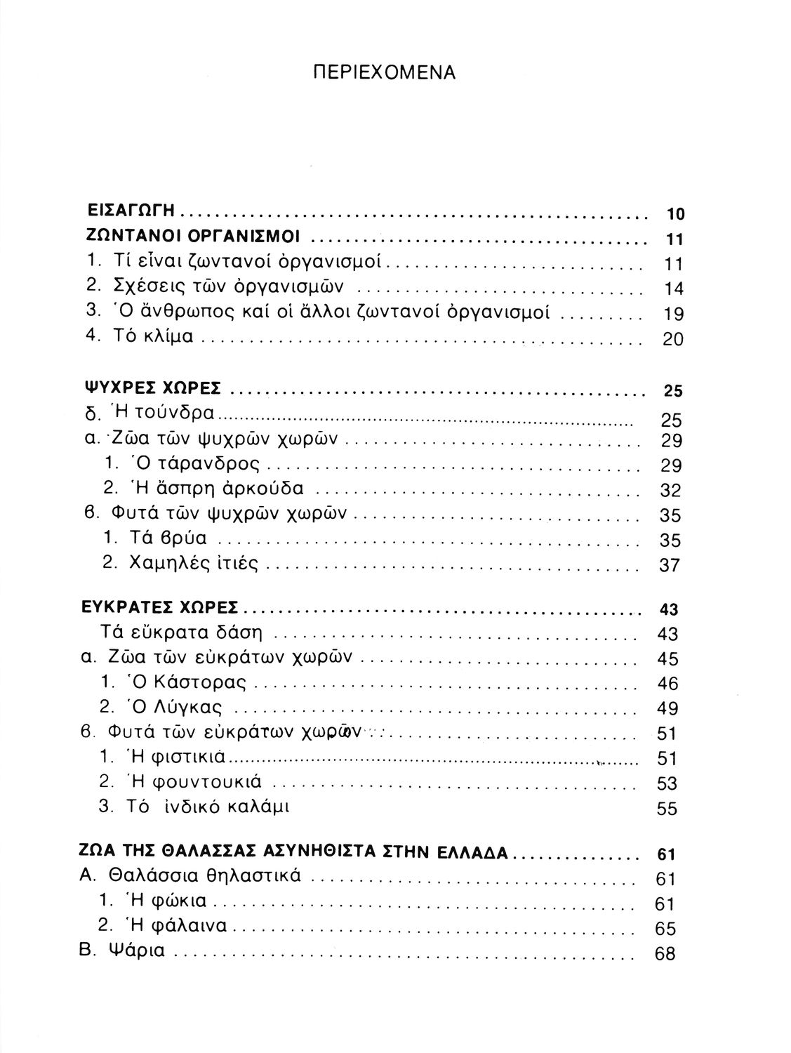 Σχολικό εγχειρίδιο Μελέτης Περιβάλλοντος για την Ε΄ Δημοτικού. Πρόκειται για βιβλίο που μελετά ζώα και φυτά διαφόρων χωρών και τη σχέση τους με τον άνθρωπο. Στο τέλος του βιβλίου γίνεται αναφορά στα πετρώματα και τα ορυκτά.