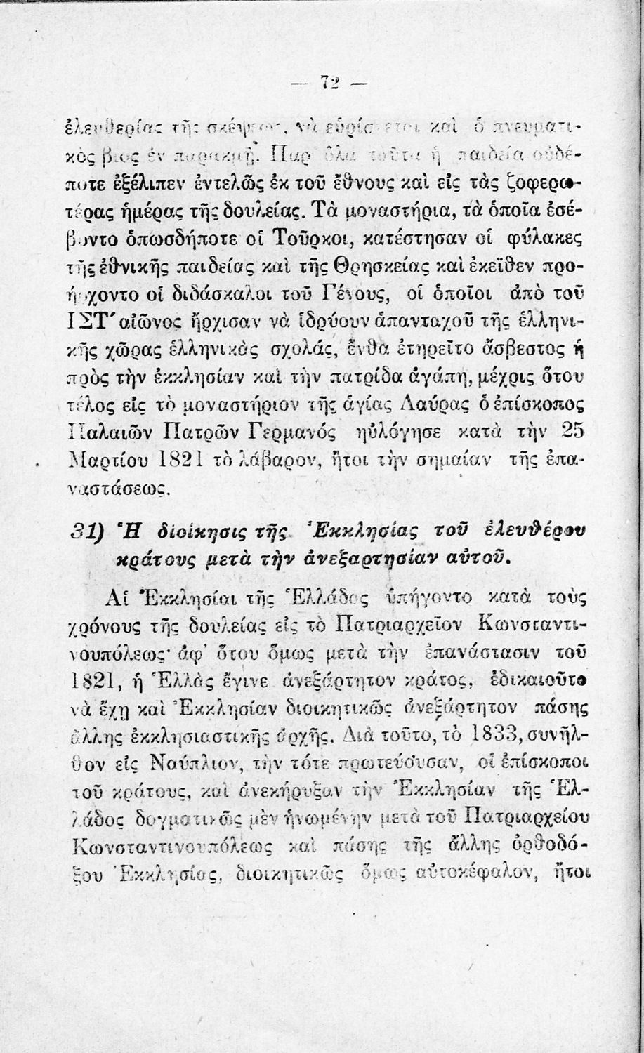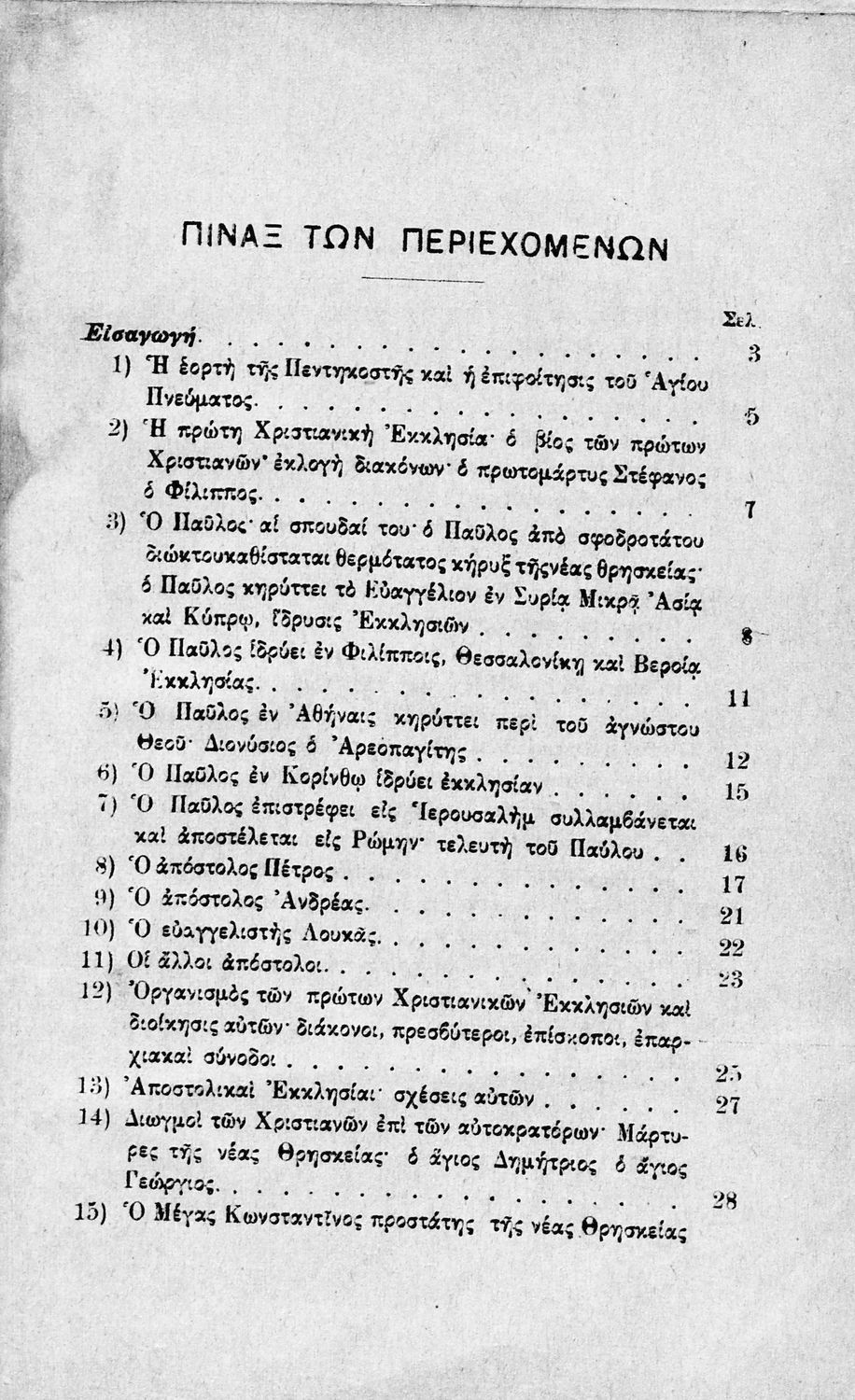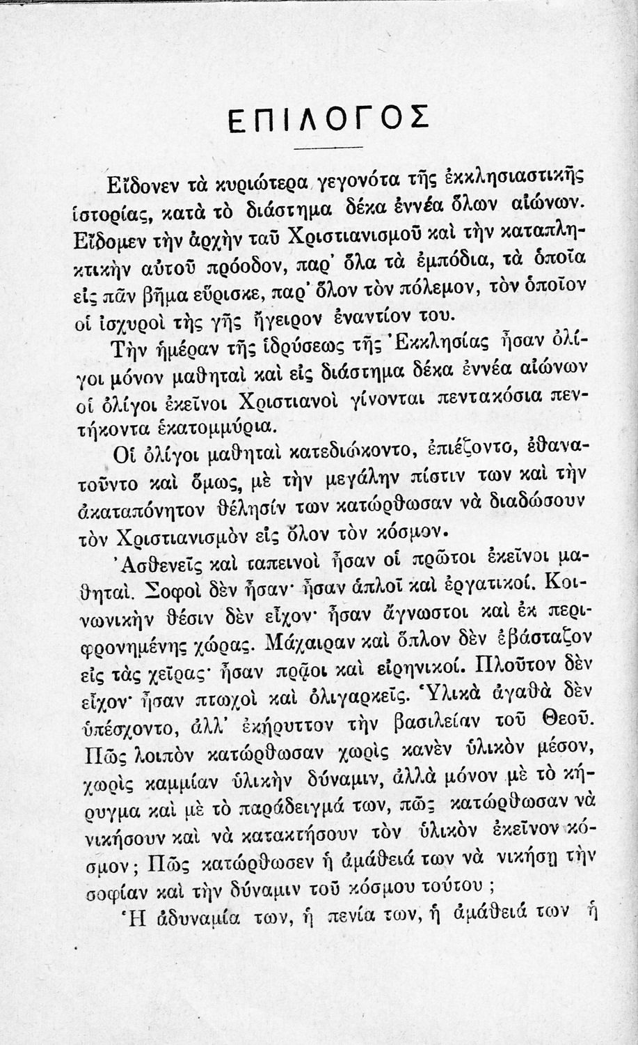Σχολικό εγχειρίδιο Θρησκευτικών. Το βιβλίο συντάχθηκε σύμφωνα με το πρόγραμμα της 1ης Σεπτεμβρίου 1921 του Υπουργείου Εκκλησιαστικών και Δημόσιας Εκπαιδεύσεως. Περιέχει την ιστορία της Εκκλησίας από την ίδρυσή της μέχρι την δημιουργία της Εκκλησίας της Ελλάδας.