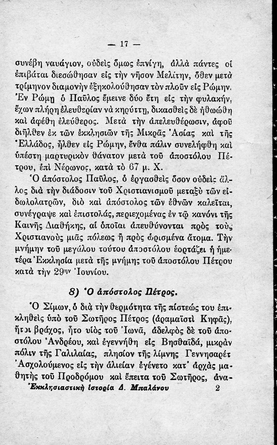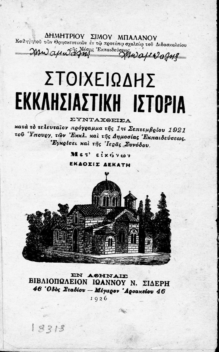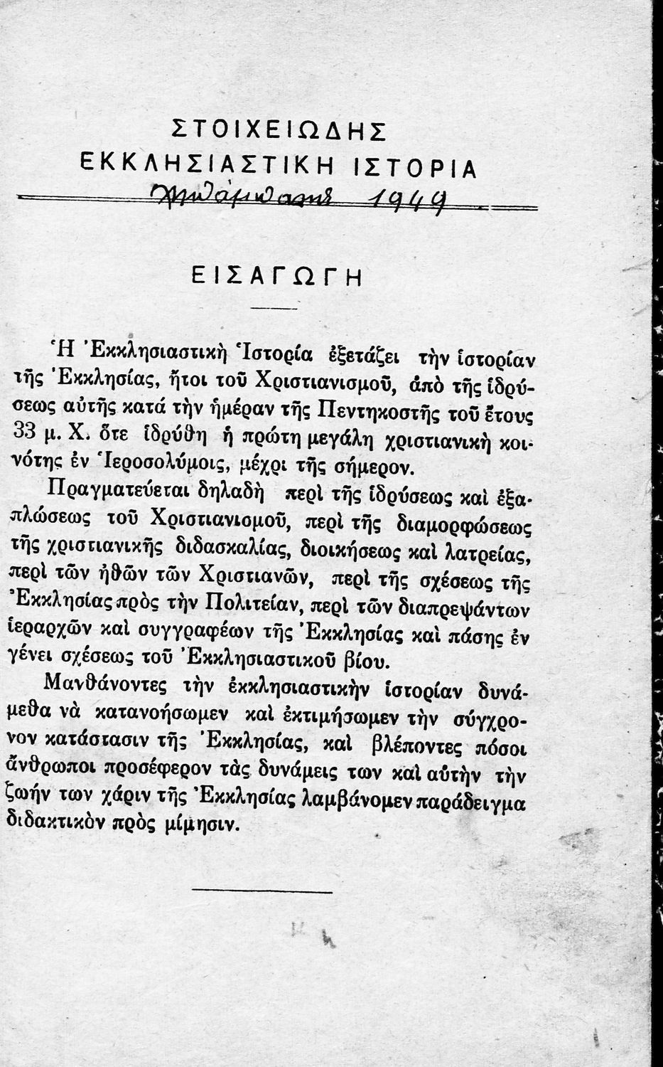 Σχολικό εγχειρίδιο Θρησκευτικών. Το βιβλίο συντάχθηκε σύμφωνα με το πρόγραμμα της 1ης Σεπτεμβρίου 1921 του Υπουργείου Εκκλησιαστικών και Δημόσιας Εκπαιδεύσεως. Περιέχει την ιστορία της Εκκλησίας από την ίδρυσή της μέχρι την δημιουργία της Εκκλησίας της Ελλάδας.