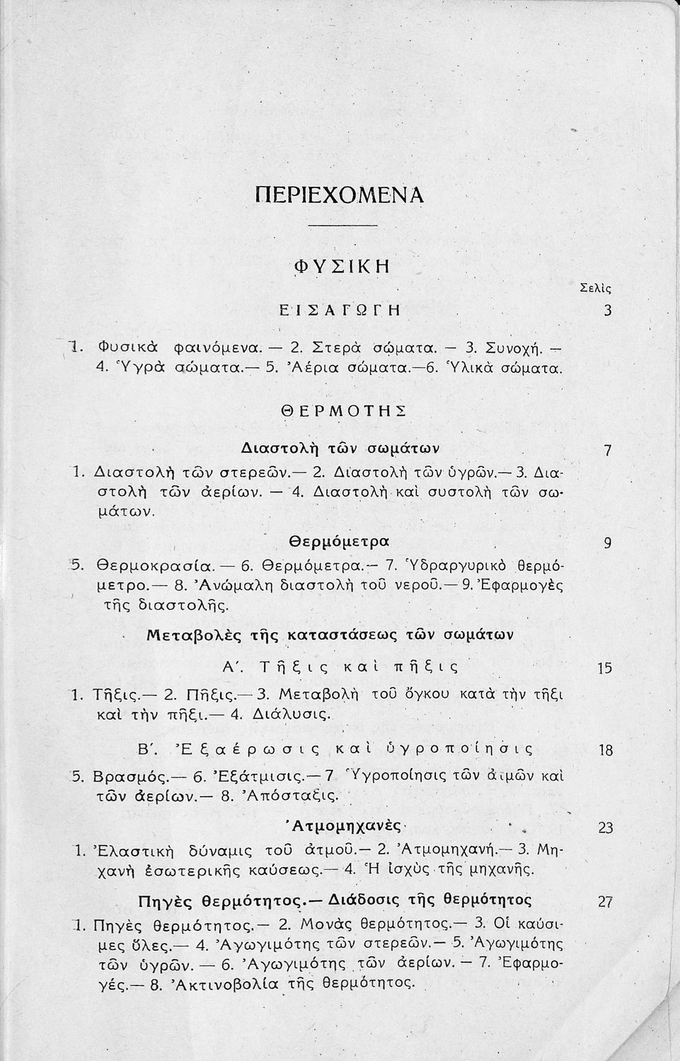 Σχολικό εγχειρίδιο Φυσικής και Χημείας για την Ε΄ τάξη των Δημοτικών σχολείων. Το βιβλίο ξεκινάει με μια εισαγωγή στη Φυσική και αναλύει ζητήματα θερμότητας και μεταβολών της ύλης των στερεών, των υγρών και των αερίων στις μεταβολές της θερμοκρασίας. Το βιβλίο ολοκληρώνει με μια εισαγωγή στα χημικά φαινόμενα και στις ιδιότητες των λιπαρών ουσιών και των μετάλλων.
