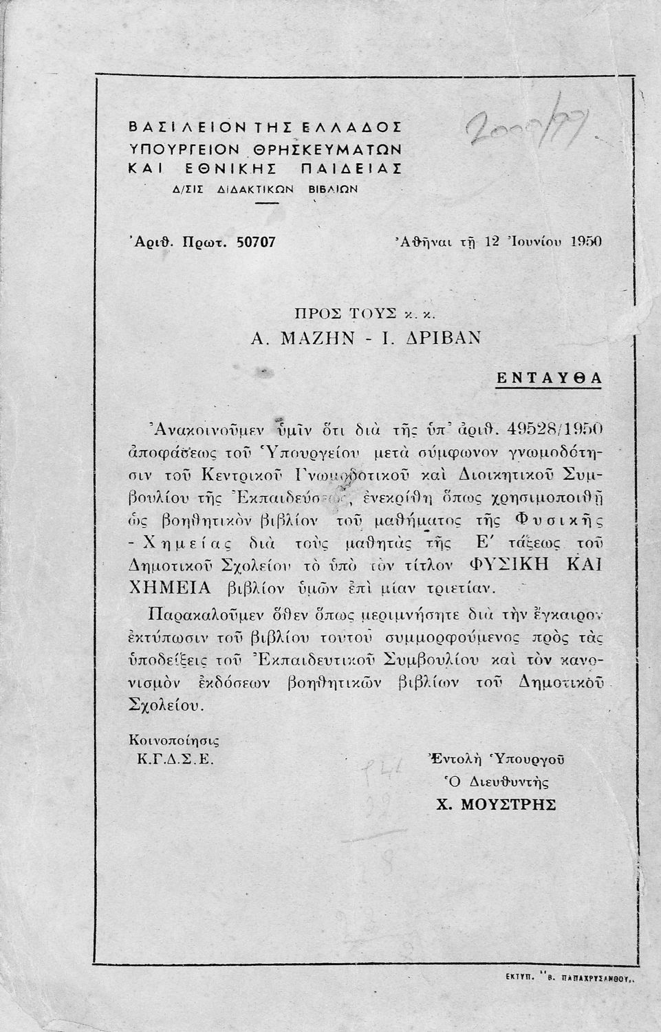 Υπουργική απόφαση / Σύμβαση: 50707/12-7-1950