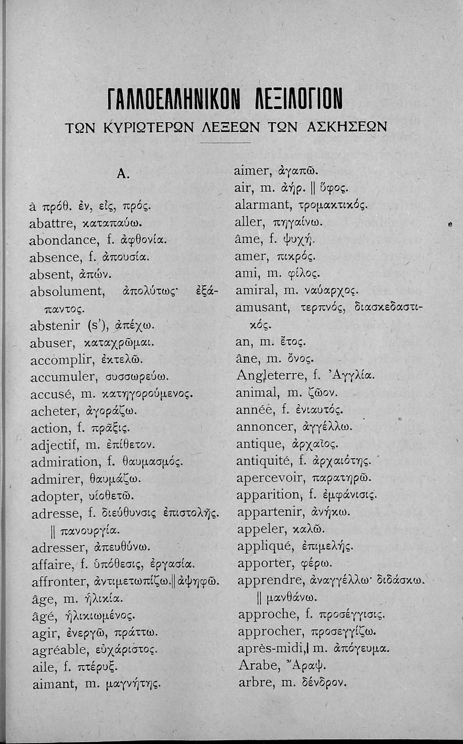 Γραμματική της Γαλλικής γλώσσας για τα Τετρατάξια Γυμνάσια, τη Γ΄ τάξη των Αστικών Σχολείων Θηλέων και τα Διδασκαλεία της Δημοτικής Εκπαίδευσης που περιλαμβάνει θεωρία, ασκήσεις και λεξιλόγιο.