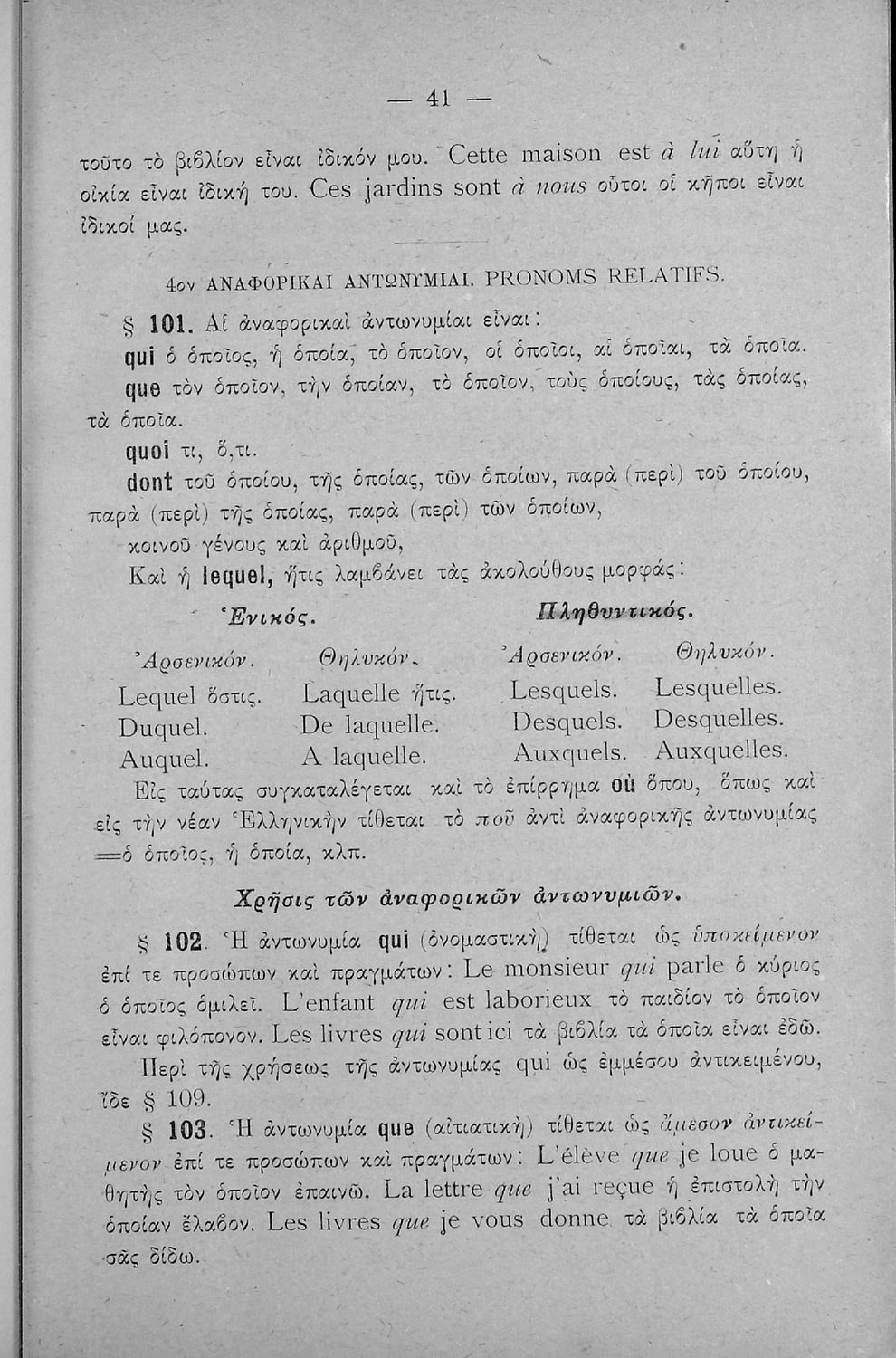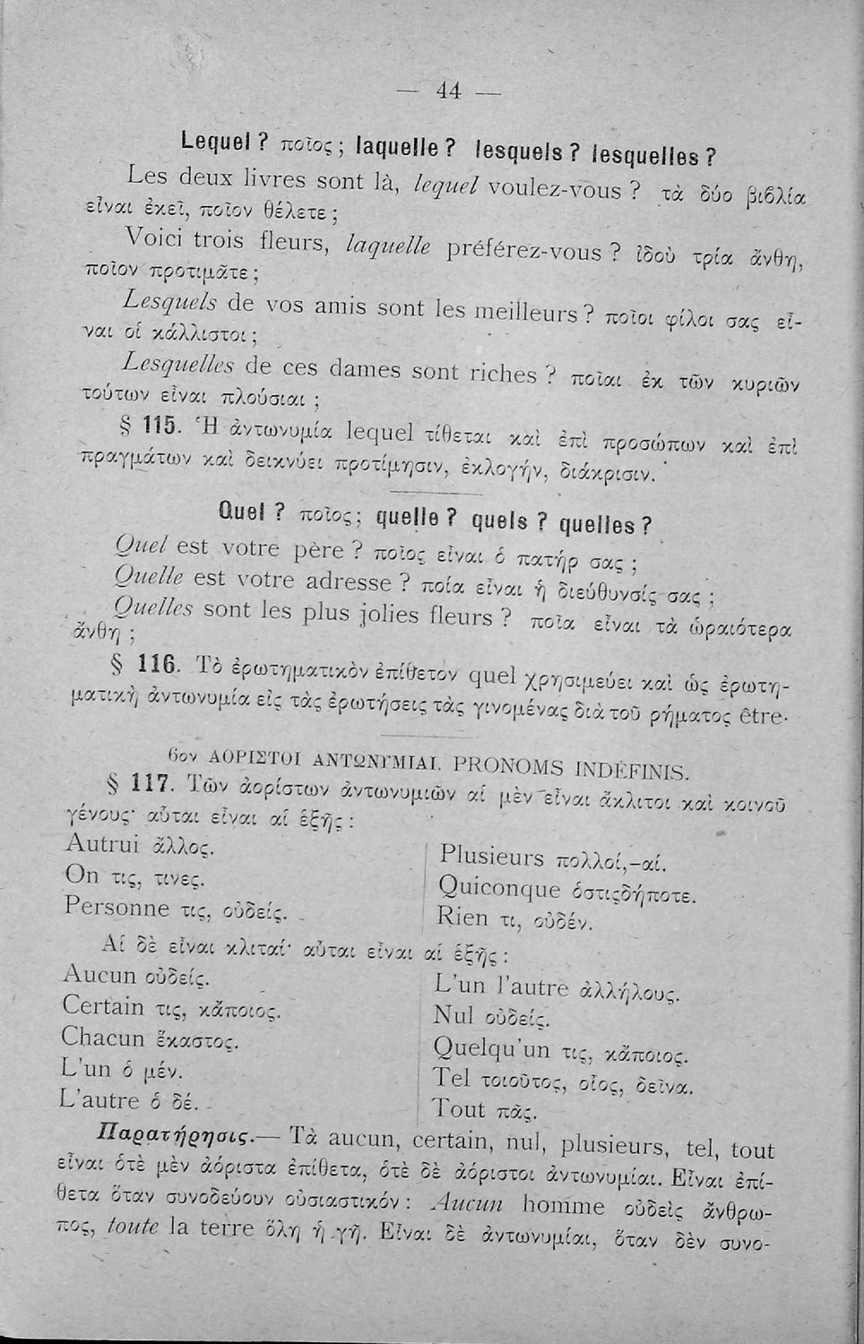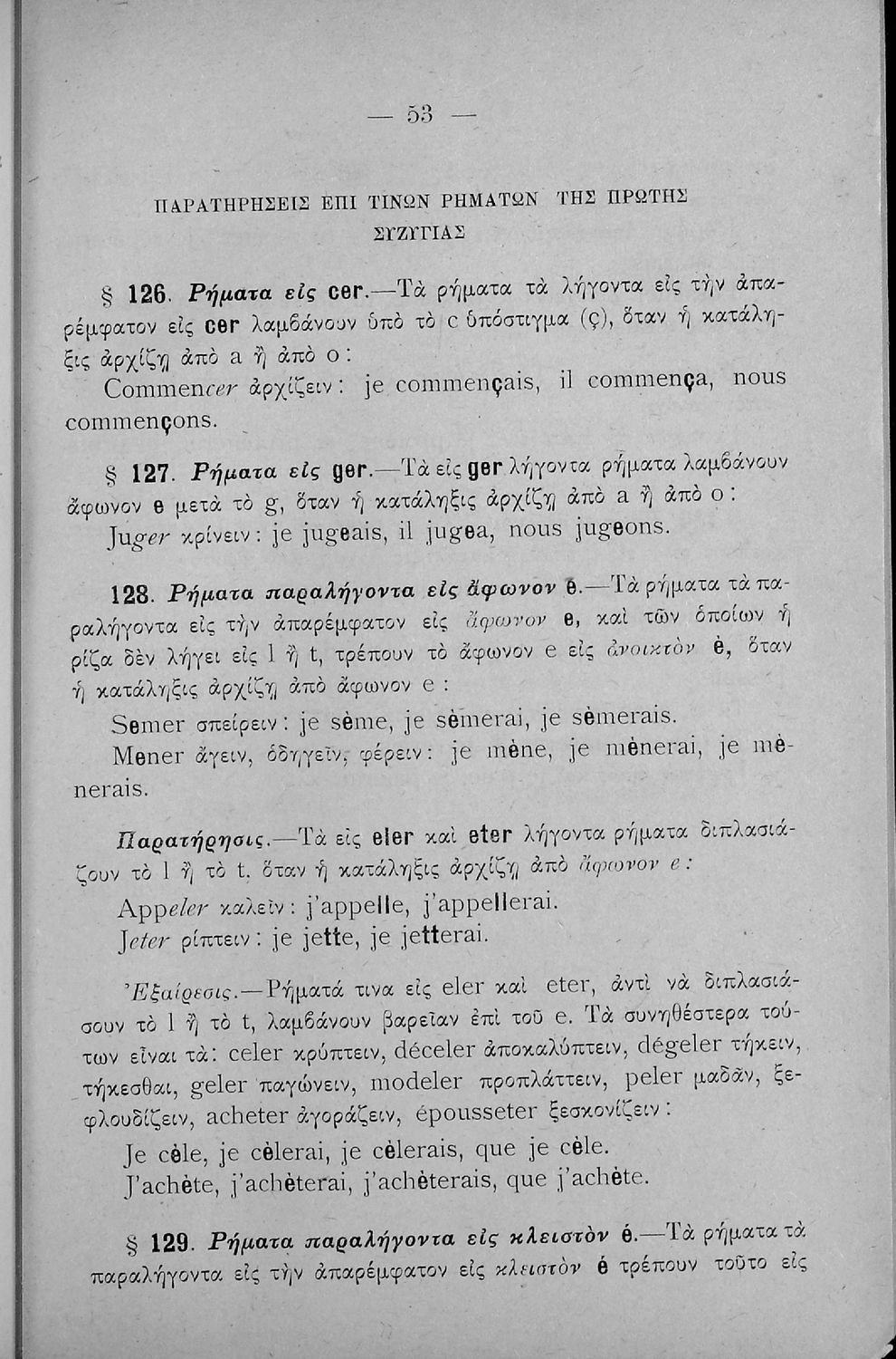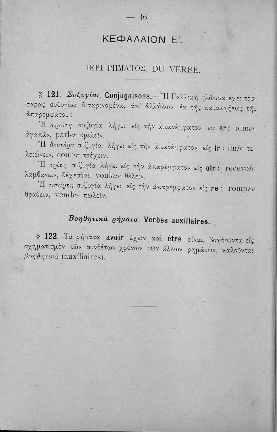 Γραμματική της Γαλλικής γλώσσας για τα Τετρατάξια Γυμνάσια, τη Γ΄ τάξη των Αστικών Σχολείων των Θηλέων και τα Διδασκαλεία της Δημοτικής Εκπαίδευσης που περιλαμβάνει θεωρία, ασκήσεις και λεξιλόγιο.