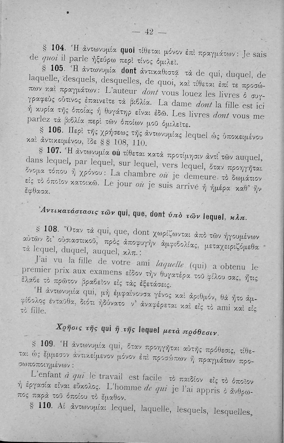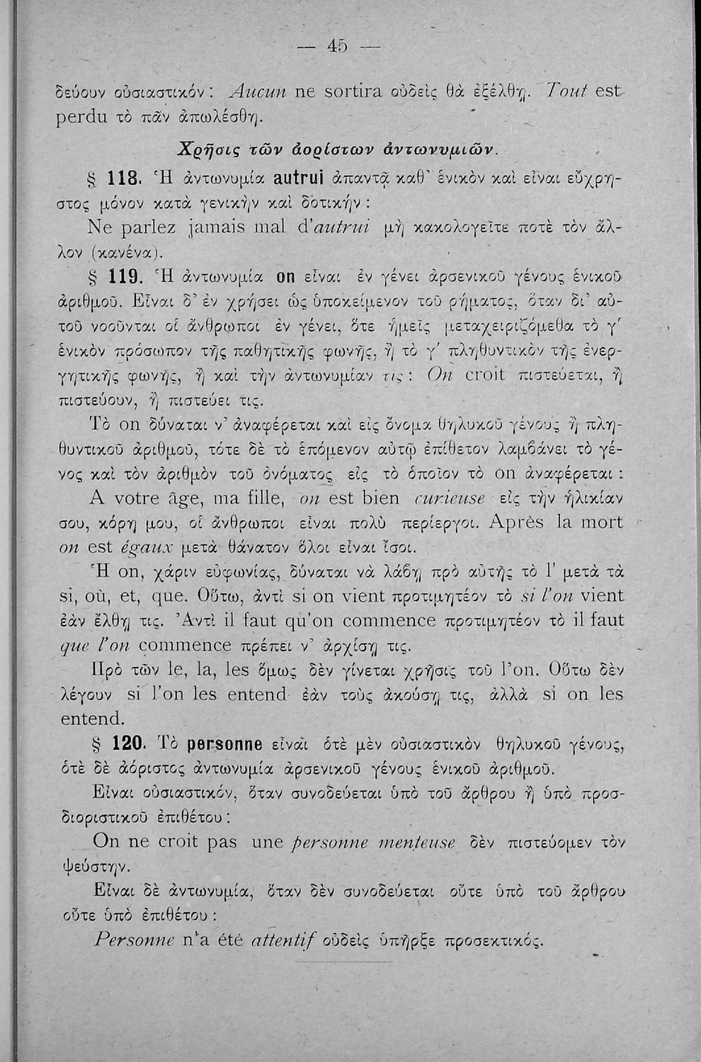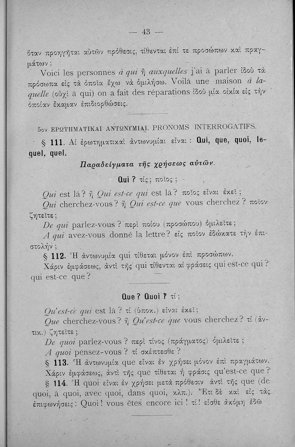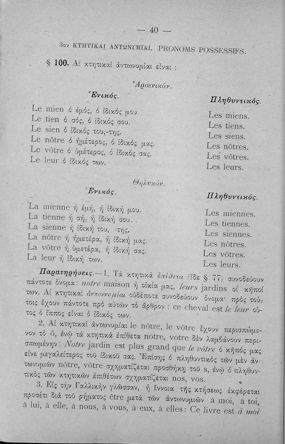 Γραμματική της Γαλλικής γλώσσας για τα Τετρατάξια Γυμνάσια, τη Γ΄ τάξη των Αστικών Σχολείων των Θηλέων και τα Διδασκαλεία της Δημοτικής Εκπαίδευσης που περιλαμβάνει θεωρία, ασκήσεις και λεξιλόγιο.