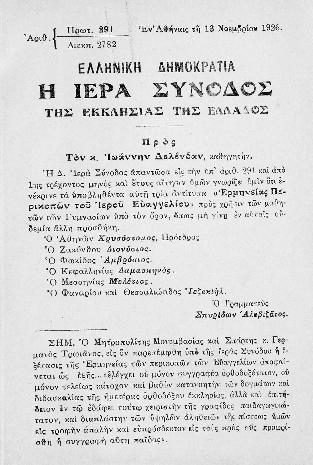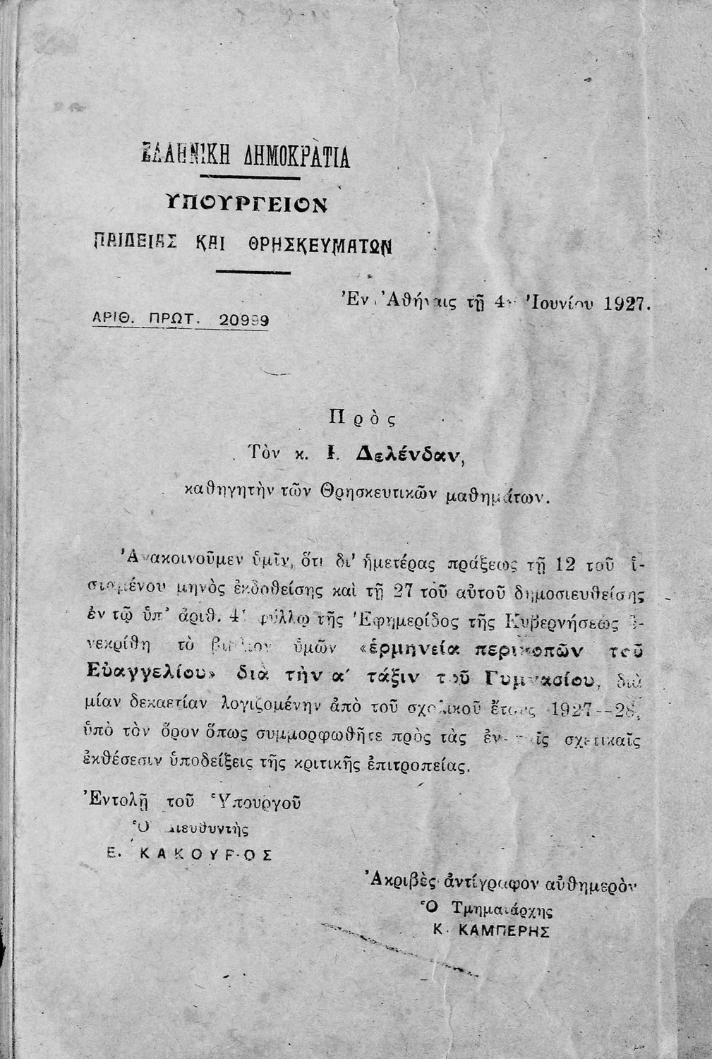 Σχολικό εγχειρίδιο Θρησκευτικών για την Γ΄ Γυμνασίου, τα Διδασκαλεία και τα Ανώτερα Παρθεναγωγεία που περιέχει περικοπές από τα βιβλία της Καινής Διαθήκης και ερμηνευτικές σημειώσεις.