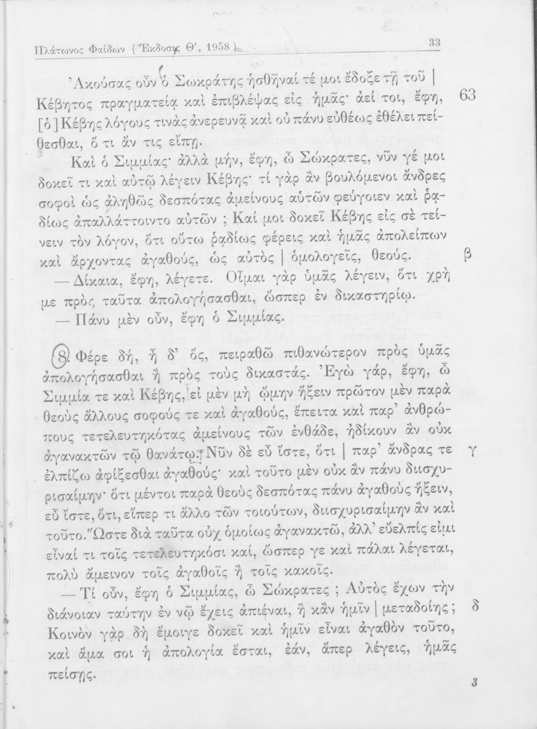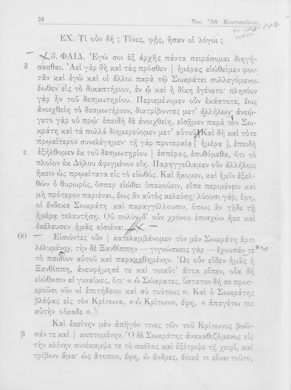 Σχολικό εγχειρίδιο για τις Τάξεις του Γυμνασίου για το μάθημα των Αρχαίων Ελληνικών. Περιλαμβάνει αποσπάσματα του αρχαίου κειμένου από τους διαλόγους του Πλάτωνα. Περιέχει μετάφραση ερμηνευτικά, πραγματολογικά σχόλια και λεξιλογικές παρατηρήσεις του συγγραφέα.