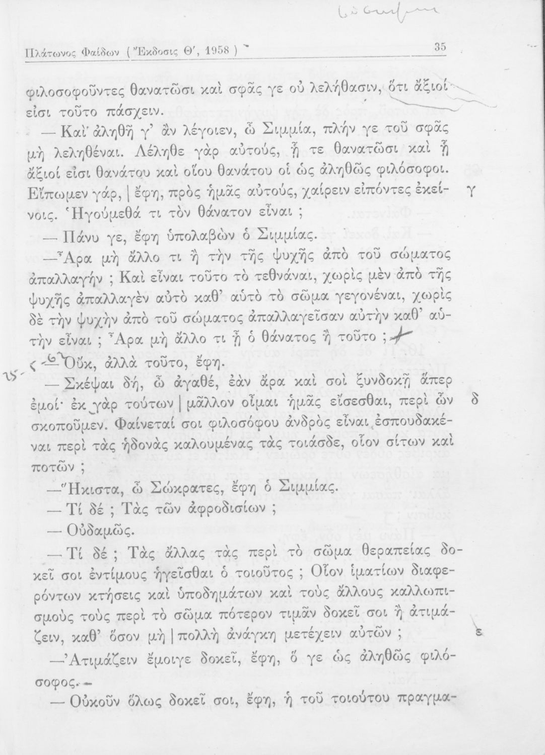 Σχολικό εγχειρίδιο Αρχαίων Ελληνικών Γυμνασίου που περιλαμβάνει αποσπάσματα από τους διαλόγους του Πλάτωνα, ερμηνευτικά και πραγματολογικά σχόλια και λεξιλογικές παρατηρήσεις.