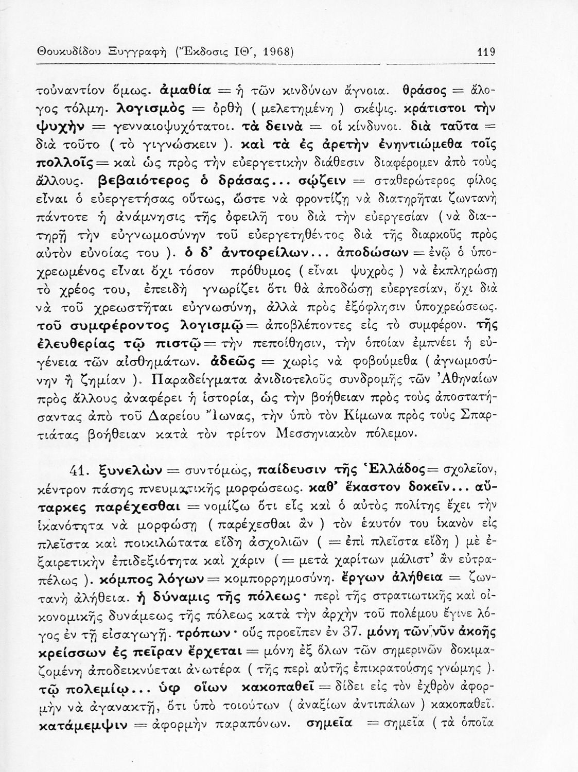 Παρουσίαση περιεχομένου: Σχολικό εγχειρίδιο Αρχαίων Ελληνικών Γυμνασίου που περιέχει εισαγωγή στη ζωή και το έργο του Θουκυδίδη, αποσπάσματα από τα Πλαταιϊκά, τα Λεσβιακά και τον Επιτάφιο του Περικλή και ερμηνευτικές σημειώσεις. Φέρει το σύμβολο της δικτατορίας.