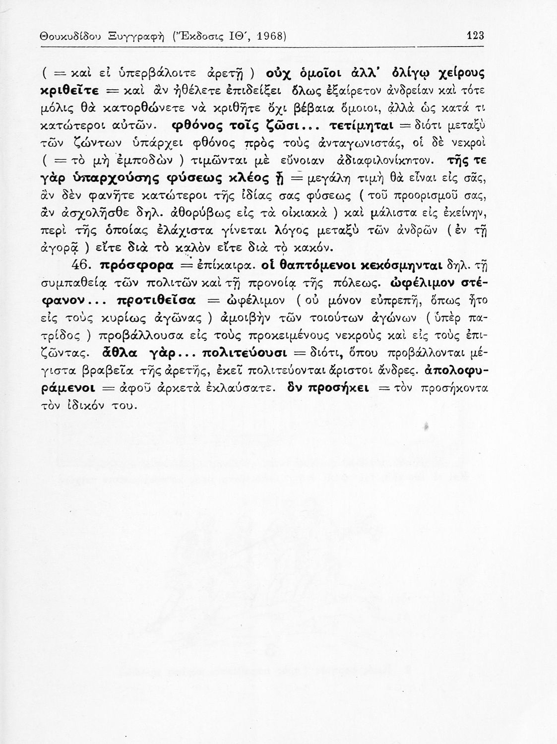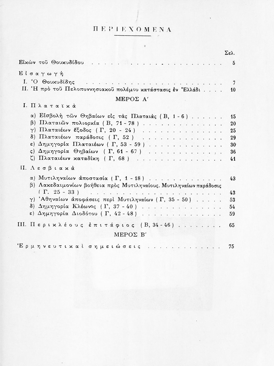 Σχολικό εγχειρίδιο Αρχαίων Ελληνικών Γυμνασίου που περιέχει εισαγωγή στη ζωή και το έργο του Θουκυδίδη, αποσπάσματα από τα Πλαταιϊκά, τα Λεσβιακά και τον Επιτάφιο του Περικλή και ερμηνευτικές σημειώσεις. Φέρει το σύμβολο της δικτατορίας.