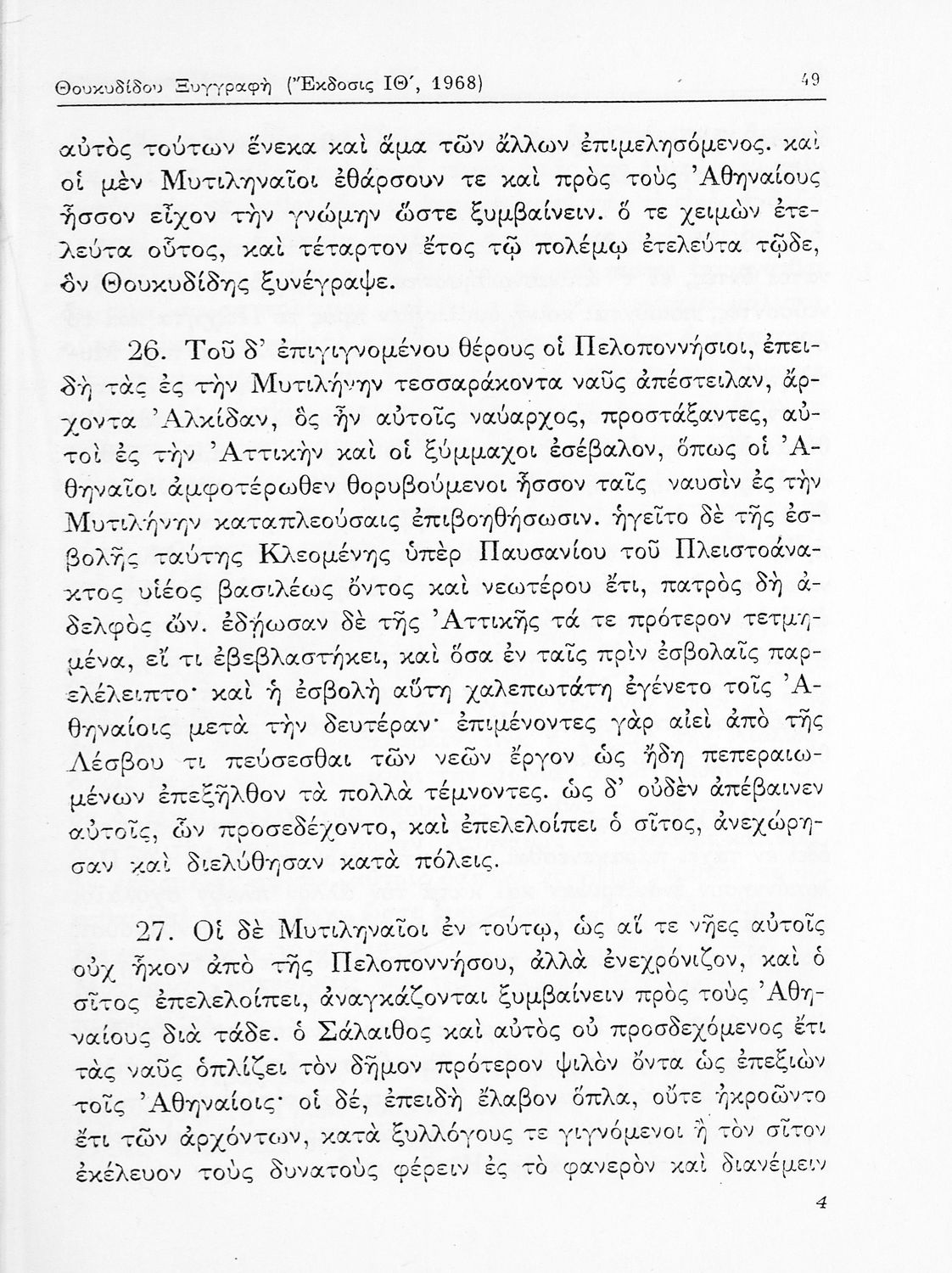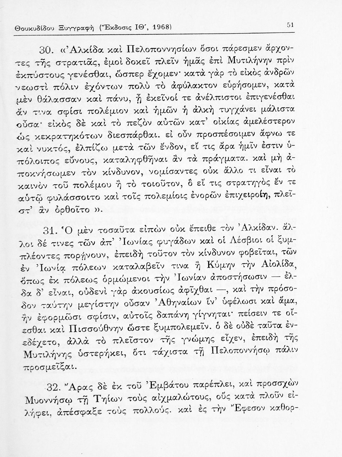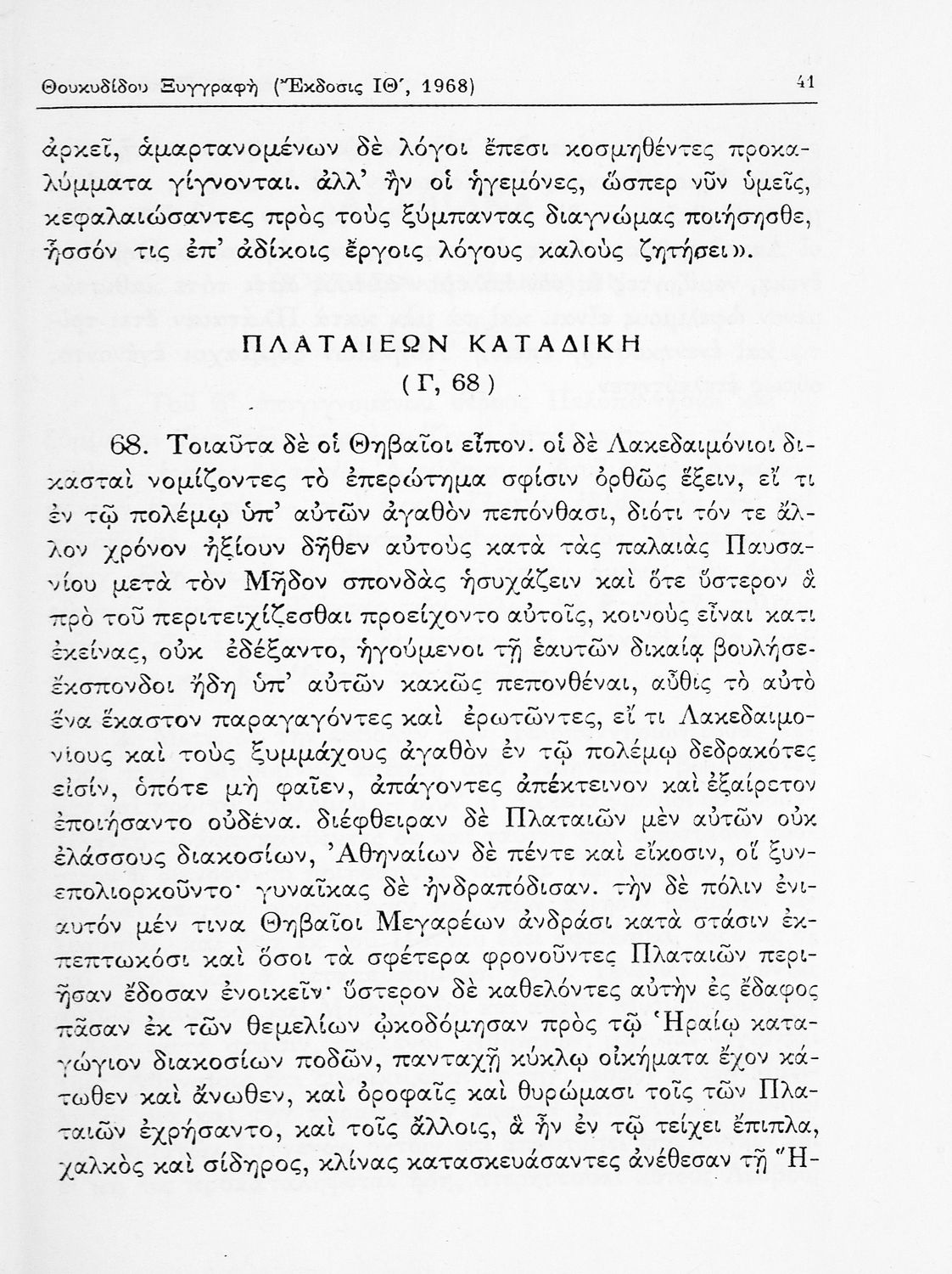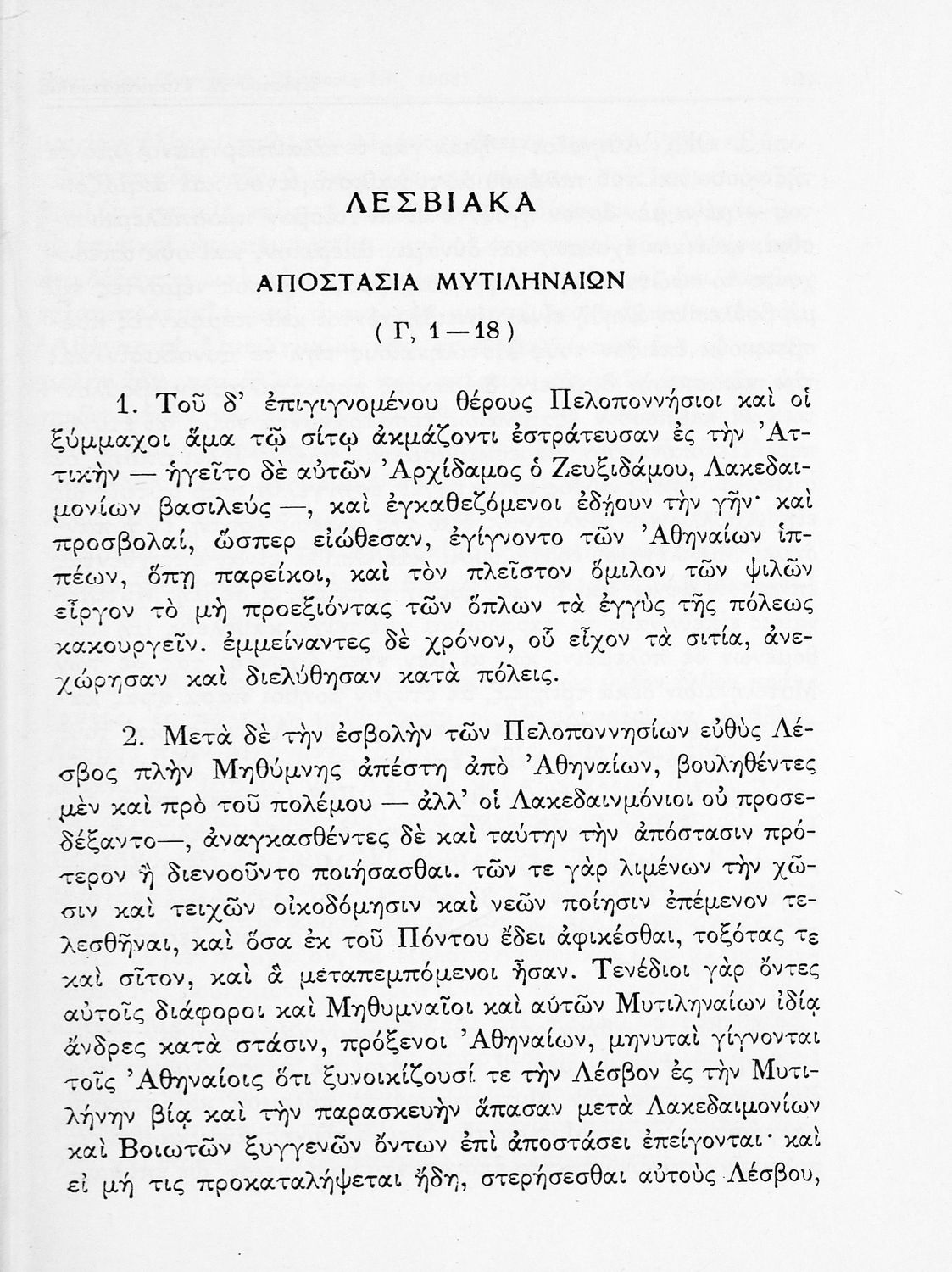 Σχολικό εγχειρίδιο Αρχαίων Ελληνικών Γυμνασίου που περιέχει εισαγωγή στη ζωή και το έργο του Θουκυδίδη, αποσπάσματα από τα Πλαταιϊκά, τα Λεσβιακά και τον Επιτάφιο του Περικλή και ερμηνευτικές σημειώσεις. Φέρει το σύμβολο της δικτατορίας.