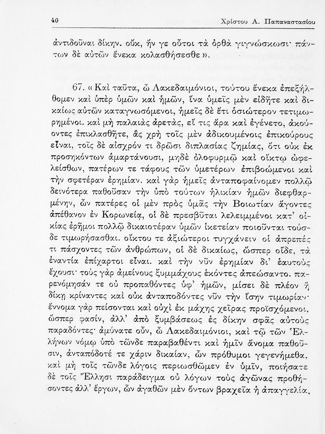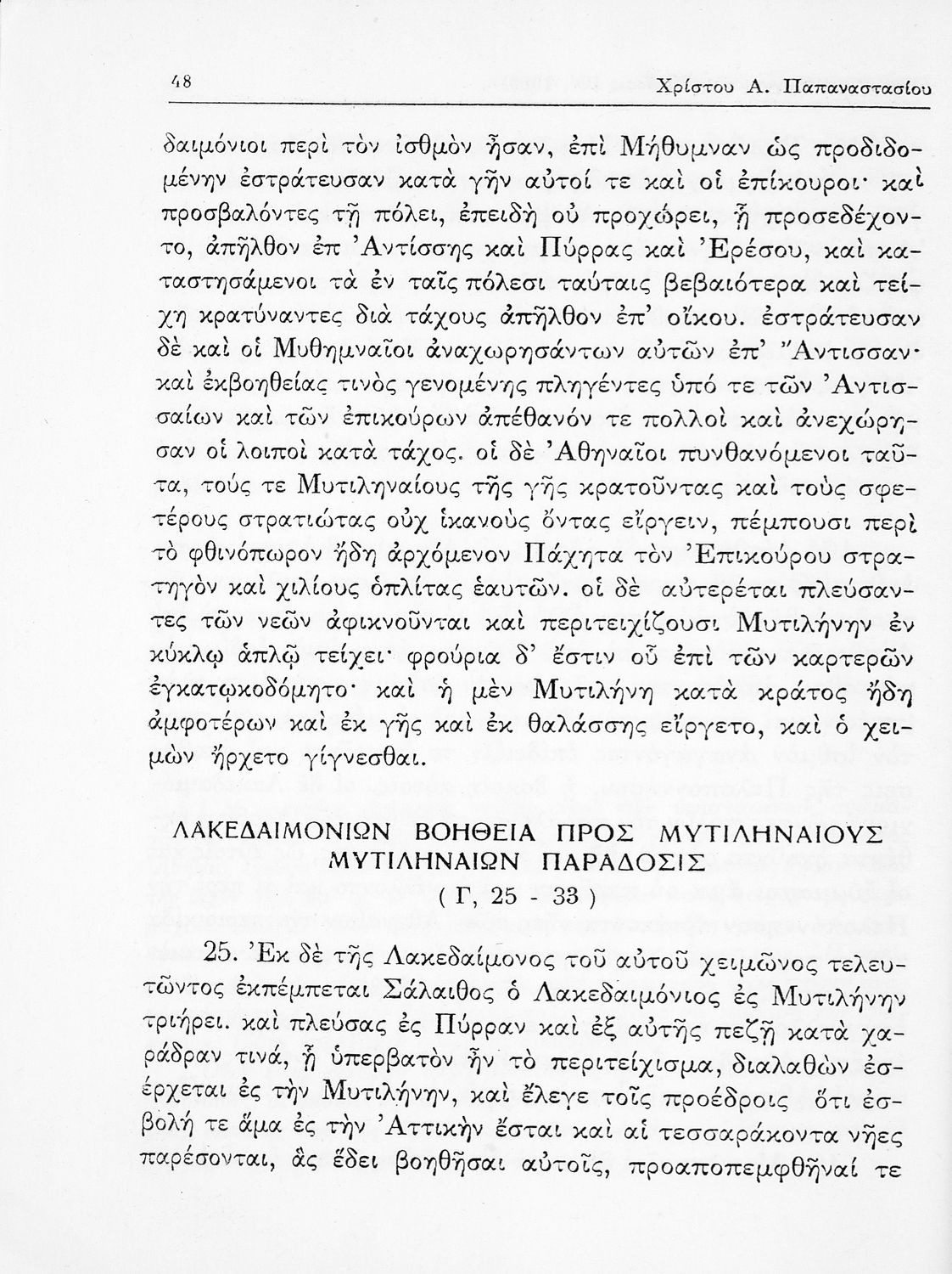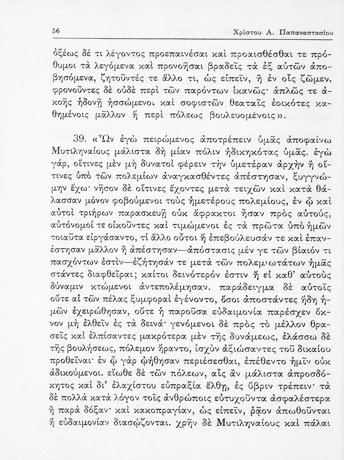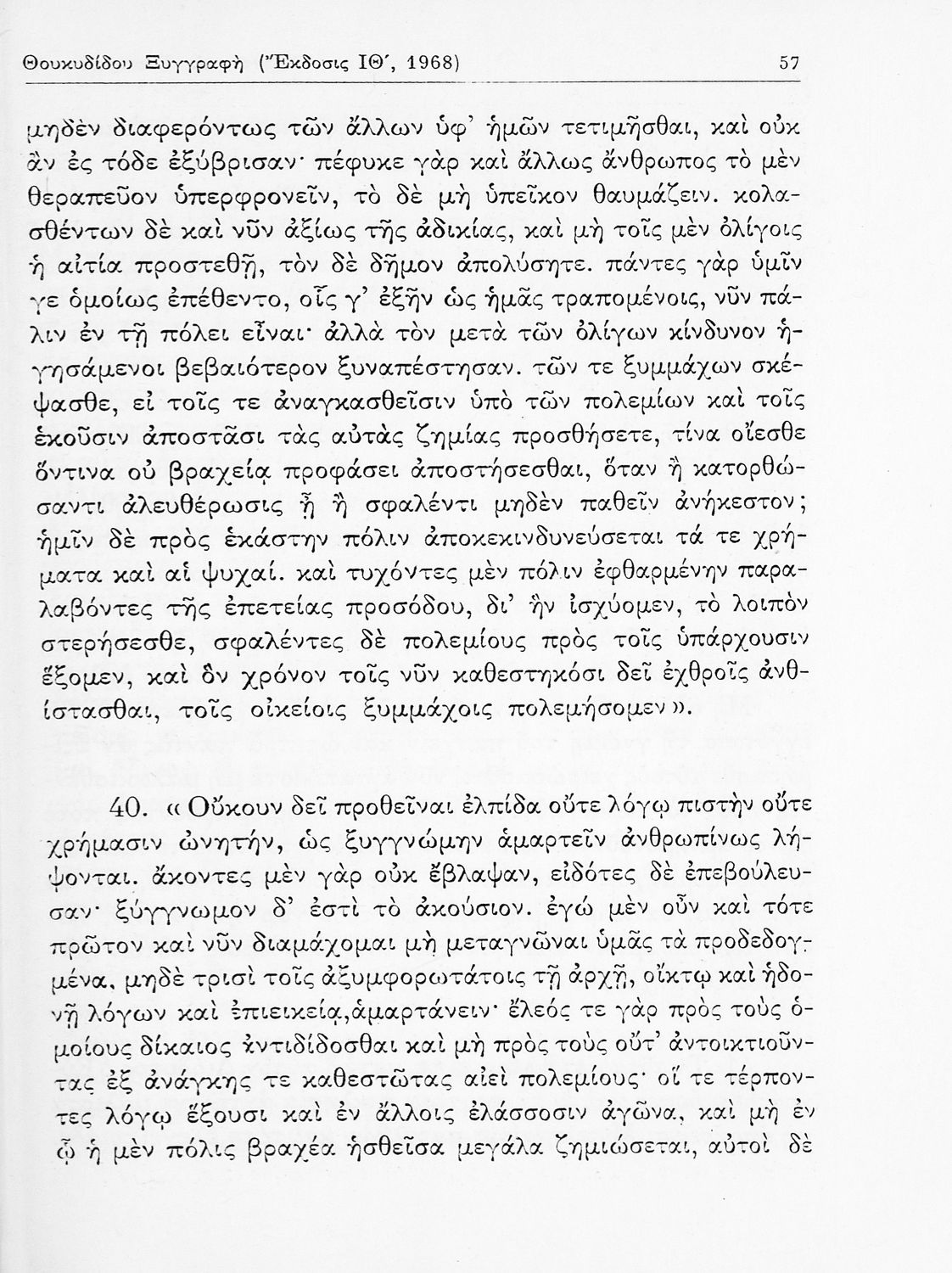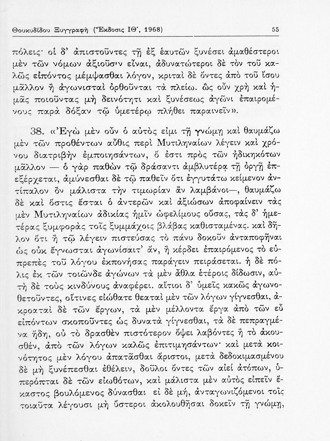 Σχολικό εγχειρίδιο Αρχαίων Ελληνικών Γυμνασίου που περιέχει εισαγωγή στη ζωή και το έργο του Θουκυδίδη, αποσπάσματα από τα Πλαταιϊκά, τα Λεσβιακά και τον Επιτάφιο του Περικλή και ερμηνευτικές σημειώσεις. Φέρει το σύμβολο της δικτατορίας.