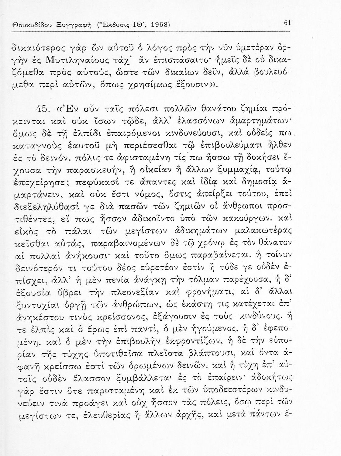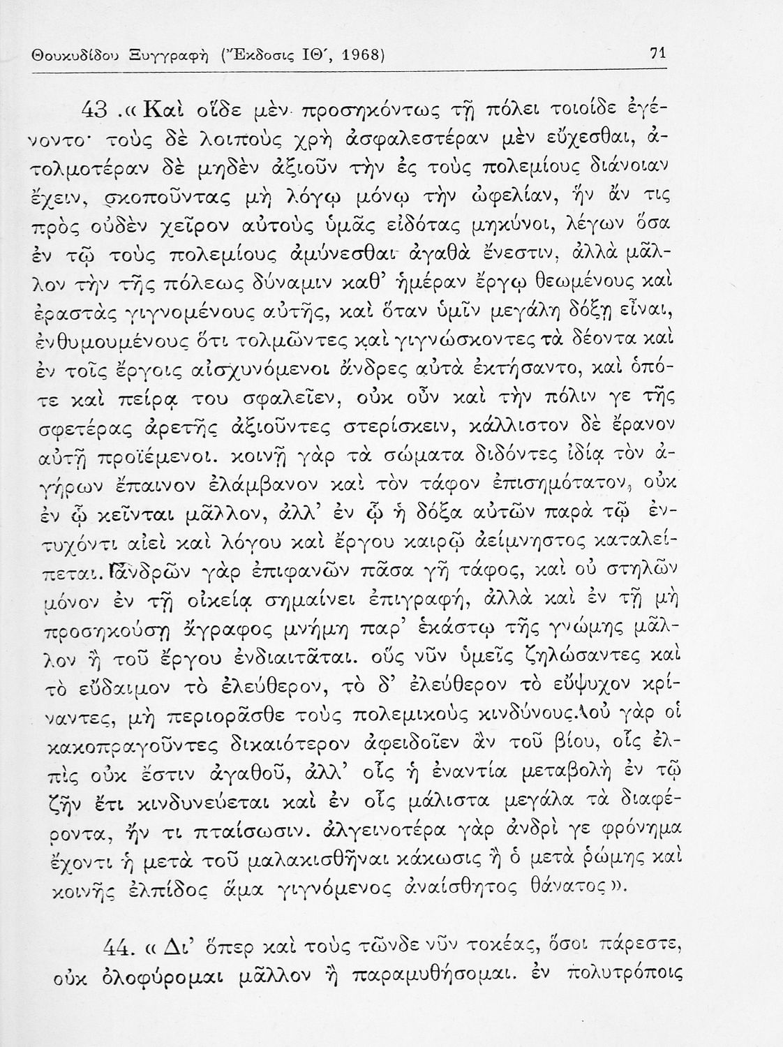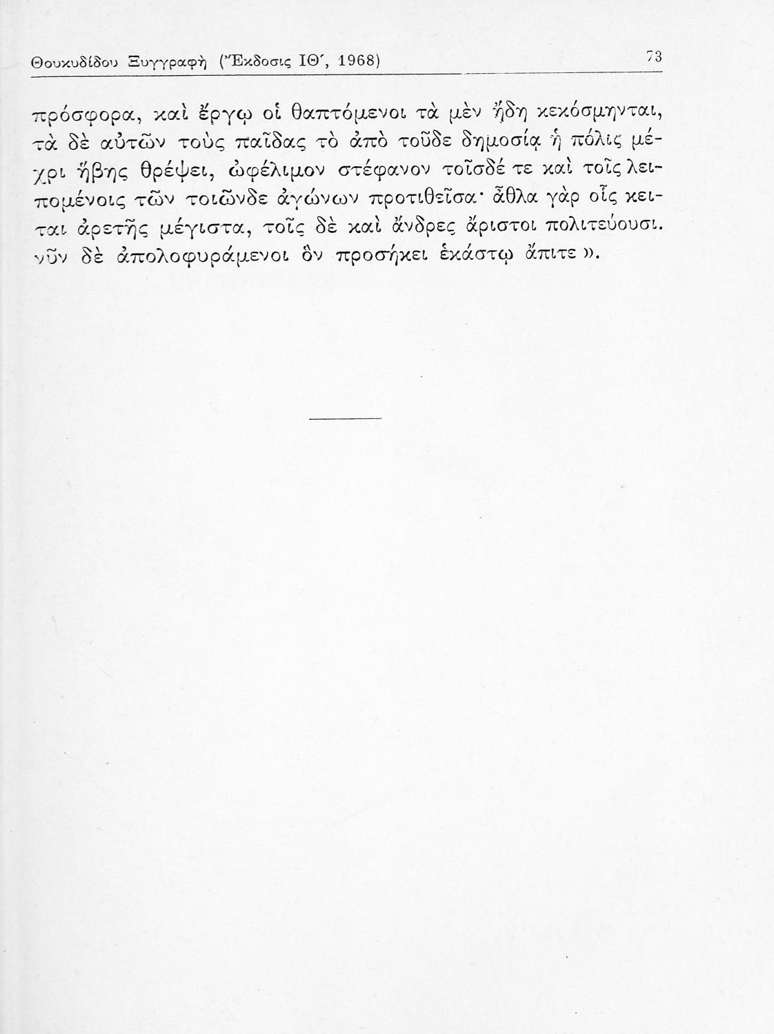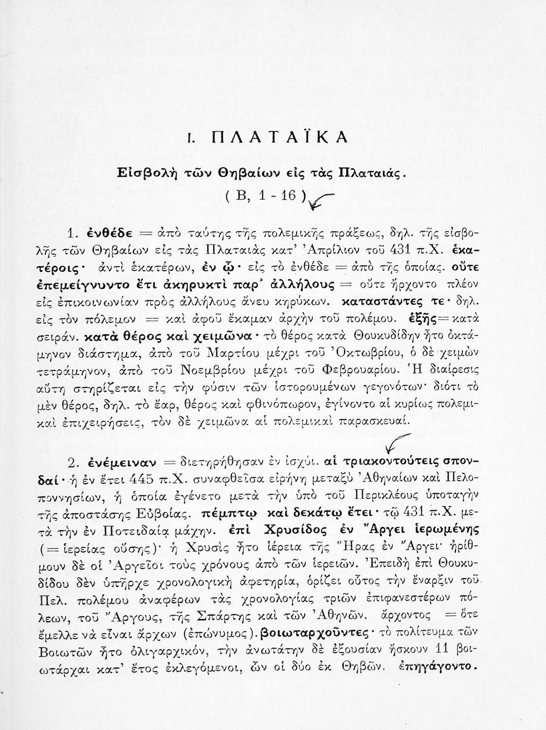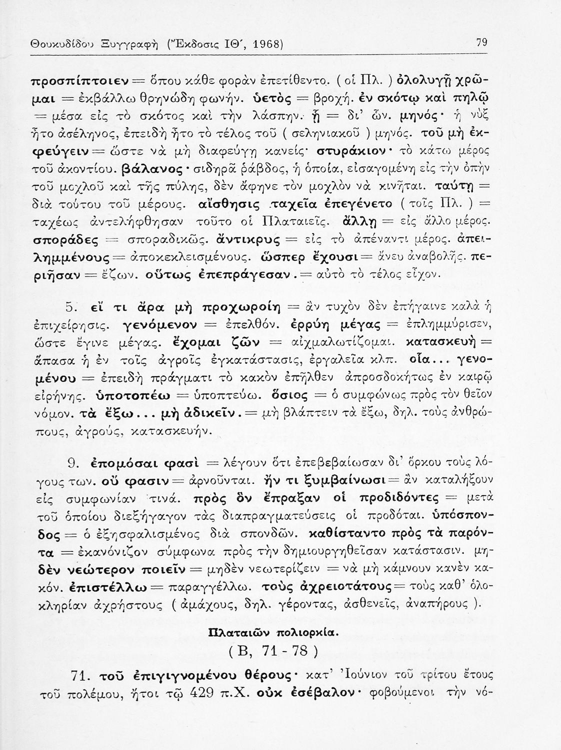 Σχολικό εγχειρίδιο Αρχαίων Ελληνικών Γυμνασίου που περιέχει εισαγωγή στη ζωή και το έργο του Θουκυδίδη, αποσπάσματα από τα Πλαταιϊκά, τα Λεσβιακά και τον Επιτάφιο του Περικλή και ερμηνευτικές σημειώσεις. Φέρει το σύμβολο της δικτατορίας.