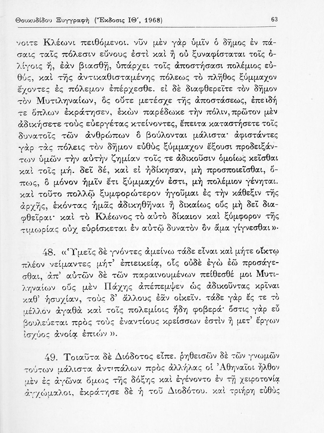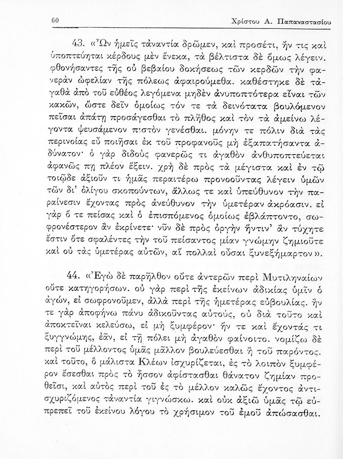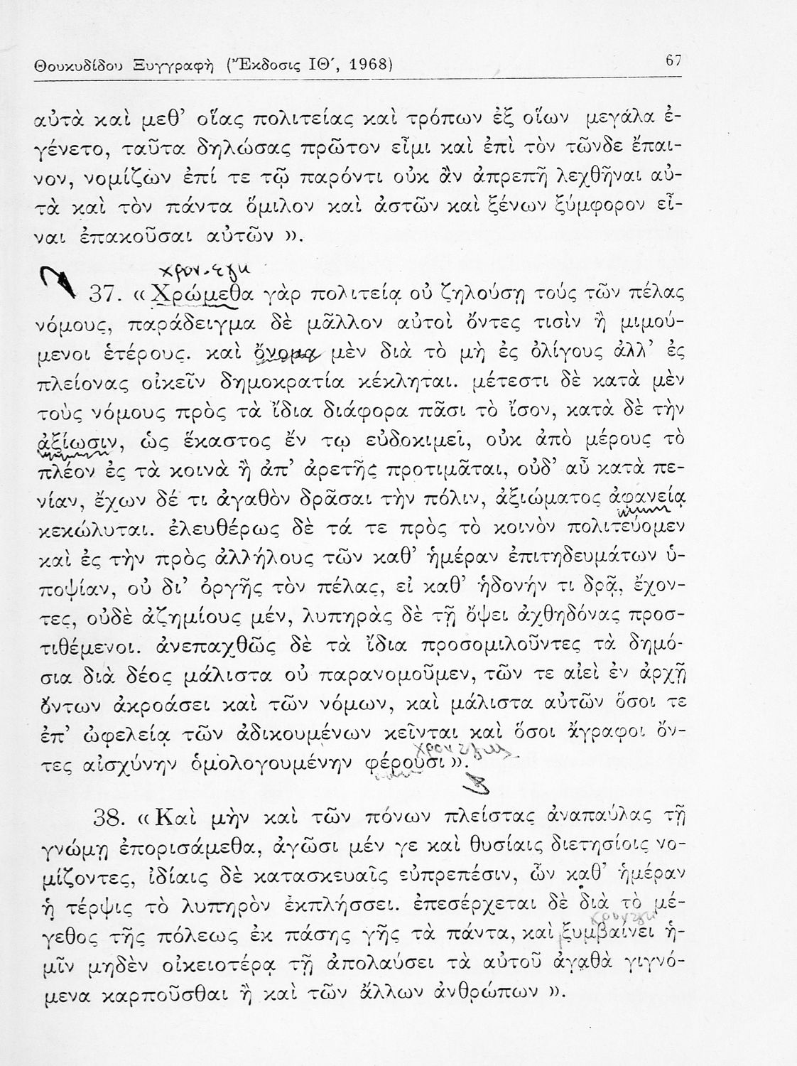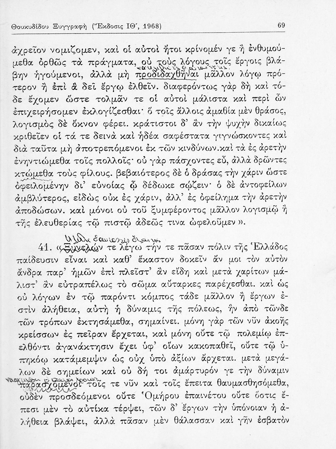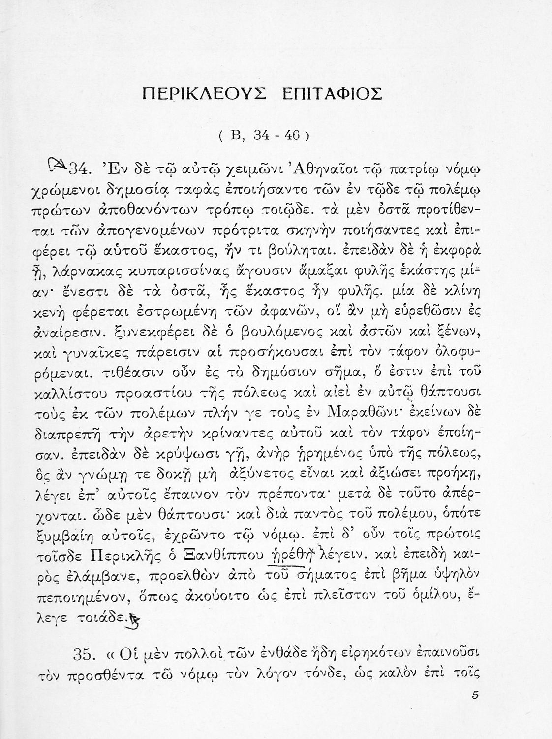 Σχολικό εγχειρίδιο Αρχαίων Ελληνικών Γυμνασίου που περιέχει εισαγωγή στη ζωή και το έργο του Θουκυδίδη, αποσπάσματα από τα Πλαταιϊκά, τα Λεσβιακά και τον Επιτάφιο του Περικλή και ερμηνευτικές σημειώσεις. Φέρει το σύμβολο της δικτατορίας.