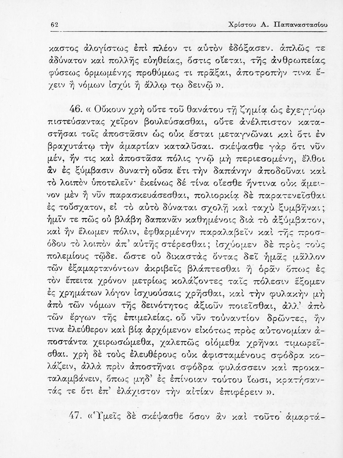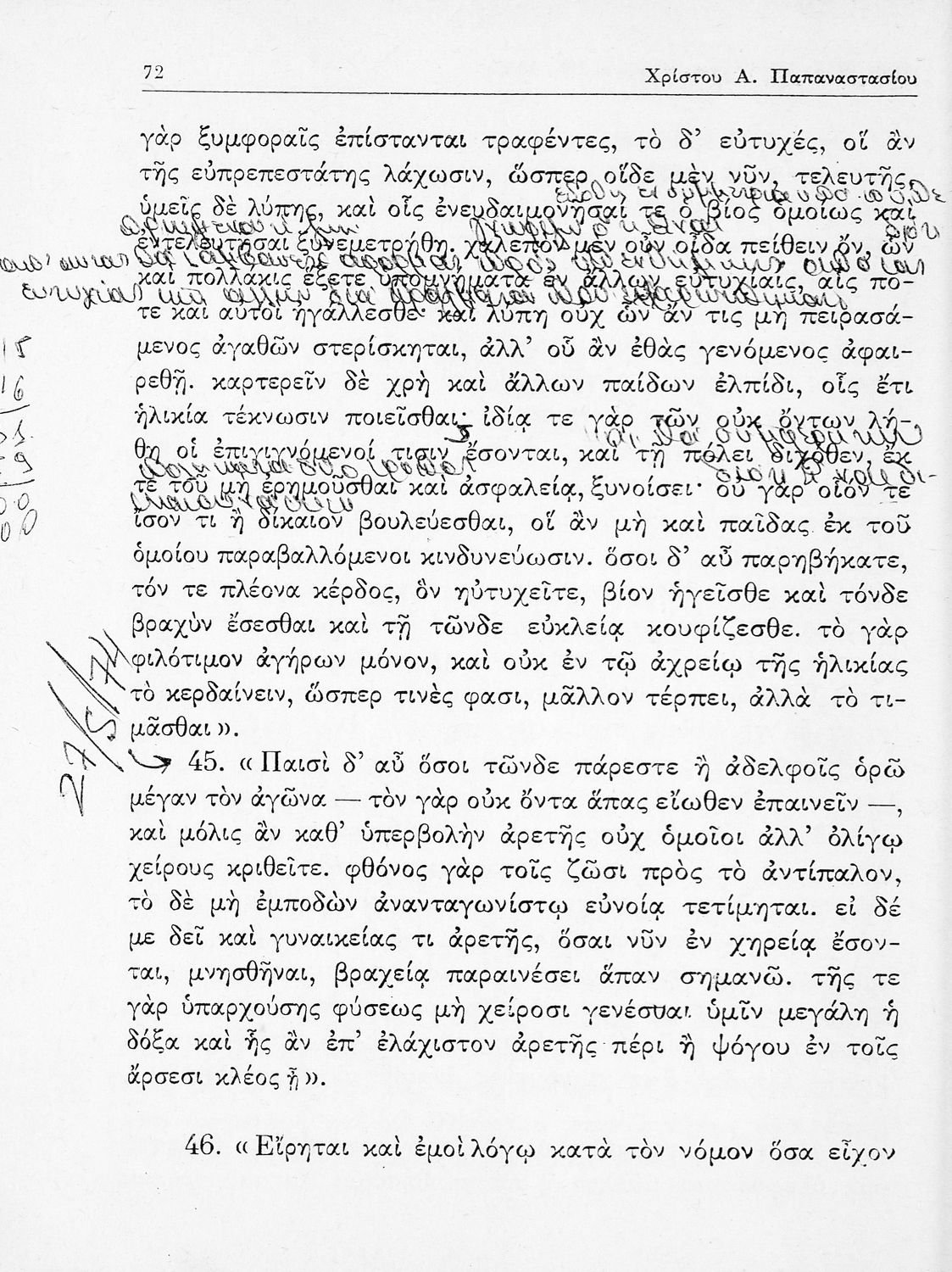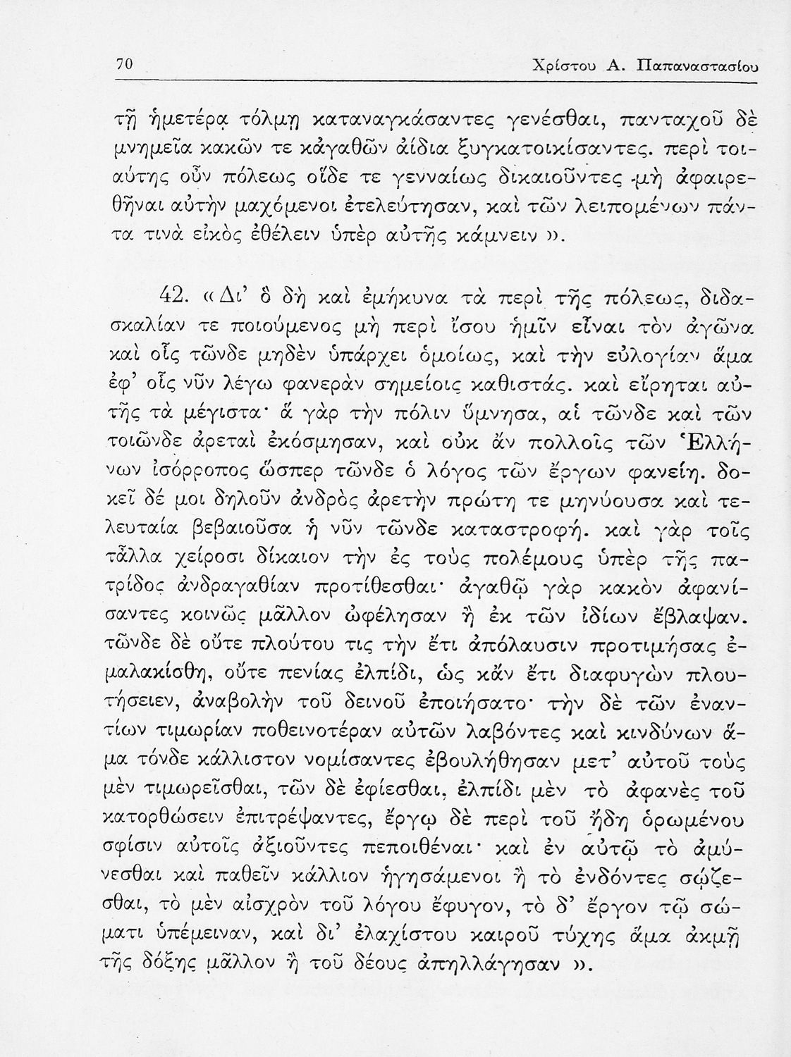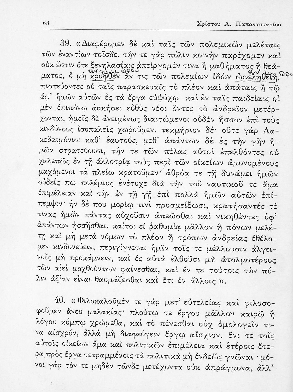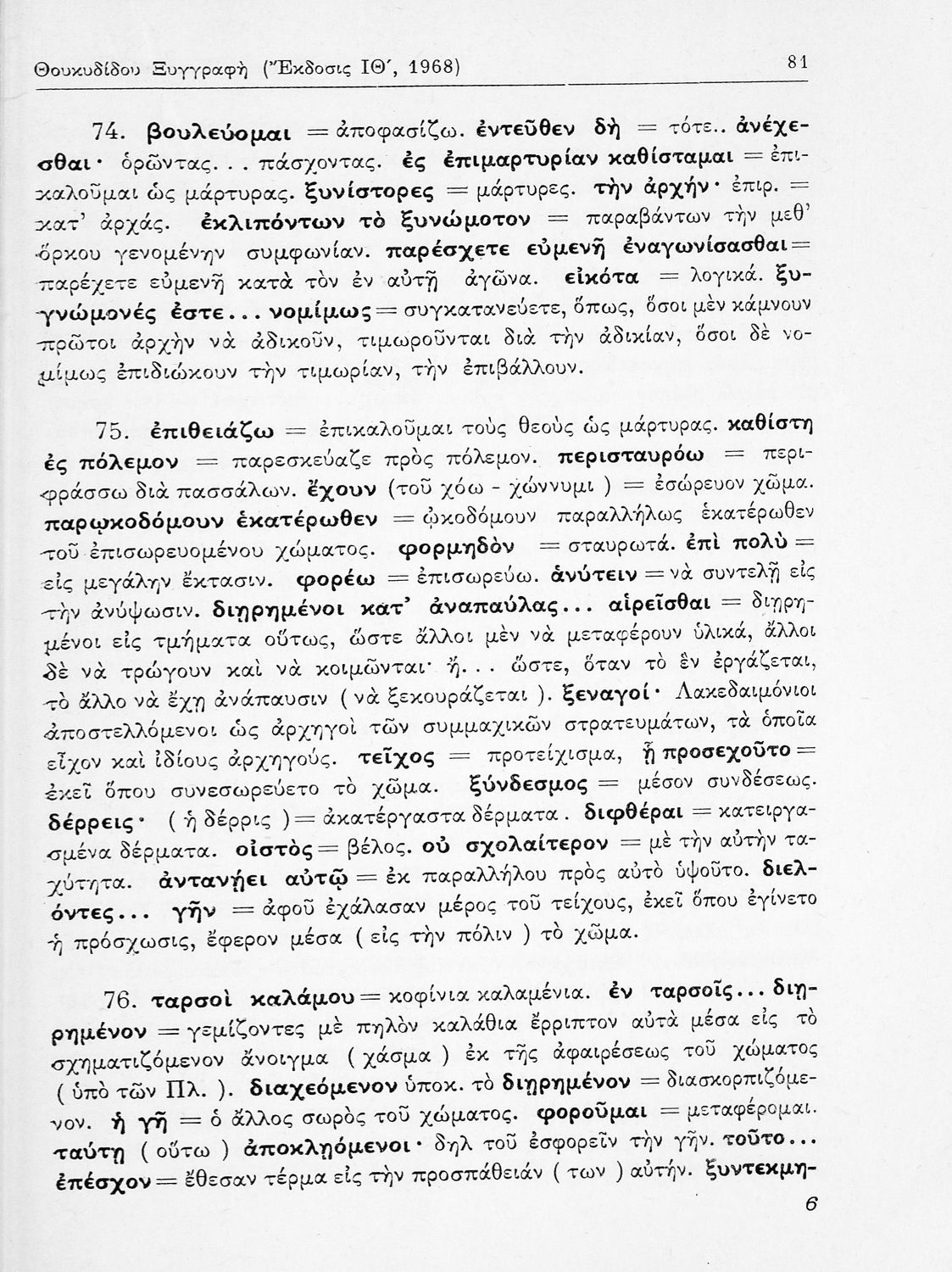 Σχολικό εγχειρίδιο Αρχαίων Ελληνικών Γυμνασίου που περιέχει εισαγωγή στη ζωή και το έργο του Θουκυδίδη, αποσπάσματα από τα Πλαταιϊκά, τα Λεσβιακά και τον Επιτάφιο του Περικλή και ερμηνευτικές σημειώσεις. Φέρει το σύμβολο της δικτατορίας.