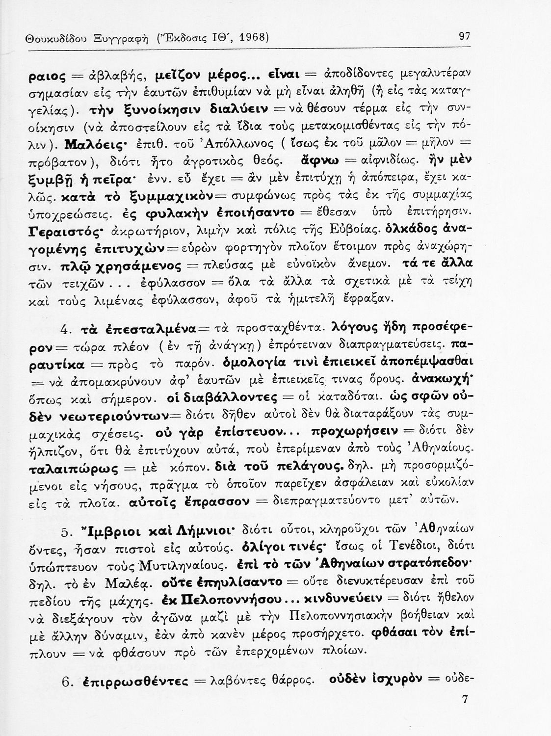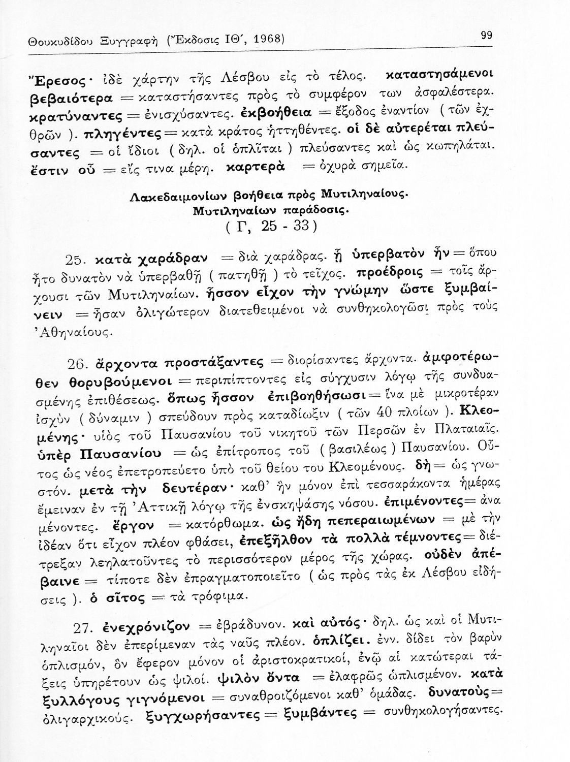 Σχολικό εγχειρίδιο Αρχαίων Ελληνικών Γυμνασίου που περιέχει εισαγωγή στη ζωή και το έργο του Θουκυδίδη, αποσπάσματα από τα Πλαταιϊκά, τα Λεσβιακά και τον Επιτάφιο του Περικλή και ερμηνευτικές σημειώσεις. Φέρει το σύμβολο της δικτατορίας.