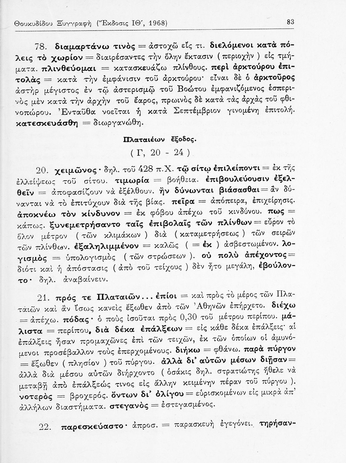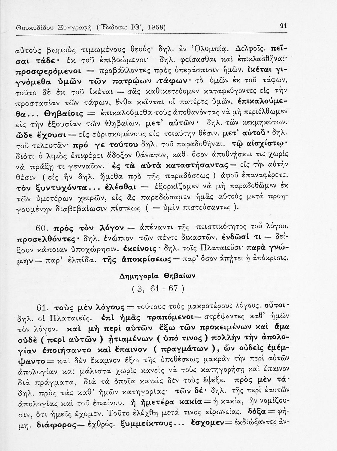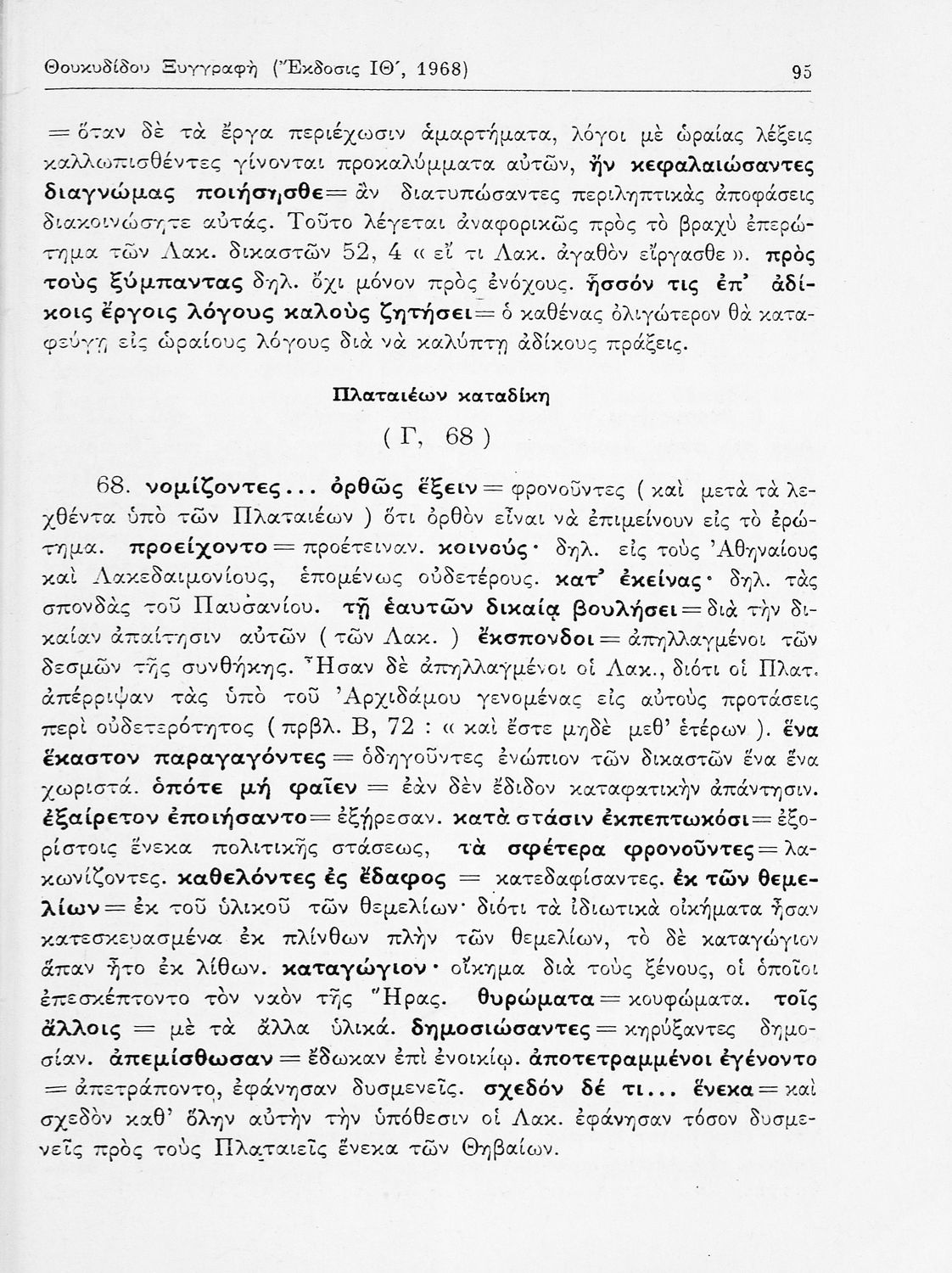 Παρουσίαση περιεχομένου: Σχολικό εγχειρίδιο Αρχαίων Ελληνικών Γυμνασίου που περιέχει εισαγωγή στη ζωή και το έργο του Θουκυδίδη, αποσπάσματα από τα Πλαταιϊκά, τα Λεσβιακά και τον Επιτάφιο του Περικλή και ερμηνευτικές σημειώσεις. Φέρει το σύμβολο της δικτατορίας.