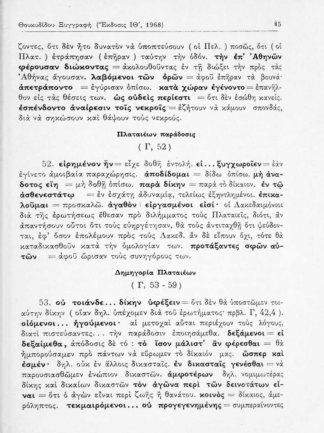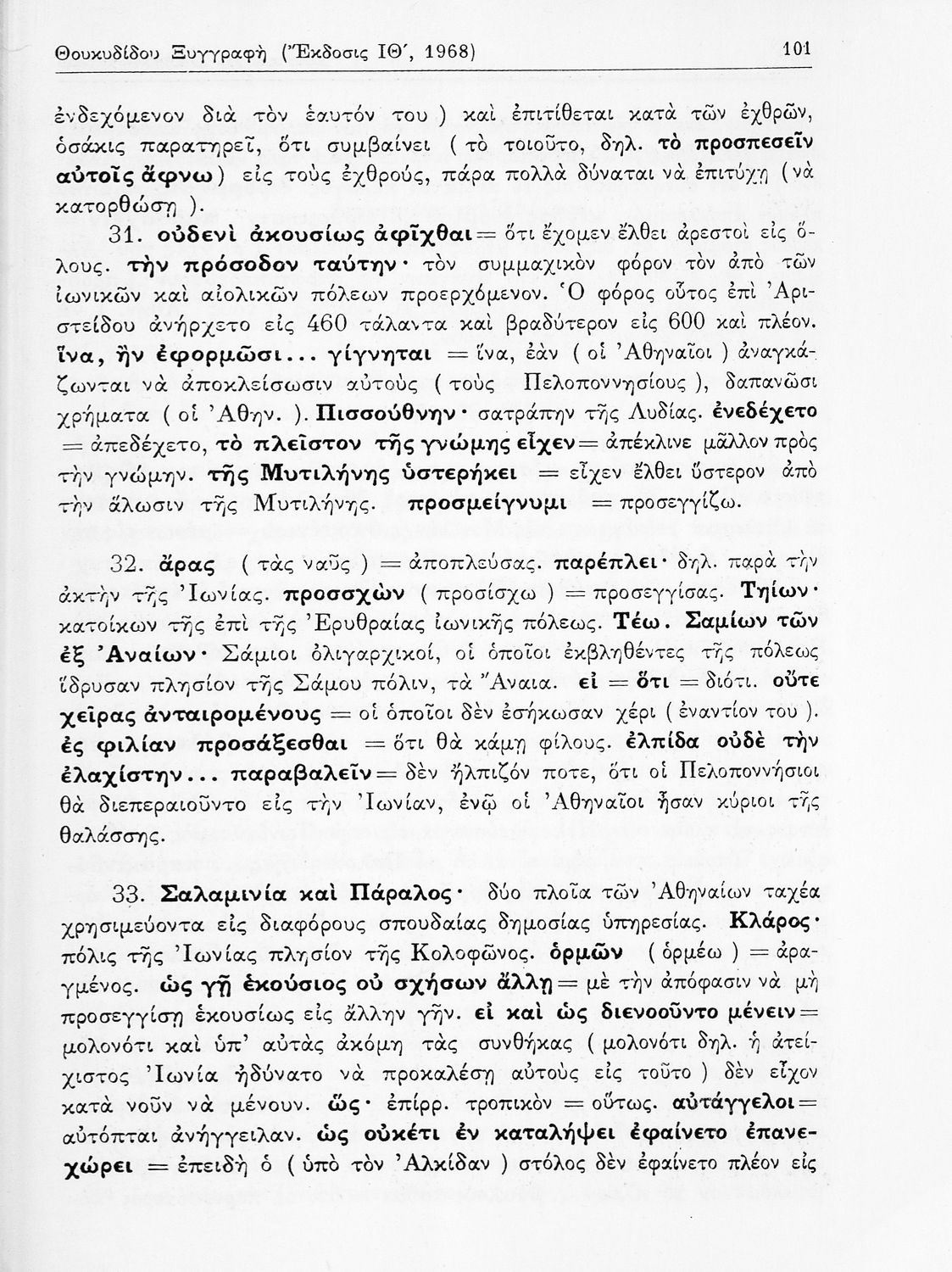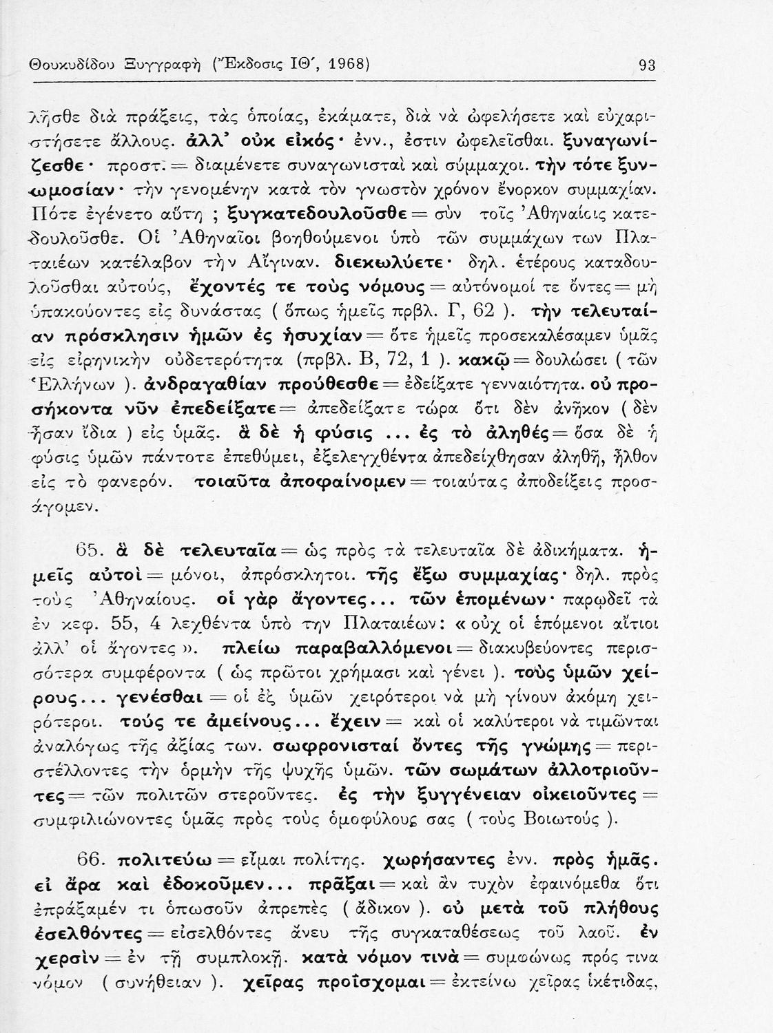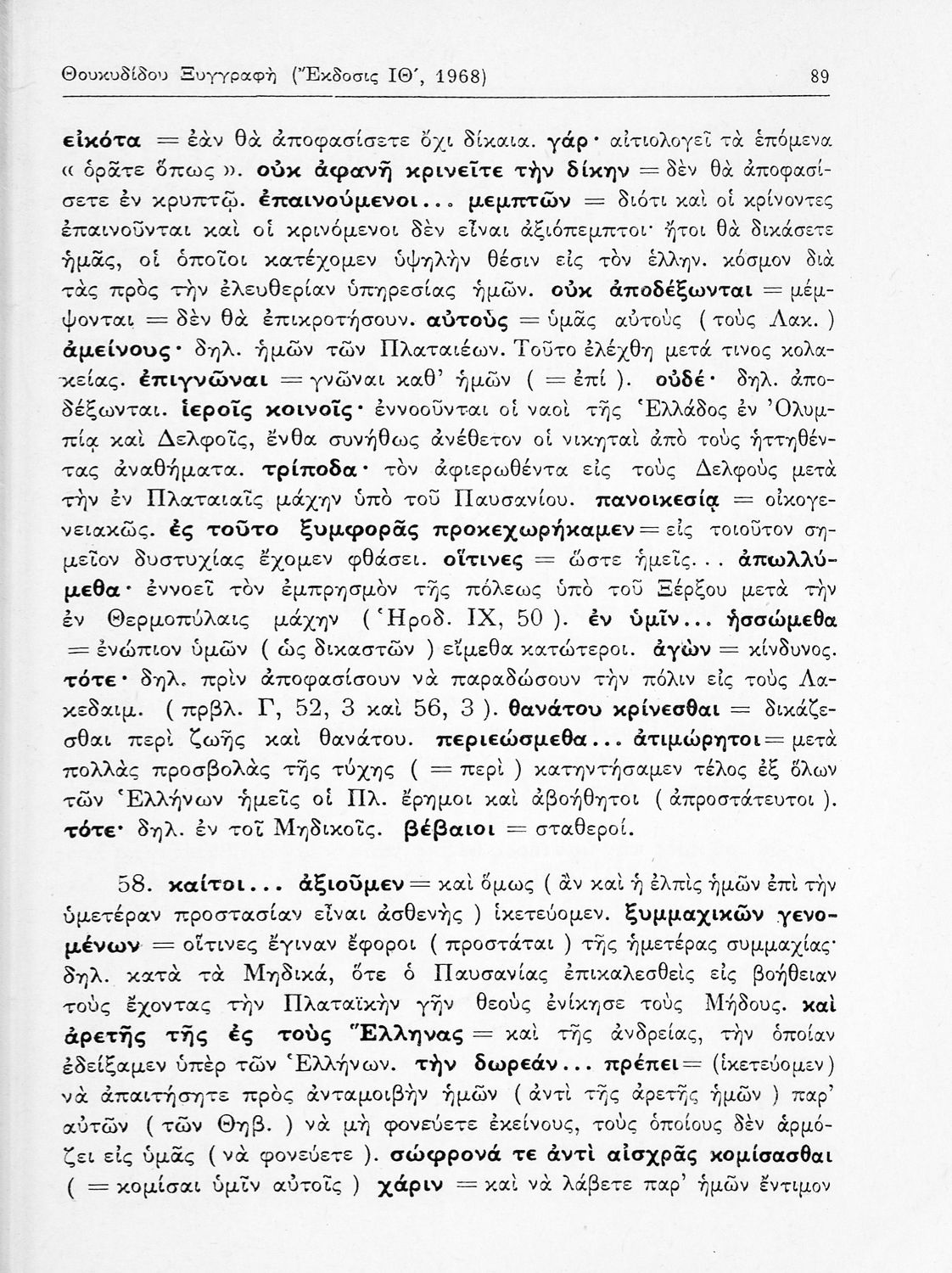 Παρουσίαση περιεχομένου: Σχολικό εγχειρίδιο Αρχαίων Ελληνικών Γυμνασίου που περιέχει εισαγωγή στη ζωή και το έργο του Θουκυδίδη, αποσπάσματα από τα Πλαταιϊκά, τα Λεσβιακά και τον Επιτάφιο του Περικλή και ερμηνευτικές σημειώσεις. Φέρει το σύμβολο της δικτατορίας.