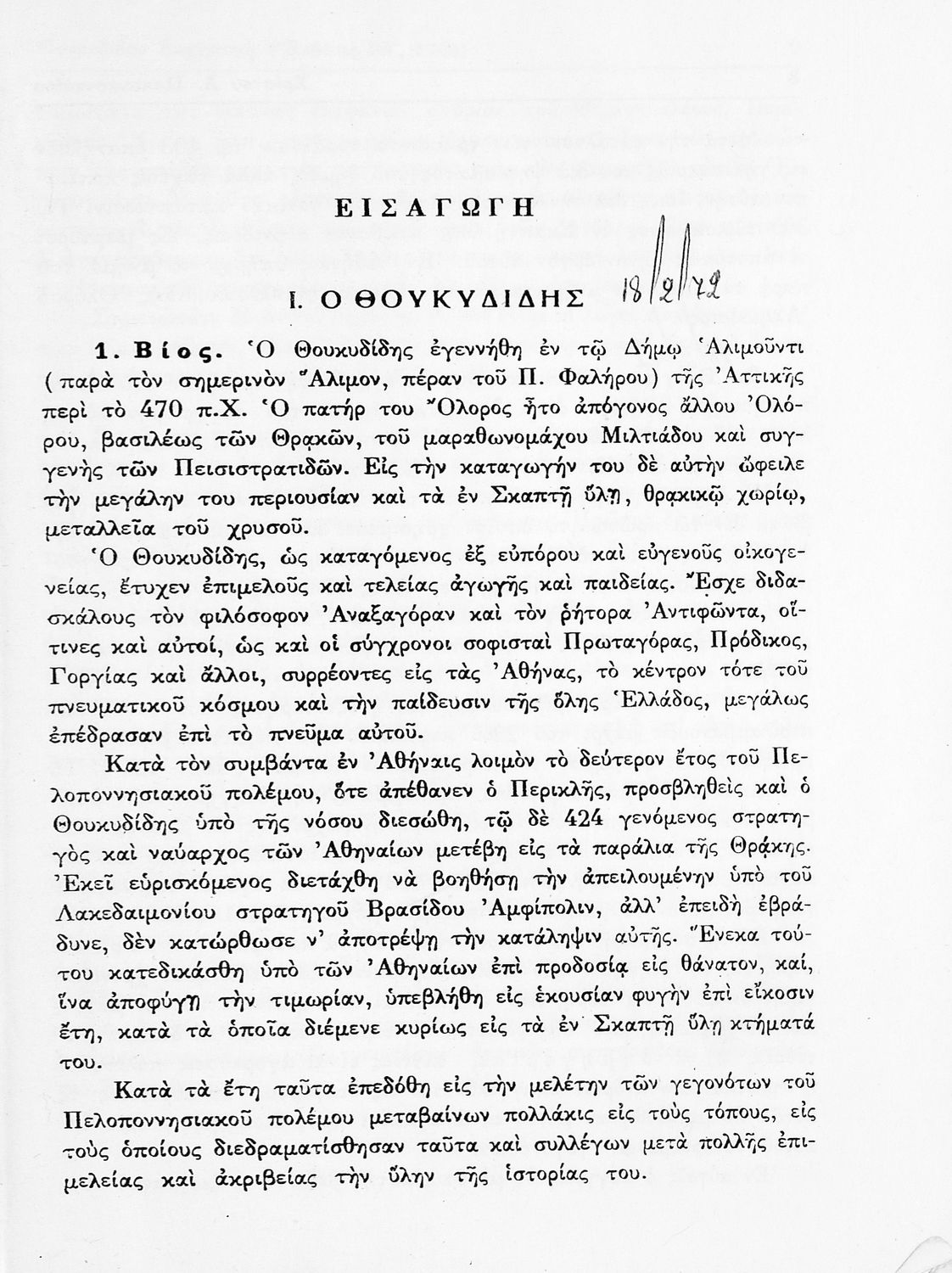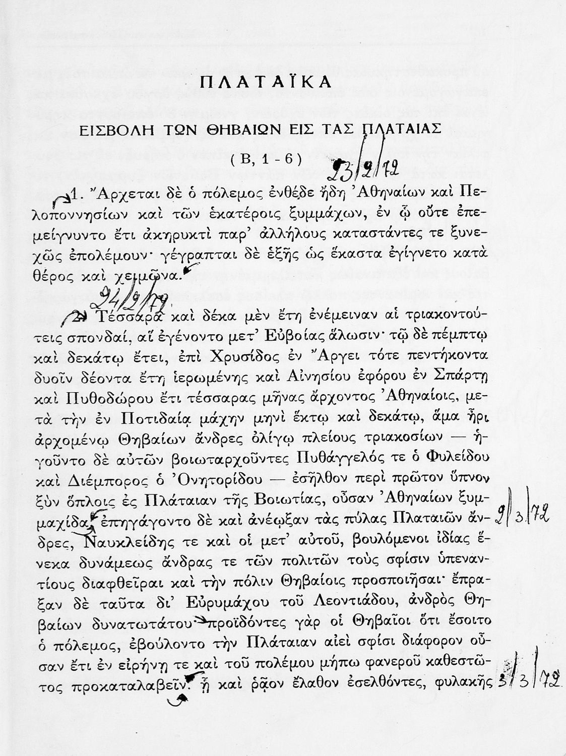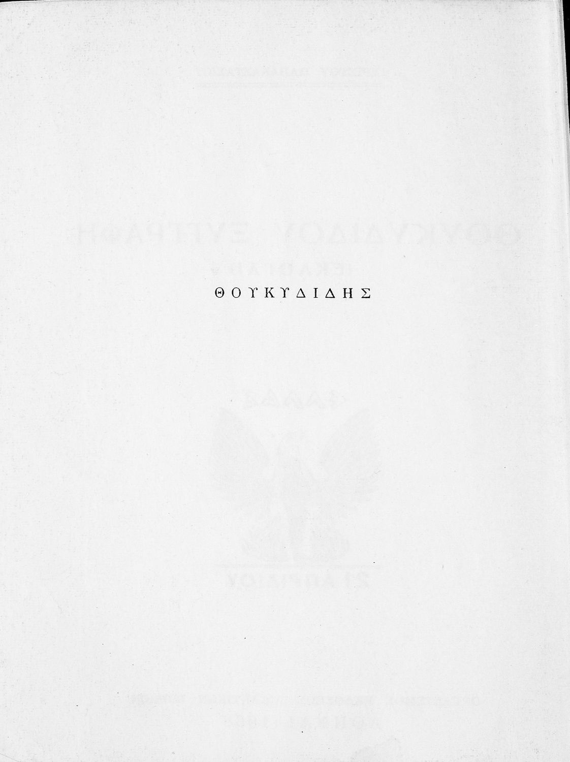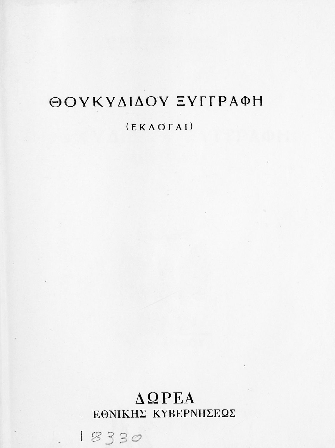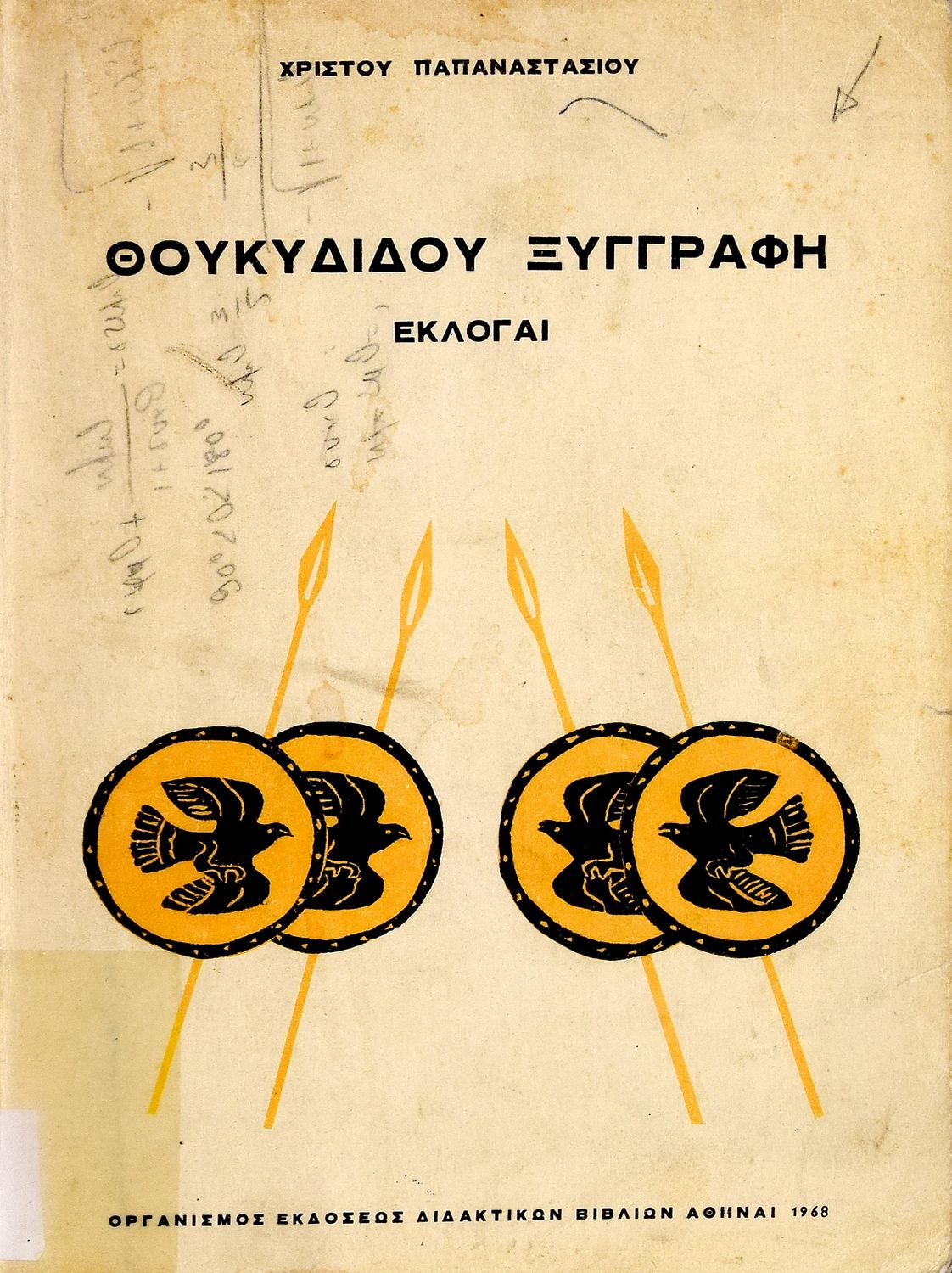 Σχολικό εγχειρίδιο Αρχαίων Ελληνικών Γυμνασίου που περιέχει εισαγωγή στη ζωή και το έργο του Θουκυδίδη, αποσπάσματα από τα Πλαταιϊκά, τα Λεσβιακά και τον Επιτάφιο του Περικλή και ερμηνευτικές σημειώσεις. Φέρει το σύμβολο της δικτατορίας.