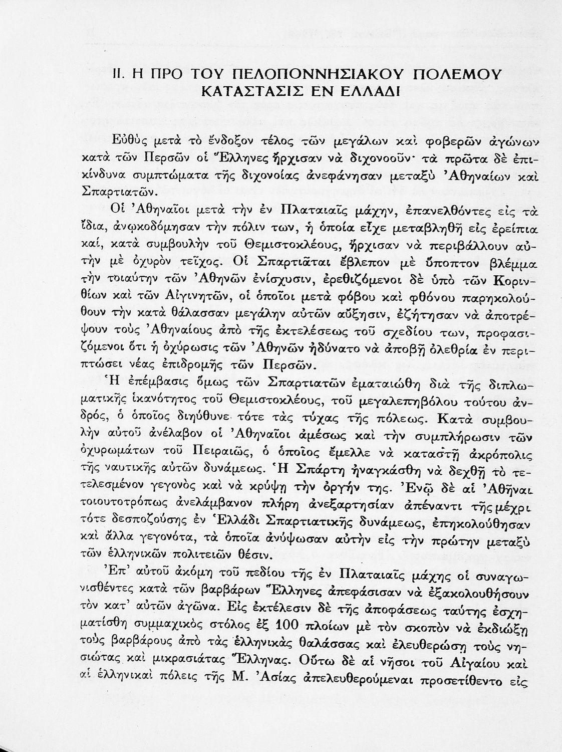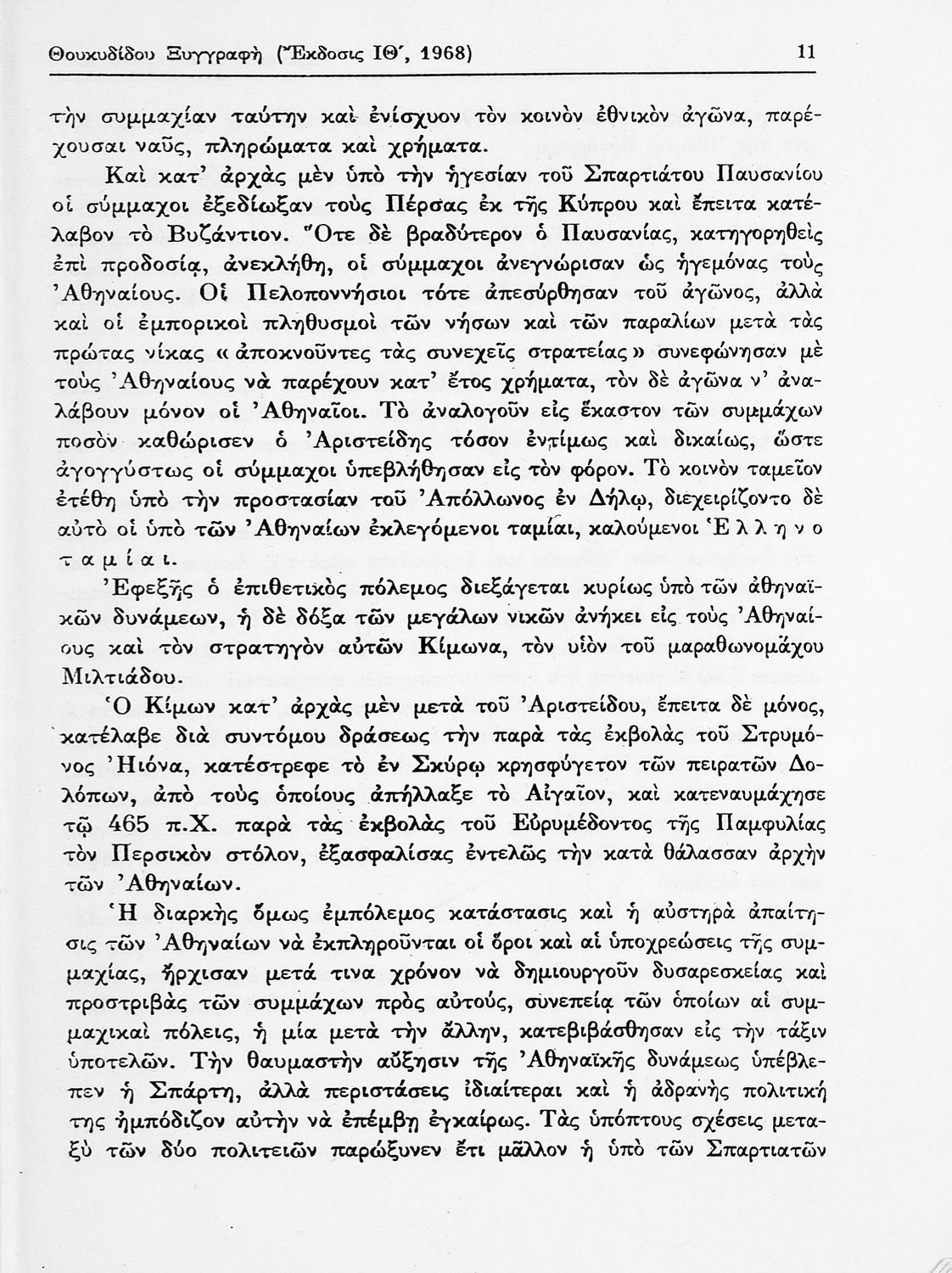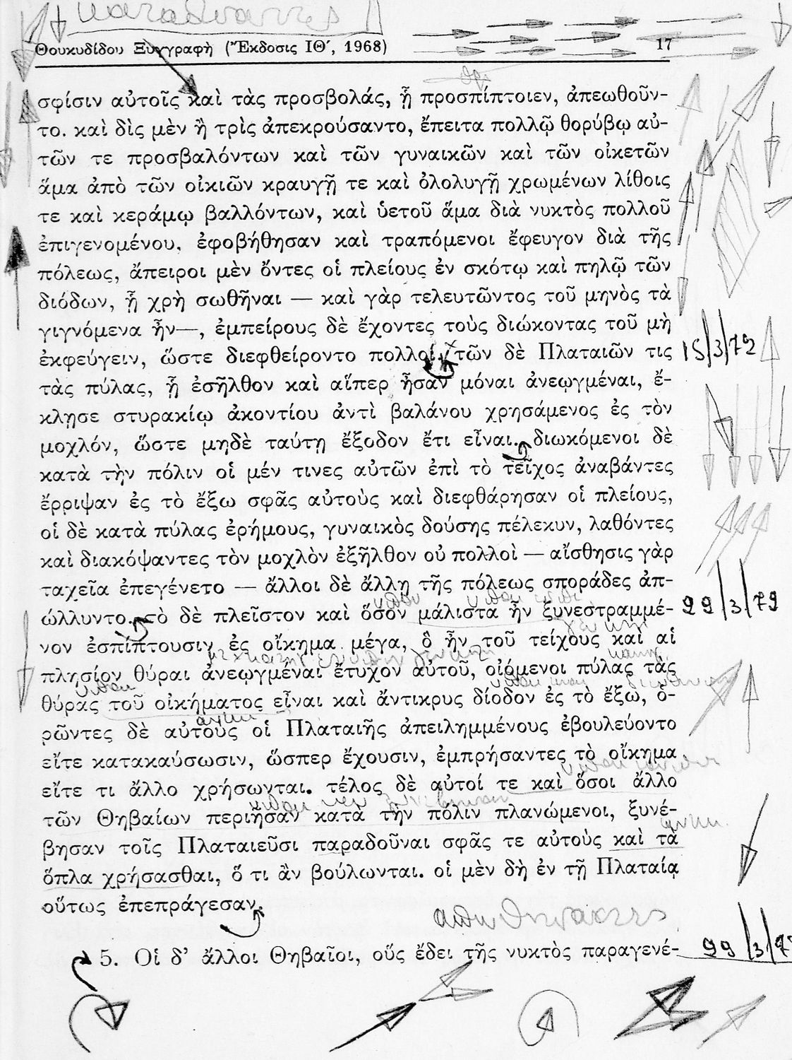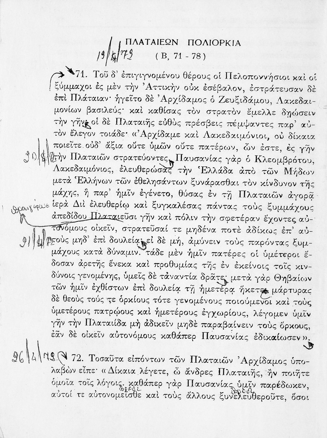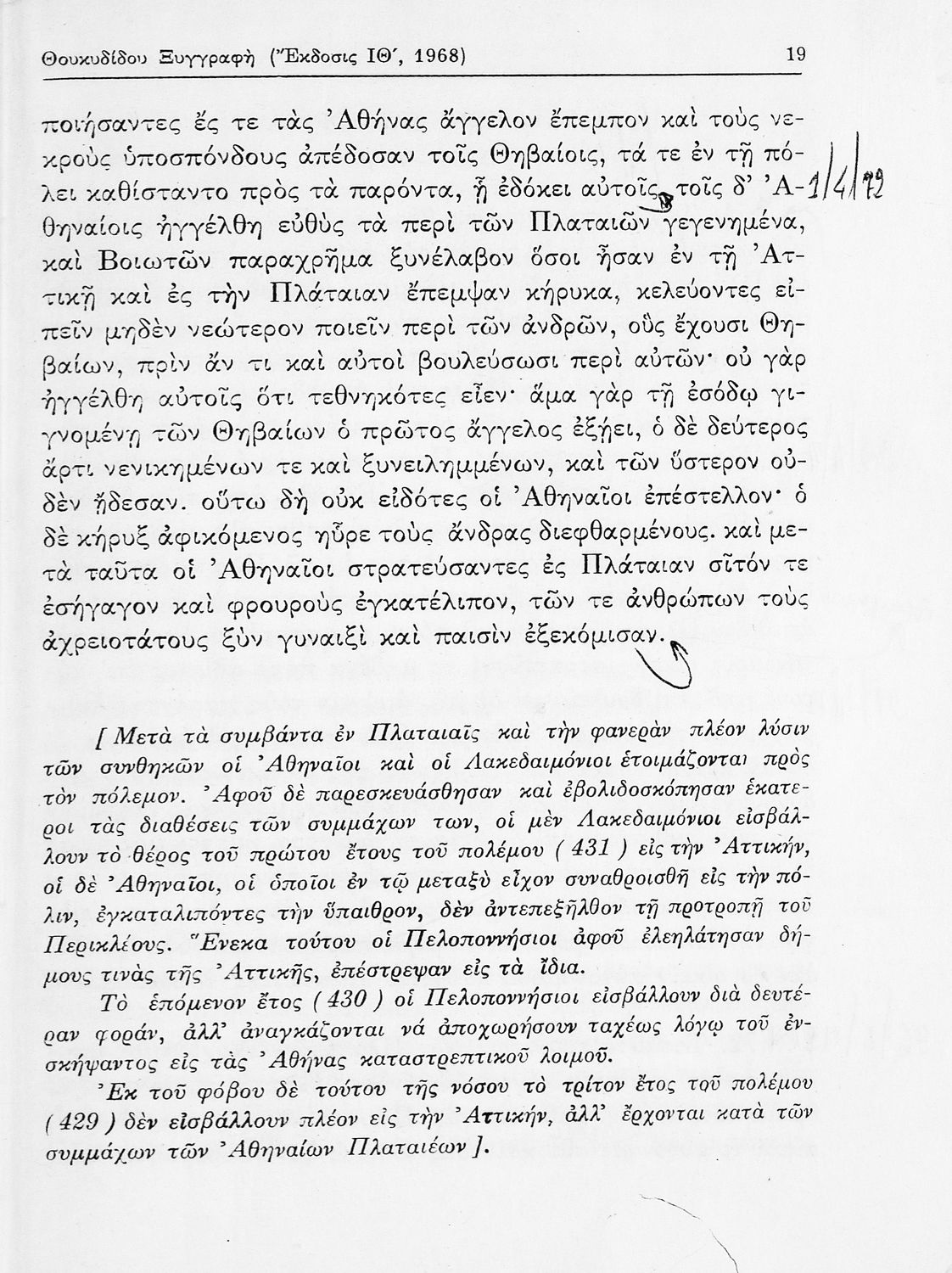 Σχολικό εγχειρίδιο Αρχαίων Ελληνικών Γυμνασίου που περιέχει εισαγωγή στη ζωή και το έργο του Θουκυδίδη, αποσπάσματα από τα Πλαταιϊκά, τα Λεσβιακά και τον Επιτάφιο του Περικλή και ερμηνευτικές σημειώσεις. Φέρει το σύμβολο της δικτατορίας.